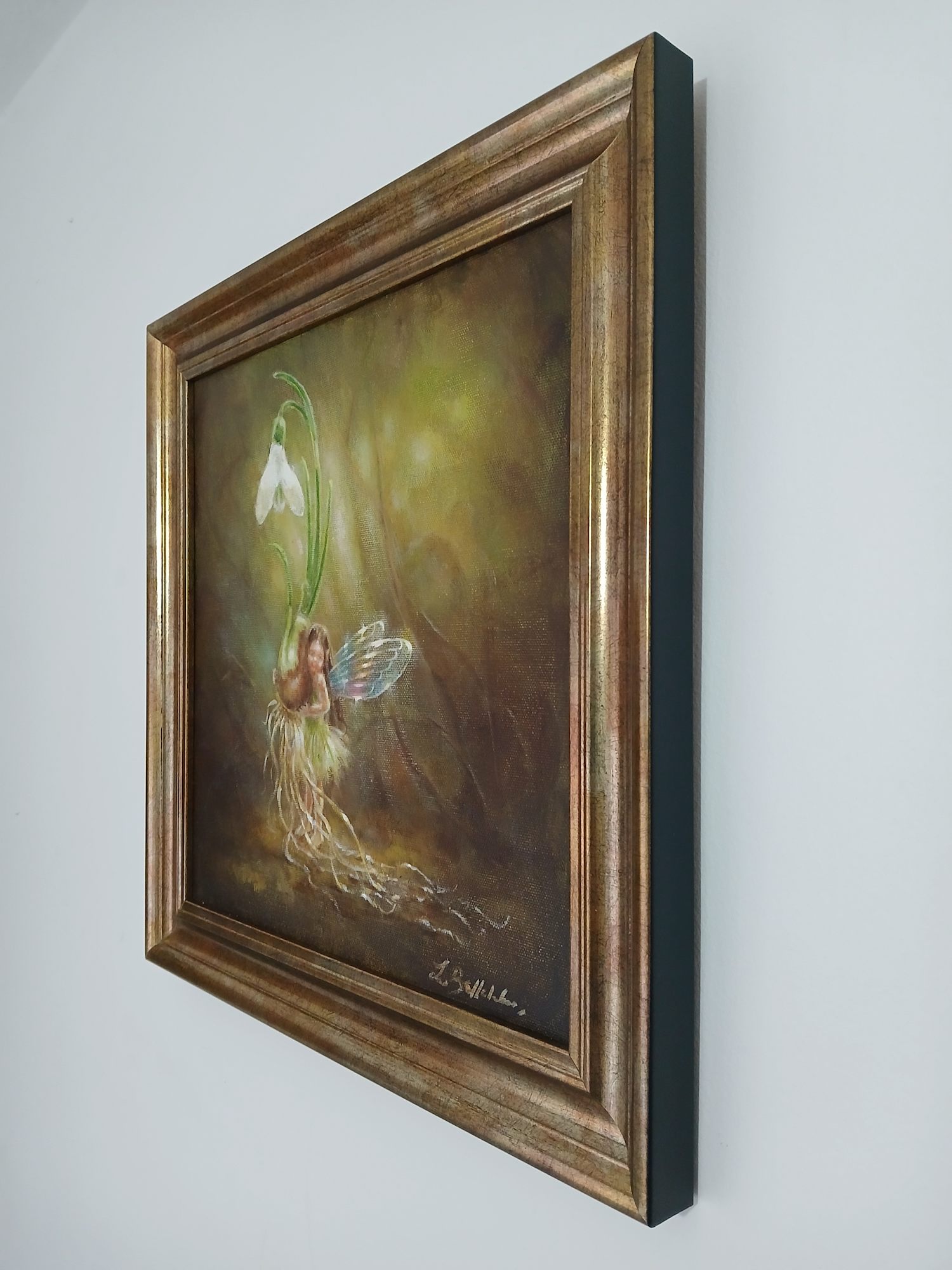 A young fairy loves a snowdrop flower so much she uproots it to take with her
