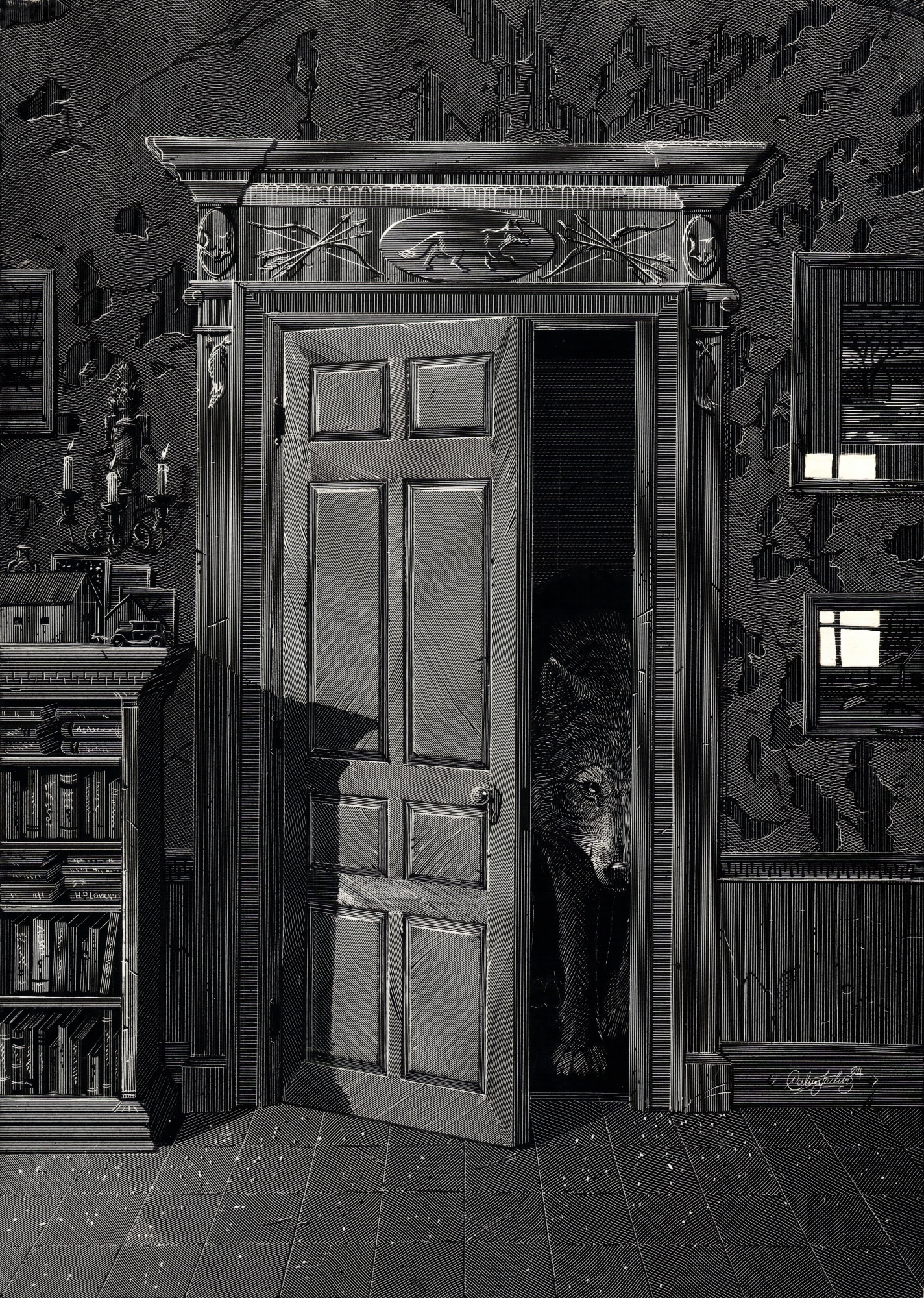 Wolf watches through the gap in a door left ajar, artwork hangs on the wall, and a bookshelf flanks the left side. The wallpaper is peeling.
