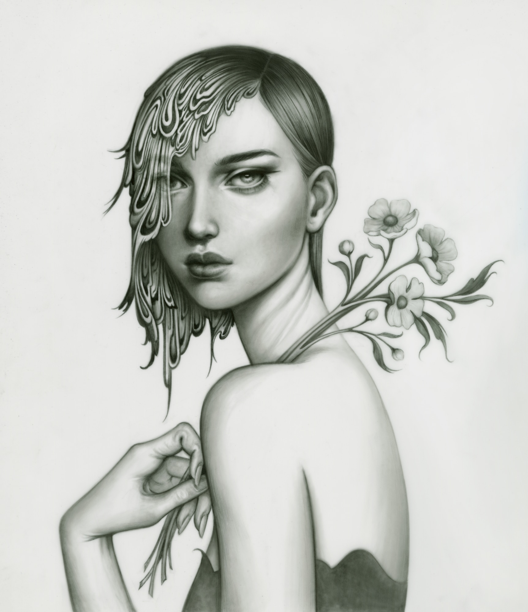 A study in texture, form, and the various ways in which we might veil ourselves: one eye sees the truth, while one is shrouded in an organic, otherworldly shape.