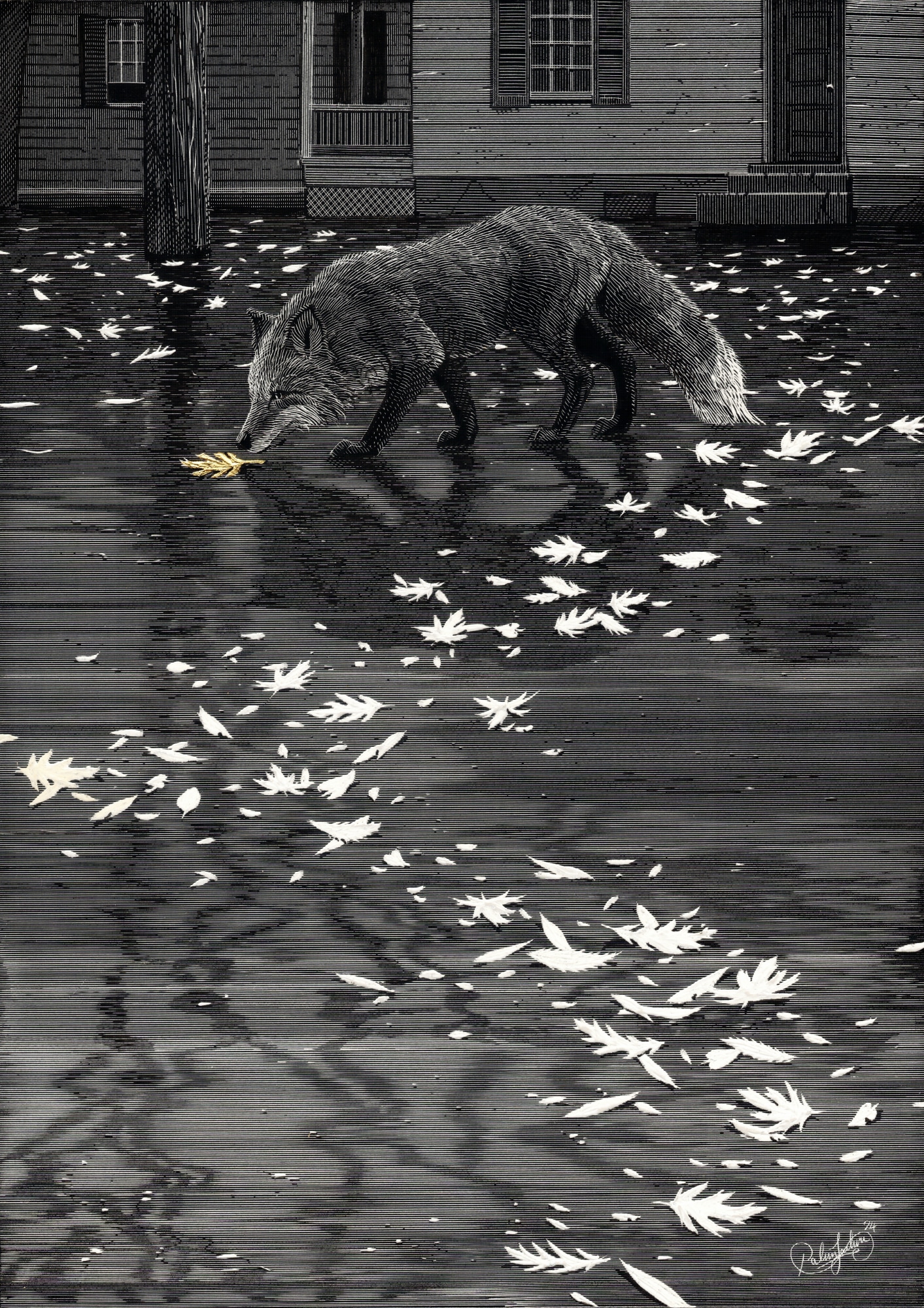 - Subject Matter: Landscape, Fox, Gold Leaf, Water reflection
