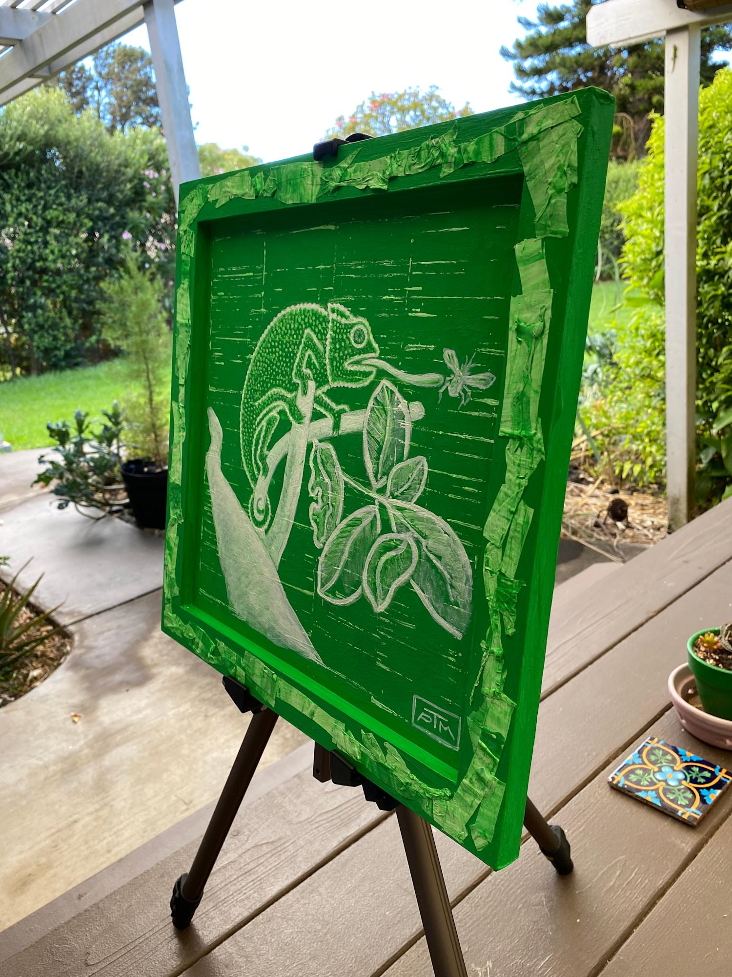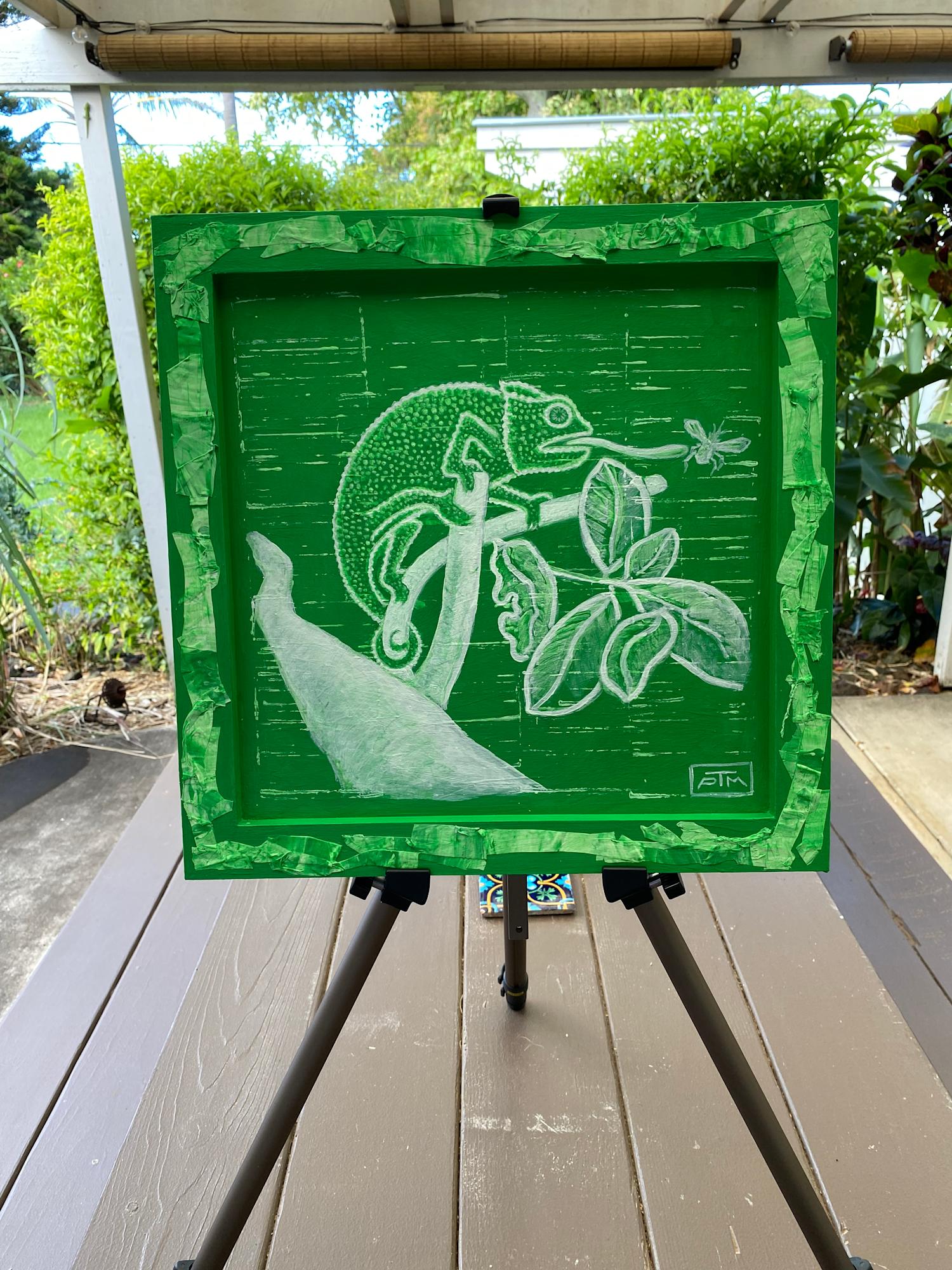 A Jackson’s chameleon in a monochromatic green environment attempts to snare a flying insect from an arboreal perch. Acrylic “skins” adorn the frame and represent the textured foliage and light variegation of a forest canopy.