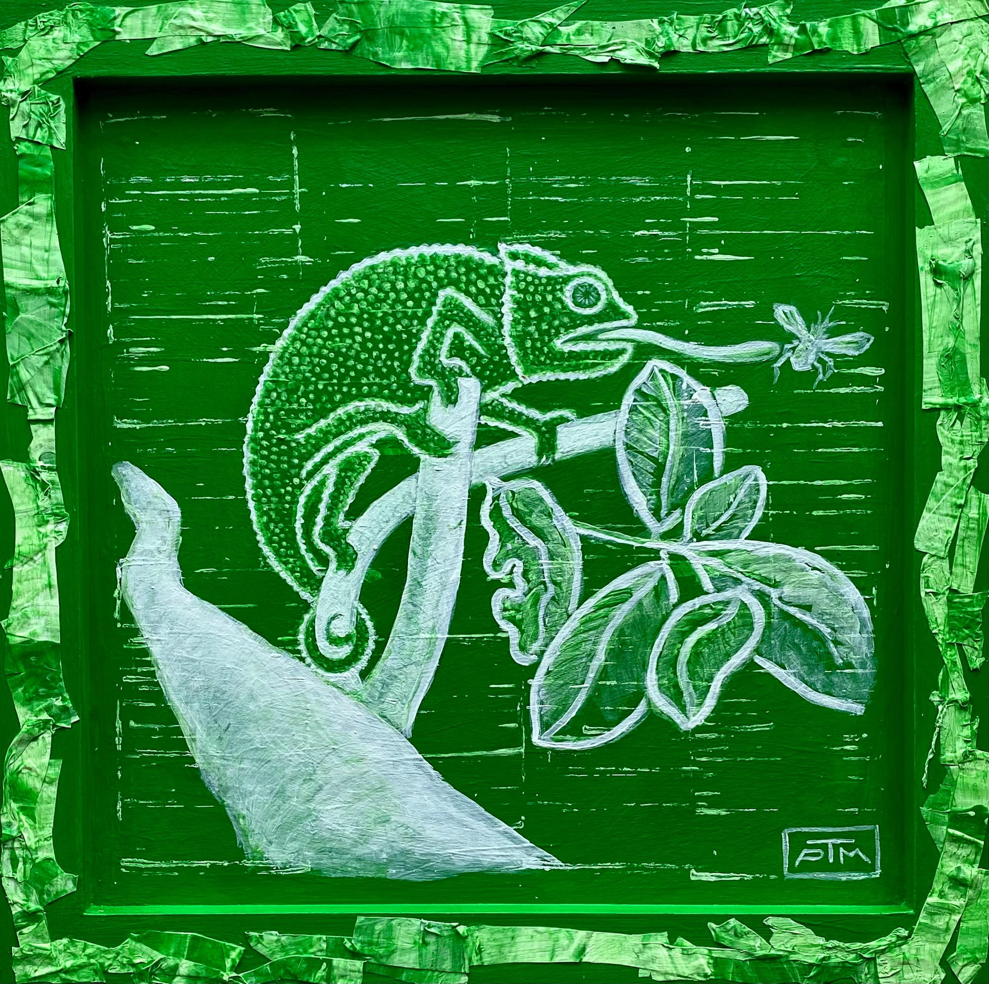 A Jackson’s chameleon in a monochromatic green environment attempts to snare a flying insect from an arboreal perch. Acrylic “skins” adorn the frame and represent the textured foliage and light variegation of a forest canopy.