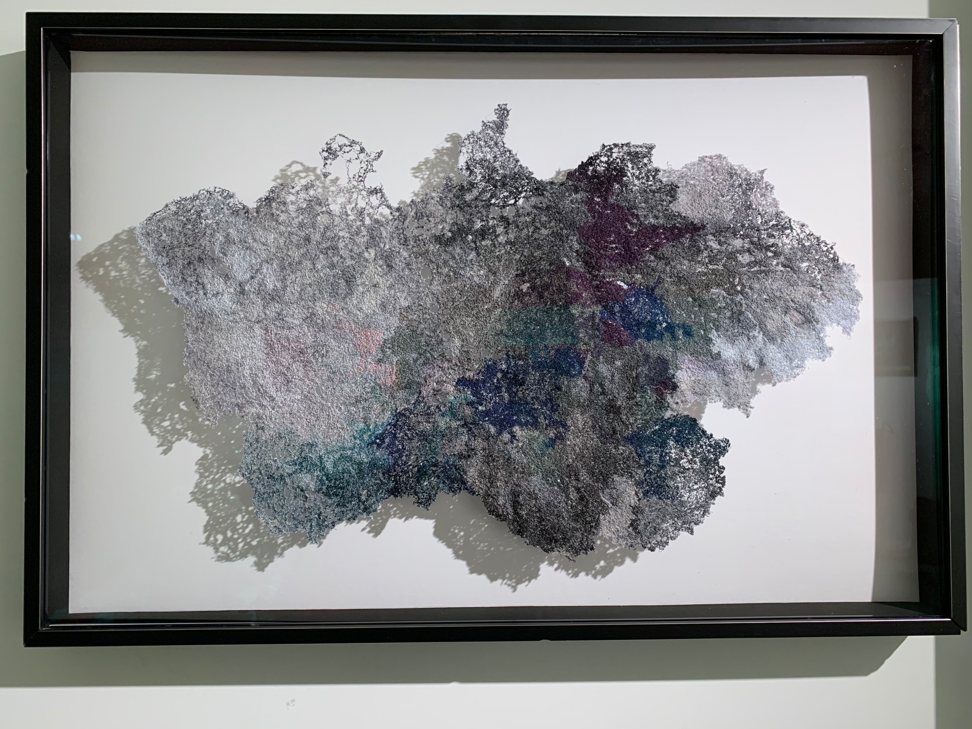 A suspended thread sculpture exploring shadow, transparency, and negative space. Created entirely from free-motion stitched rayon embroidery thread, it shifts with the light, casting dimensional shadows that change throughout the day. Exhibited internationally in South Korea, Canada, Japan, and Ukraine, this foundational work remains in the artist’s personal collection.