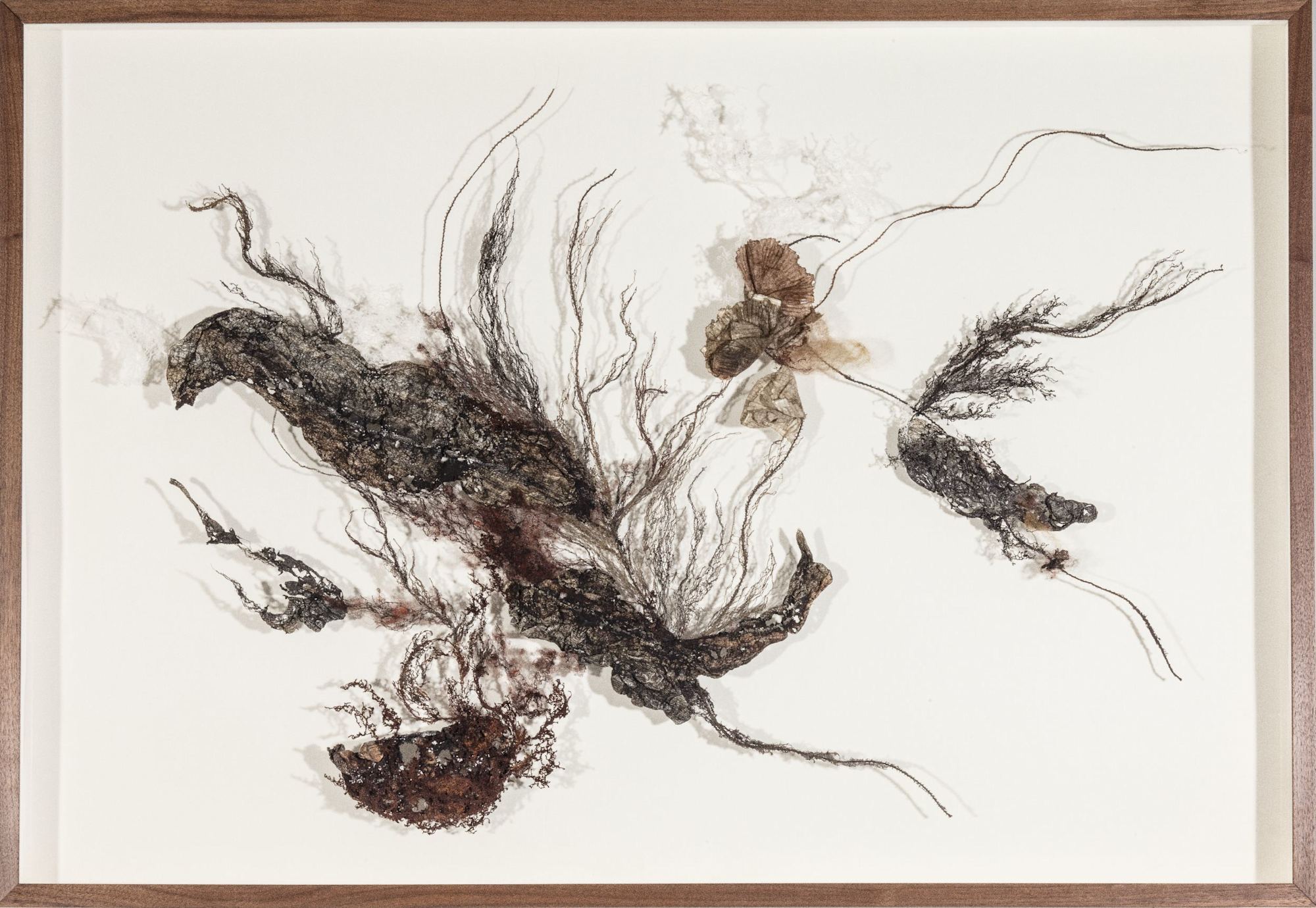 In A Barkly Manner is a mixed-media botanical artwork made from rayon and silk embroidery threads and repurposed materials such as fabric Tyvek, jute, dryer lint, and Keurig coffee filters. Framed between two panels of museum glass, the piece appears to float in midair, casting shifting shadows that evoke forest growth, decay, and renewal.