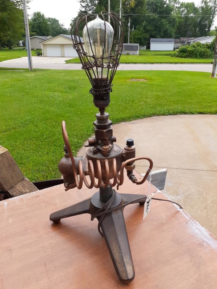 1914 "Hit and Miss" boat motor carburetor forms the main assembly of this small desk lamp. Also features a flag stand base and copper coil and caged light bulb.