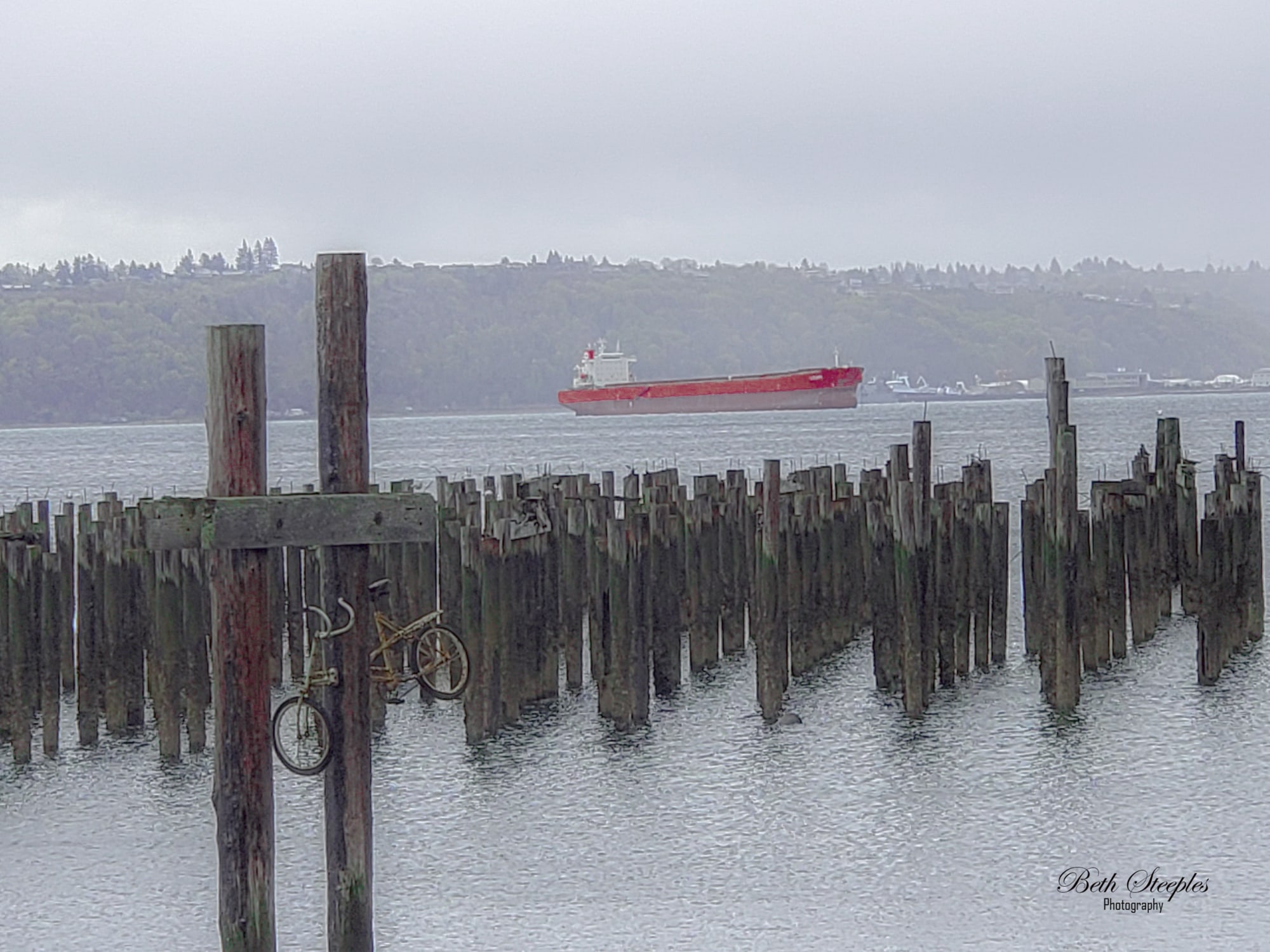 Foggy Old Tacoma Waterfront. Old pier post with red ship in background.