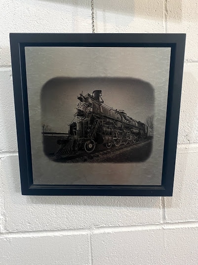 An unusual metal print of a big steam engine.