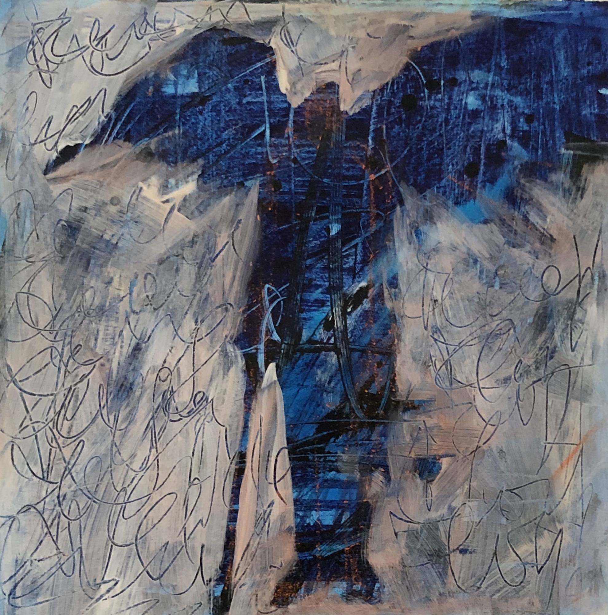 When George Floyd was killed on 25 May 2020 by Minneapolis police officer Derek Chauvin, I was moved to create art that reflected my stormy emotions. I discovered that St Michael was the patron saint of police officers and that got me thinking… What would Michael be feeling about what happened? And I guessed he’d be weeping. And so I began a painting journey exploring this idea. This painting is the first in the series.