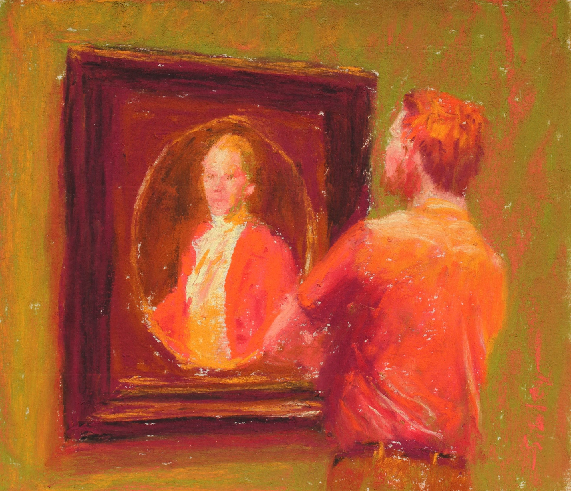 I was caught by the way the viewer and the subject of the painting connected – they could be distant relatives! To emphasize that, I chose to use the red from the painting as the dominant colour, bringing it into the clothing and hair of the viewer, thereby visually connecting both men. The original painting, “Portrait of Philip Livingston,“ is by Pompeo Batoni and is located in the Utah Museum of Fine Arts, Salt Lake City.