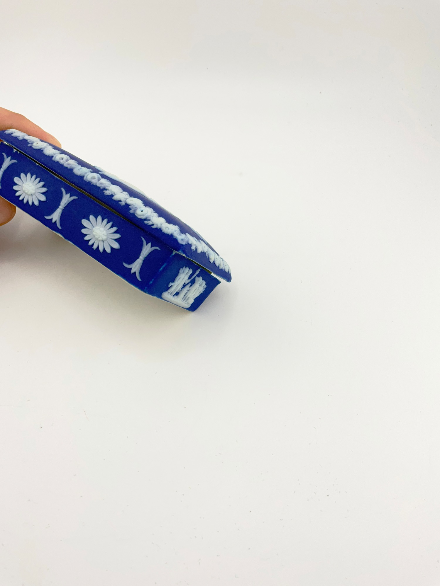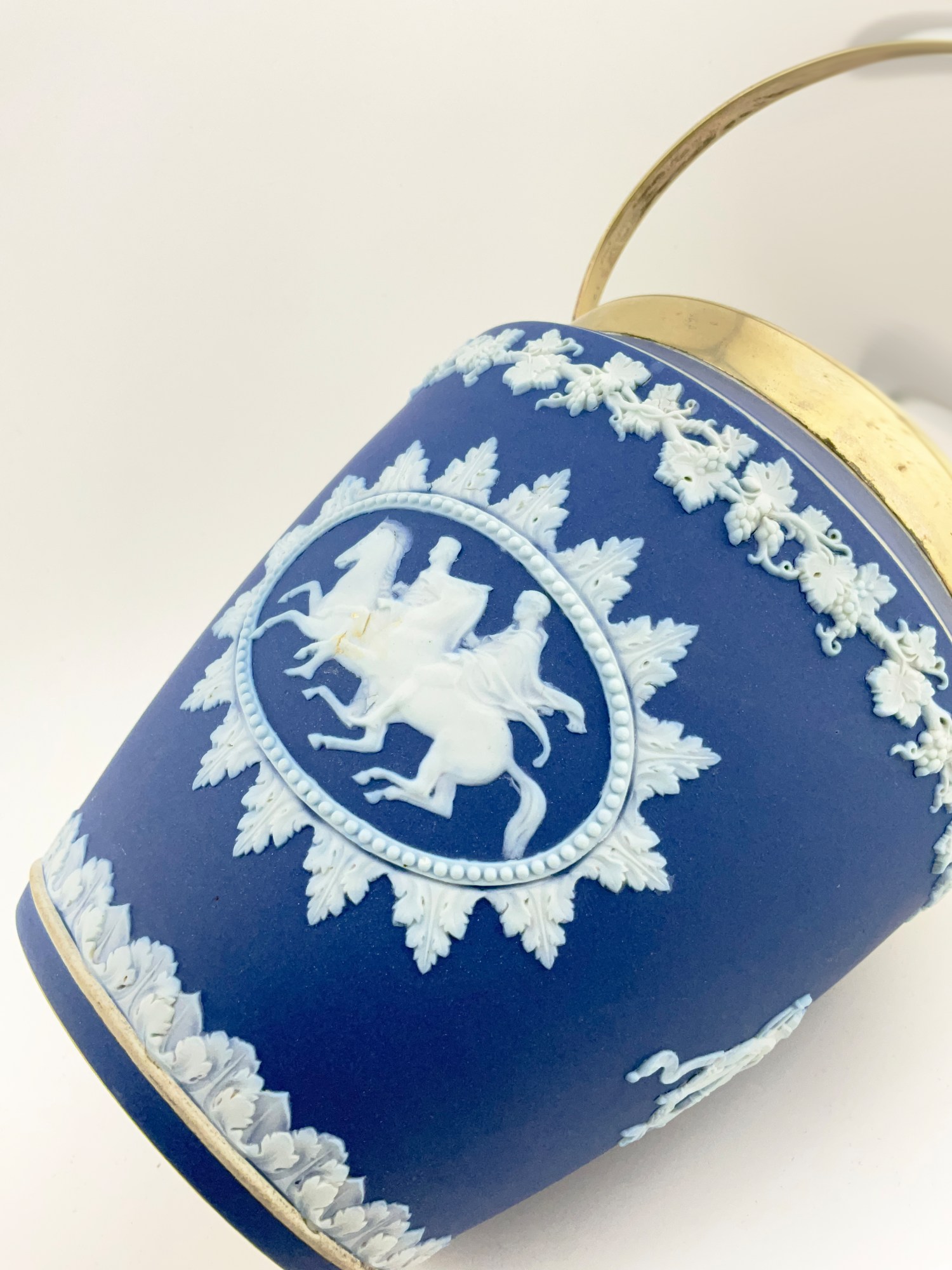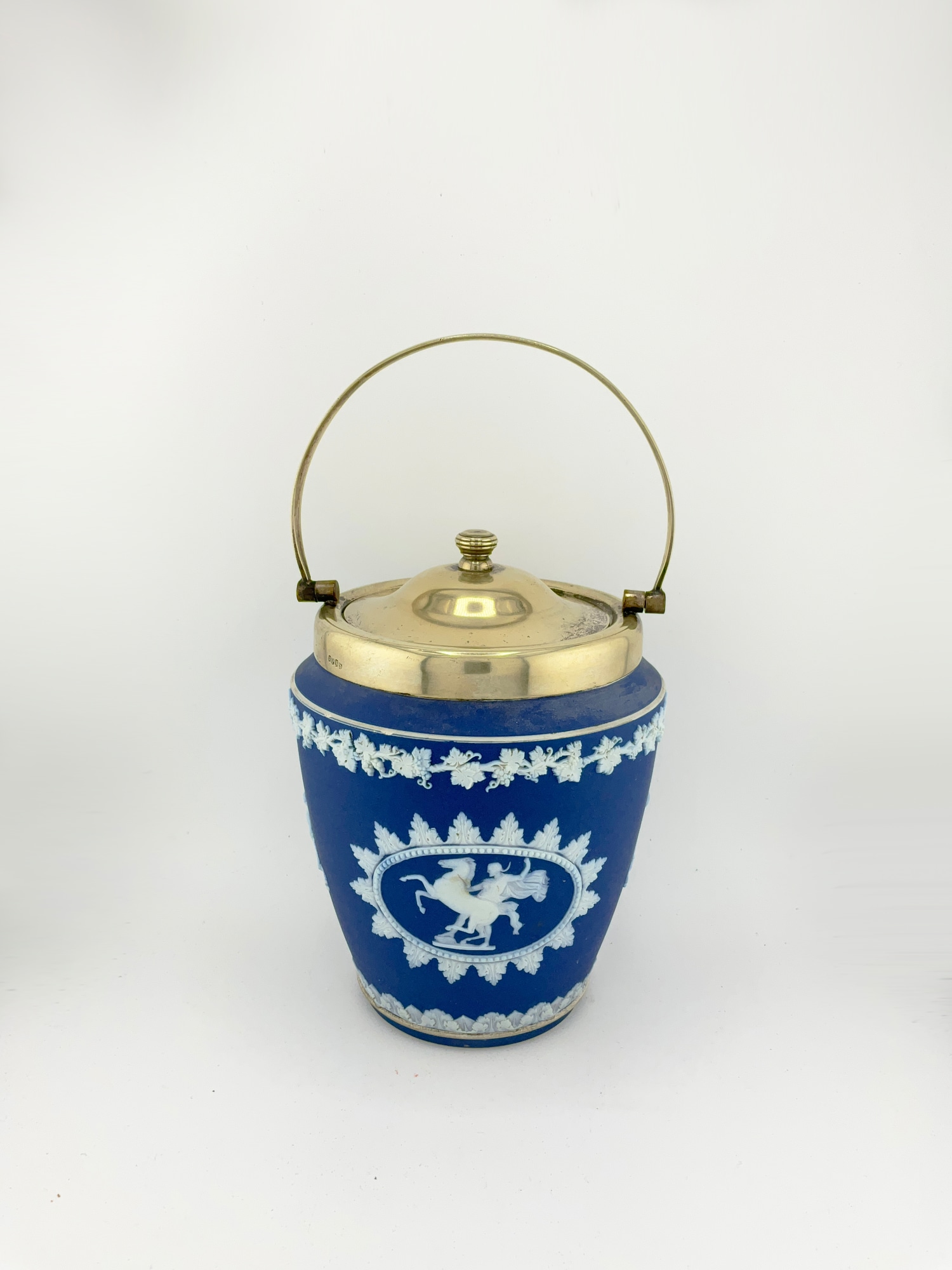 This antique Wedgwood cobalt blue jasperware set is a beautiful addition to any collection. The set includes a biscuit jar, match box, and a tinker box in the shape of a heart, all of which are handcrafted with intricate details and a matte finish. The blue and white pottery production style adds a touch of elegance to any room, and the removable lids and handles make these decorative boxes both functional and stylish. Crafted in England during the late 19th century, these original Wedgwood pieces are a rare find. Each ceramic piece is incised with the “Wedgwood England” stamp on the base. The Biscuit Jar measures 5 inches in diameter and 7.5 inches in height. The match box measures 4in x 2in x 1.5in. The heart box measures 3.5in x 2.75in x 1.25in. These boxes are the perfect size for storing small items or simply displaying on a shelf. Add a touch of history and charm to your home with this stunning antique set.