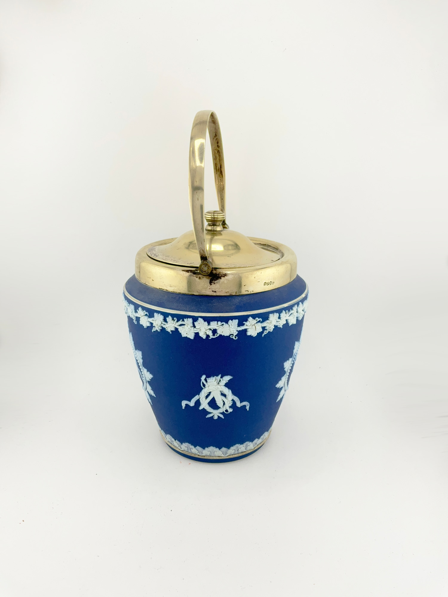 ANTIQUE WEDGWOOD COBALT BLUE AND WHITE JASPERWARE SET INCLUDING A BISCUIT JAR, MATCH BOX AND HEART SHAPED TRINKET BOX (19TH CENTURY)