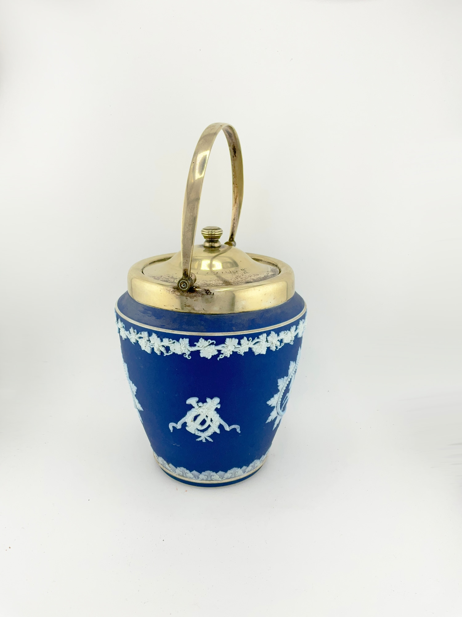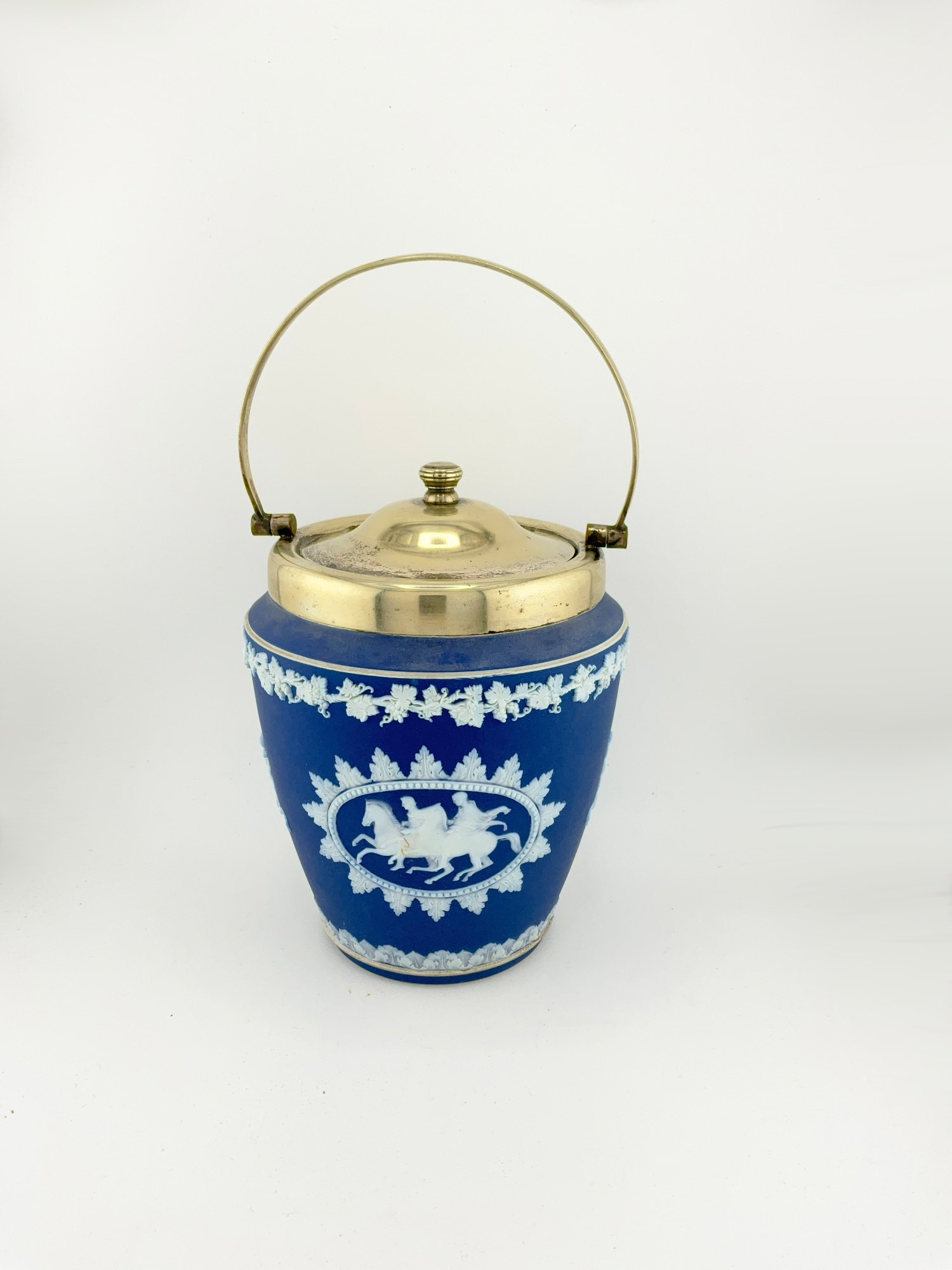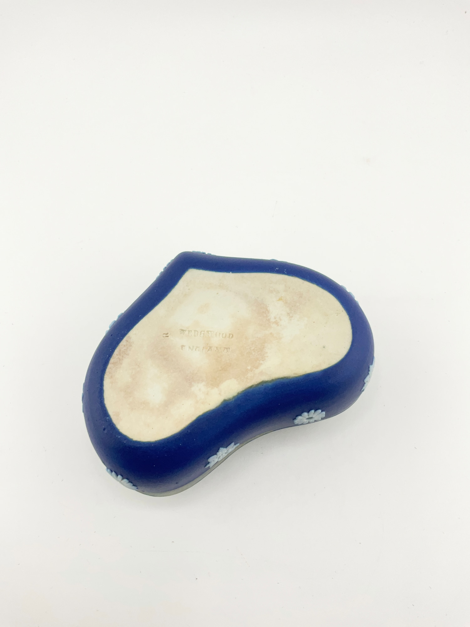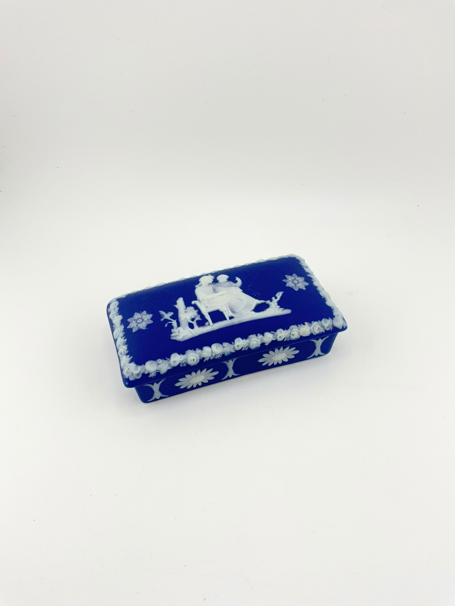 This antique Wedgwood cobalt blue jasperware set is a beautiful addition to any collection. The set includes a biscuit jar, match box, and a tinker box in the shape of a heart, all of which are handcrafted with intricate details and a matte finish. The blue and white pottery production style adds a touch of elegance to any room, and the removable lids and handles make these decorative boxes both functional and stylish. Crafted in England during the late 19th century, these original Wedgwood pieces are a rare find. Each ceramic piece is incised with the “Wedgwood England” stamp on the base. The Biscuit Jar measures 5 inches in diameter and 7.5 inches in height. The match box measures 4in x 2in x 1.5in. The heart box measures 3.5in x 2.75in x 1.25in. These boxes are the perfect size for storing small items or simply displaying on a shelf. Add a touch of history and charm to your home with this stunning antique set.