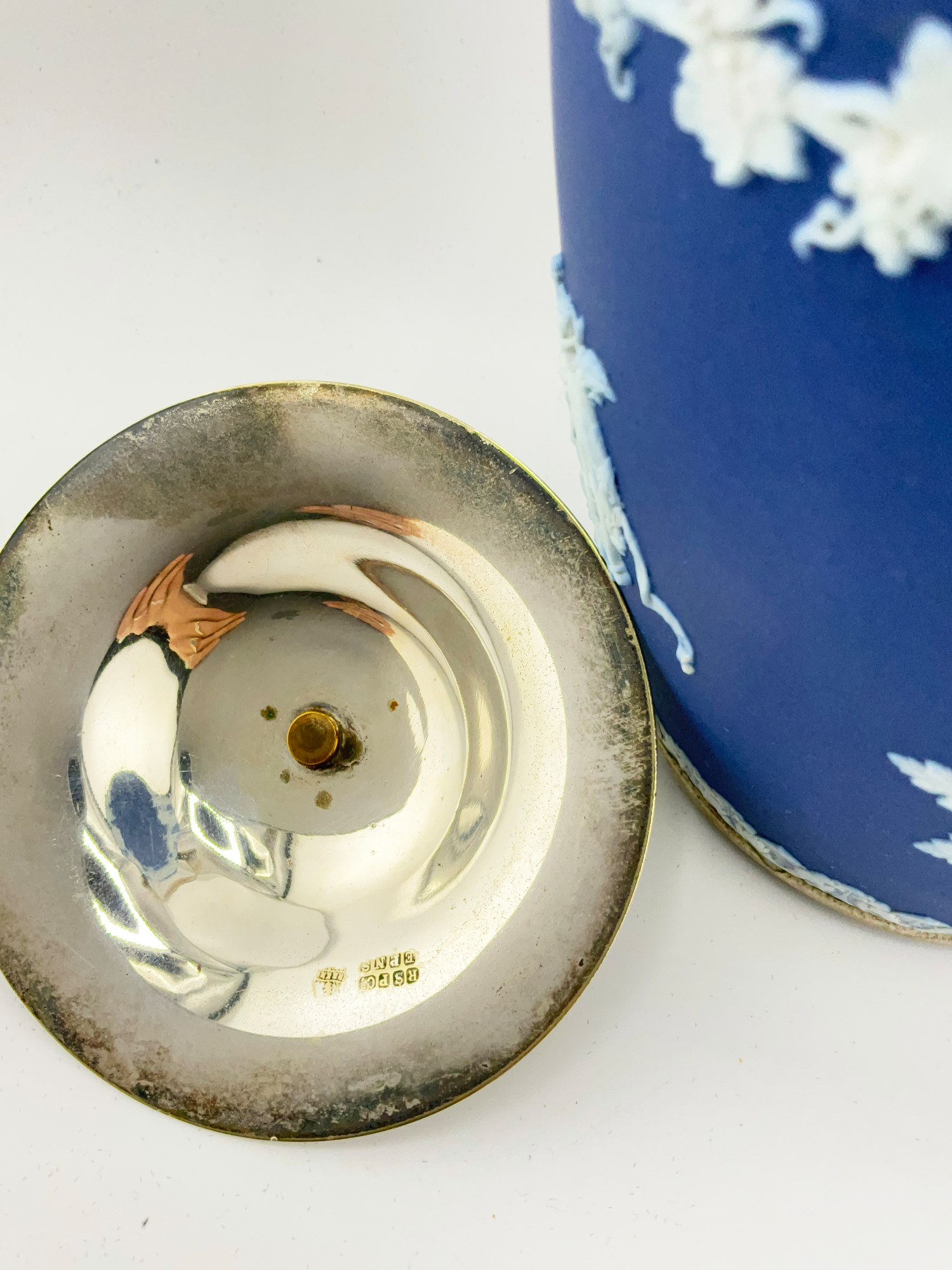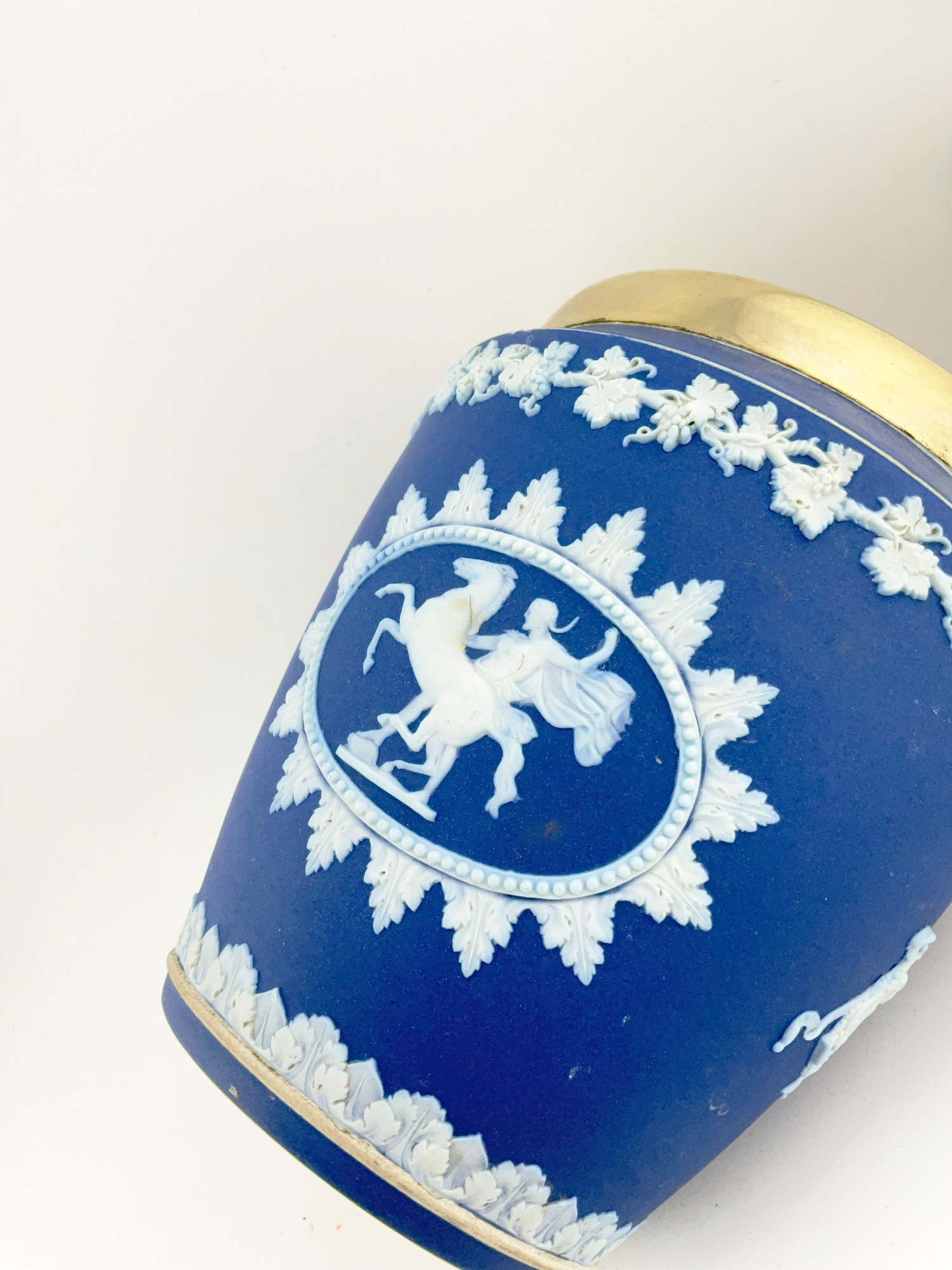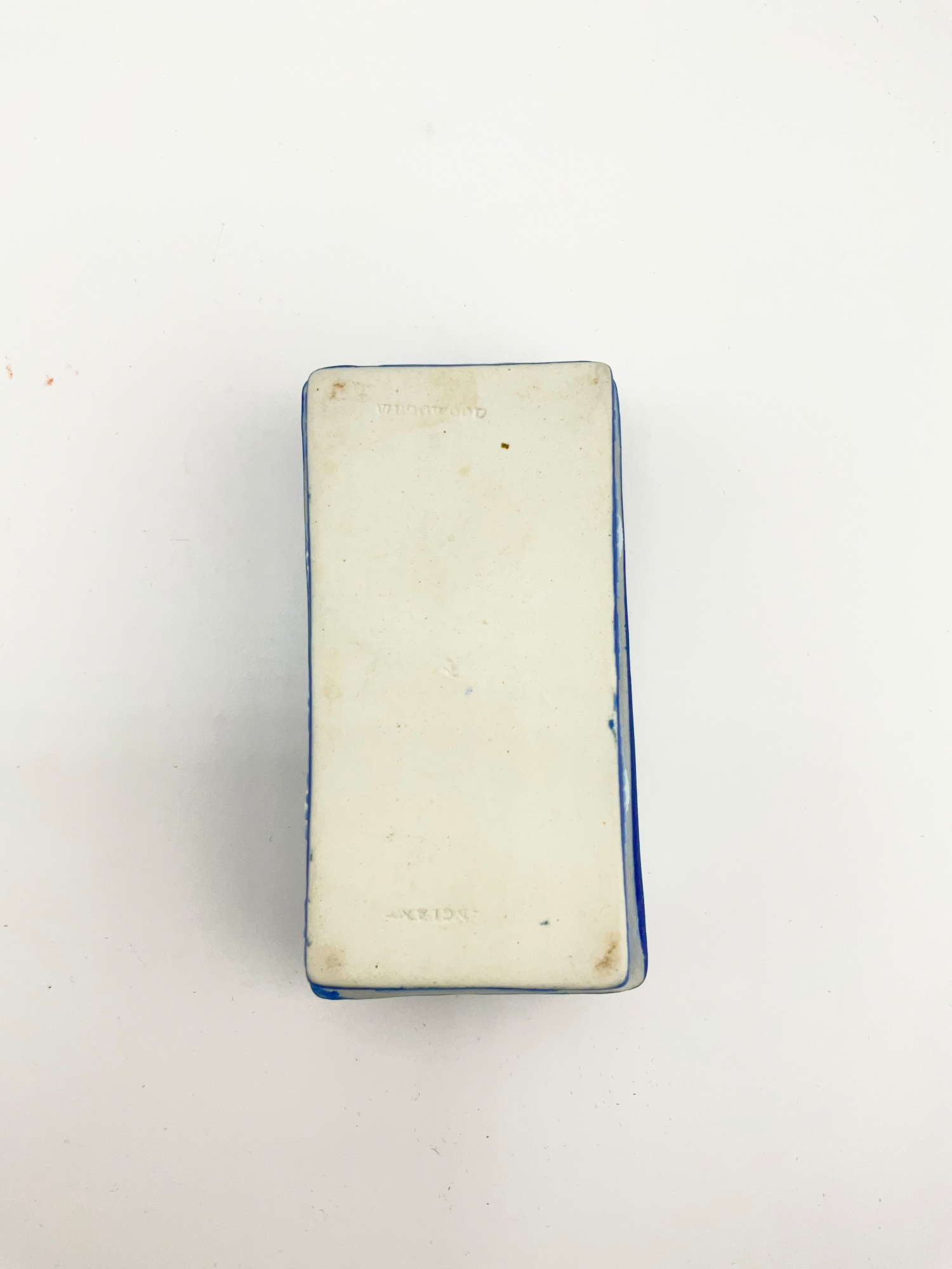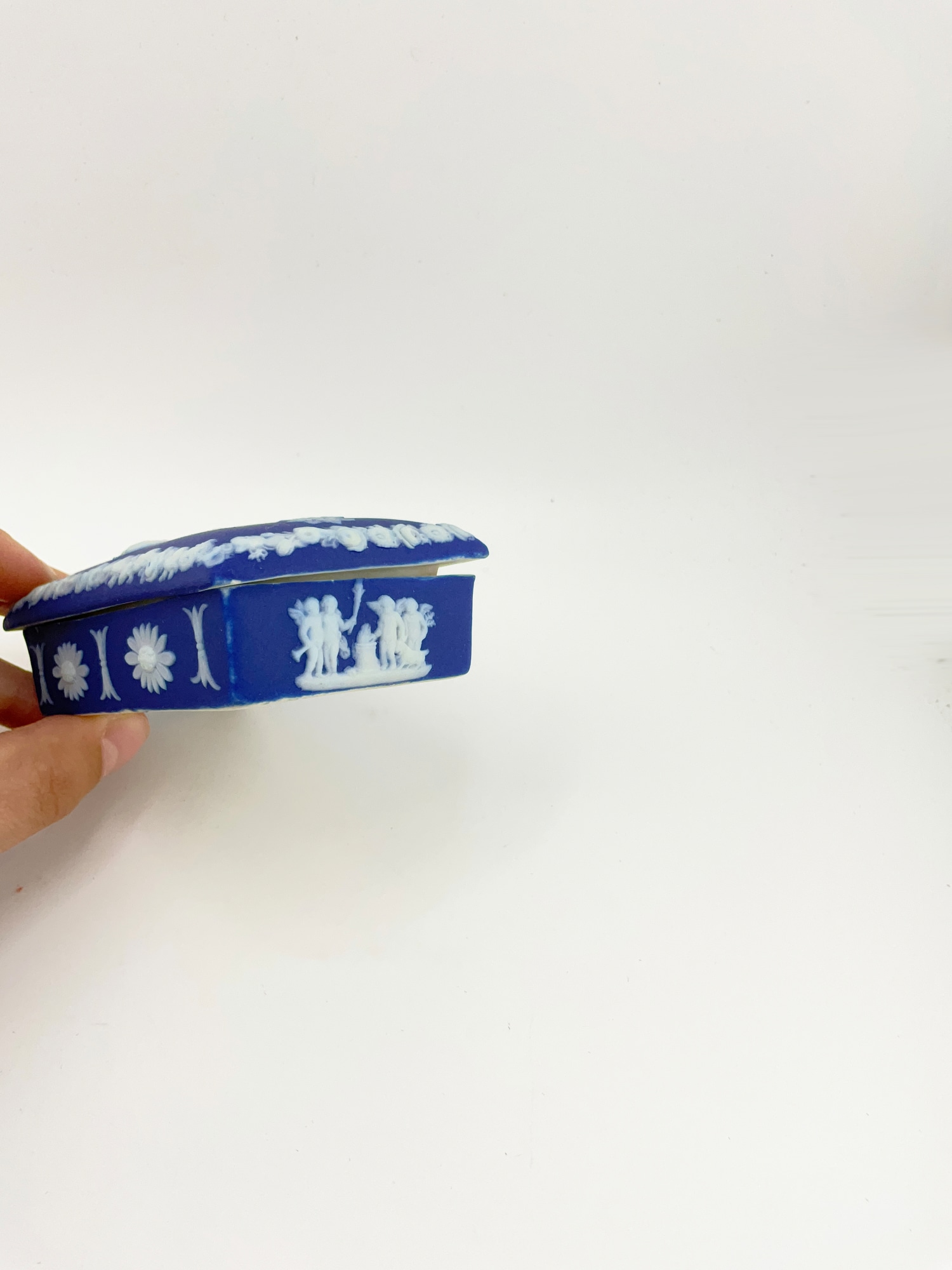 This antique Wedgwood cobalt blue jasperware set is a beautiful addition to any collection. The set includes a biscuit jar, match box, and a tinker box in the shape of a heart, all of which are handcrafted with intricate details and a matte finish. The blue and white pottery production style adds a touch of elegance to any room, and the removable lids and handles make these decorative boxes both functional and stylish. Crafted in England during the late 19th century, these original Wedgwood pieces are a rare find. Each ceramic piece is incised with the “Wedgwood England” stamp on the base. The Biscuit Jar measures 5 inches in diameter and 7.5 inches in height. The match box measures 4in x 2in x 1.5in. The heart box measures 3.5in x 2.75in x 1.25in. These boxes are the perfect size for storing small items or simply displaying on a shelf. Add a touch of history and charm to your home with this stunning antique set.