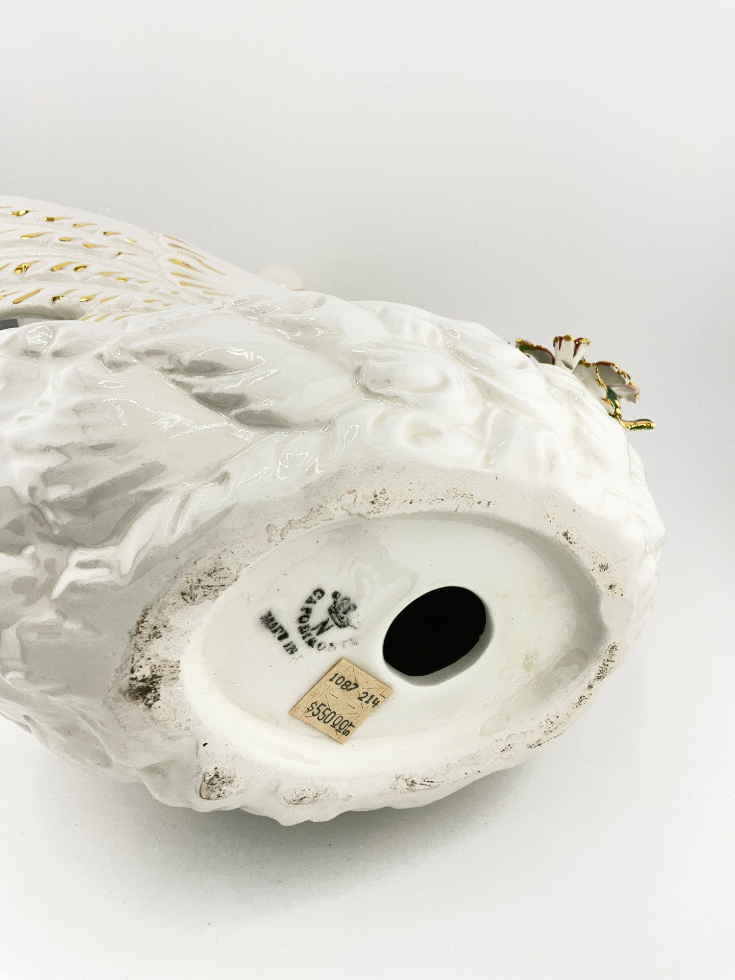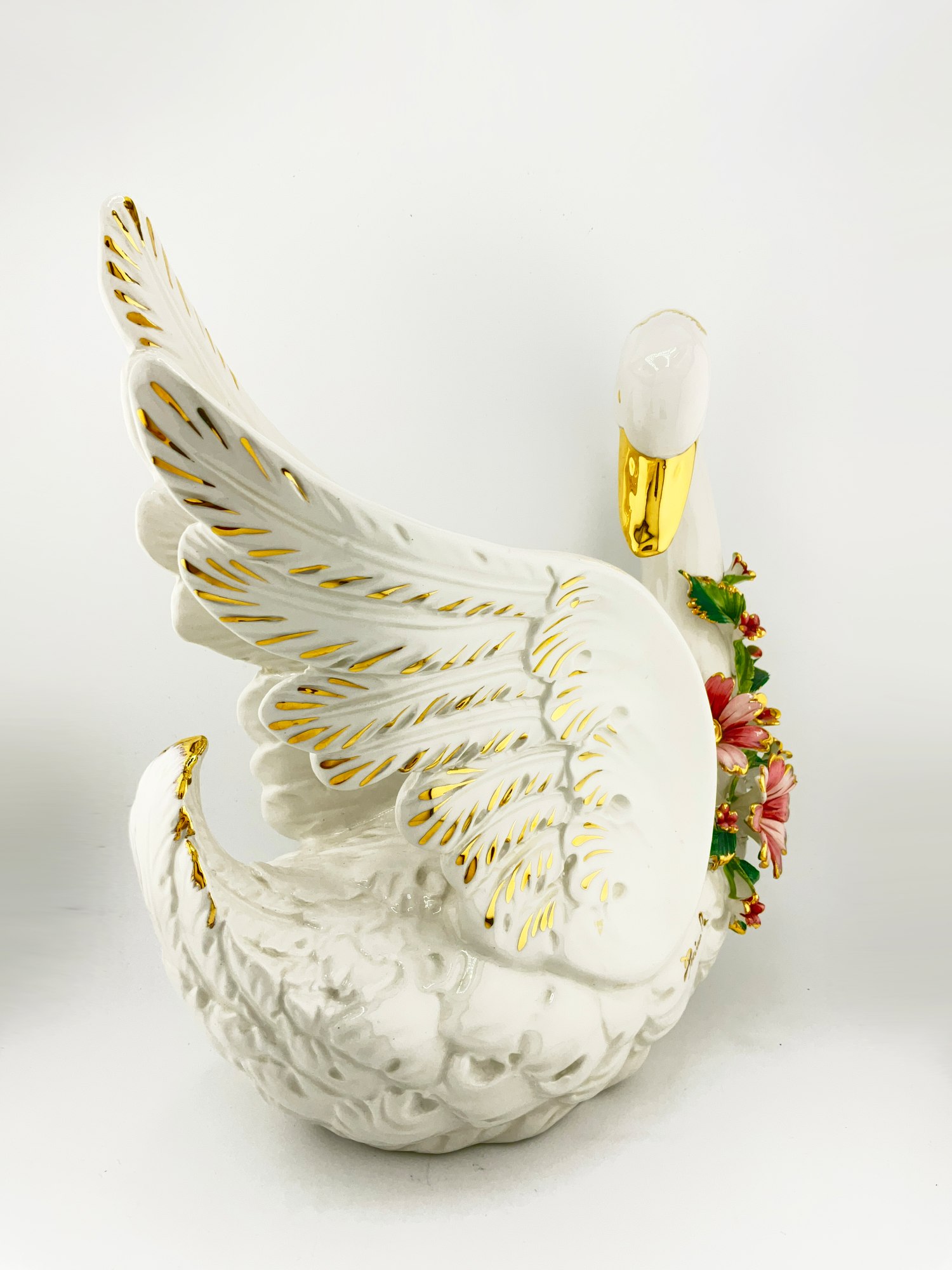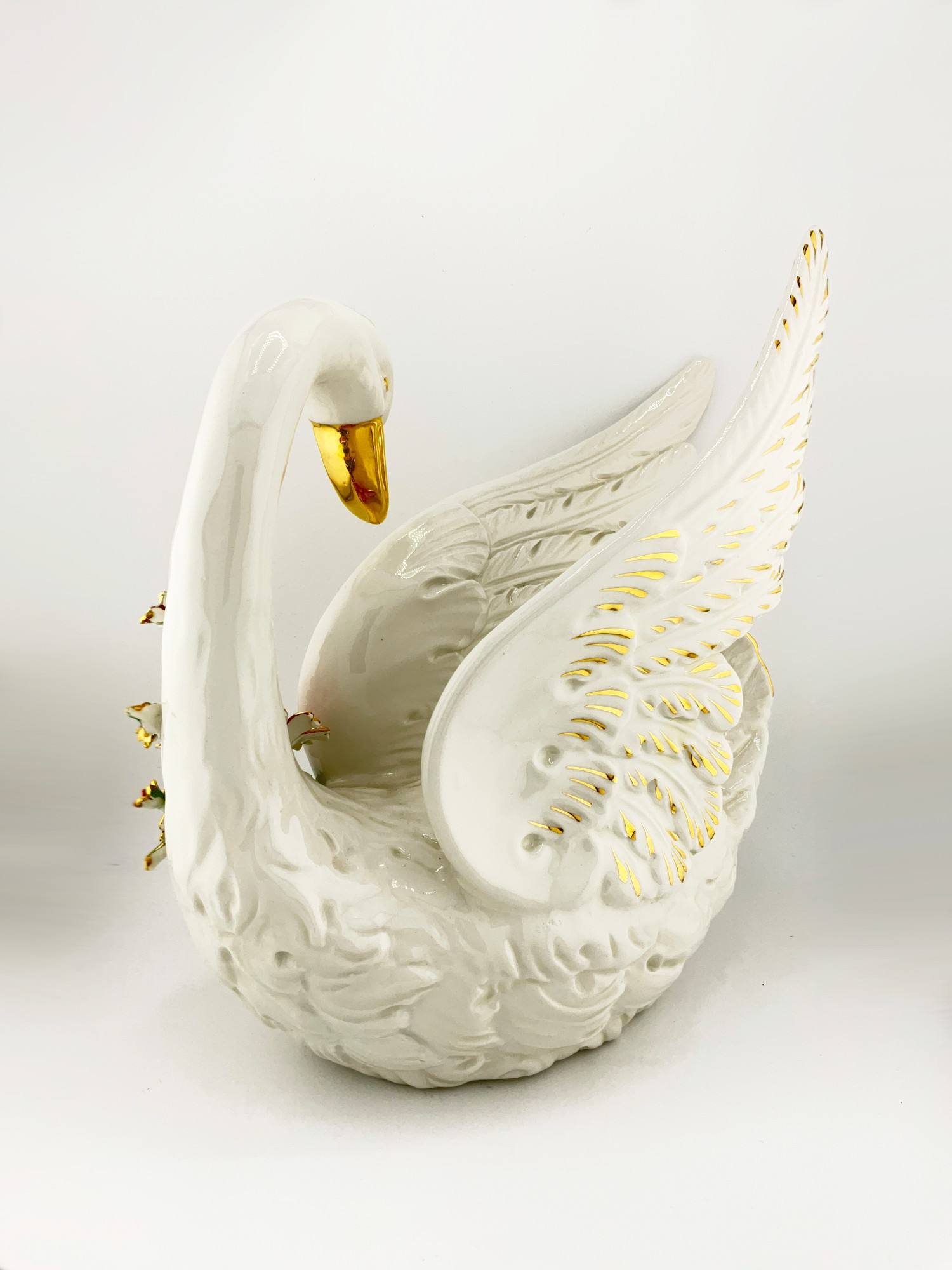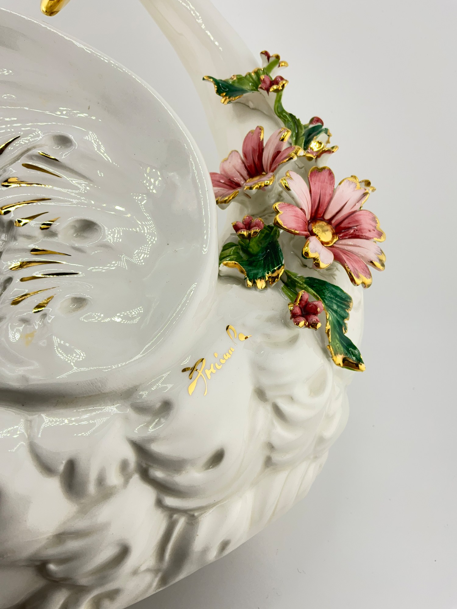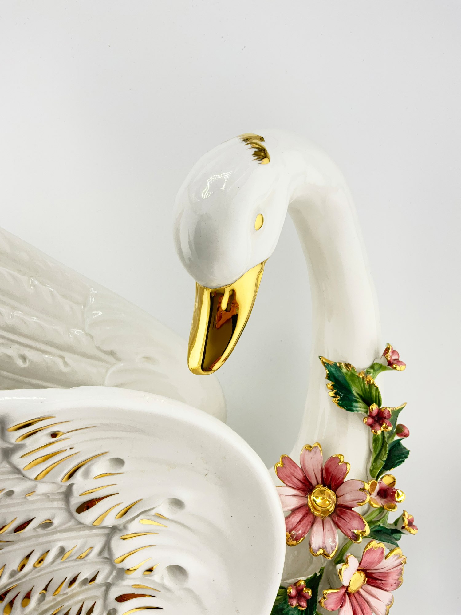 ORIGINAL CAPODIMONTE PORCELAIN SWAN WITH ATTACHED FLOWERS AND HAND PAINTED GOLD DETAILING