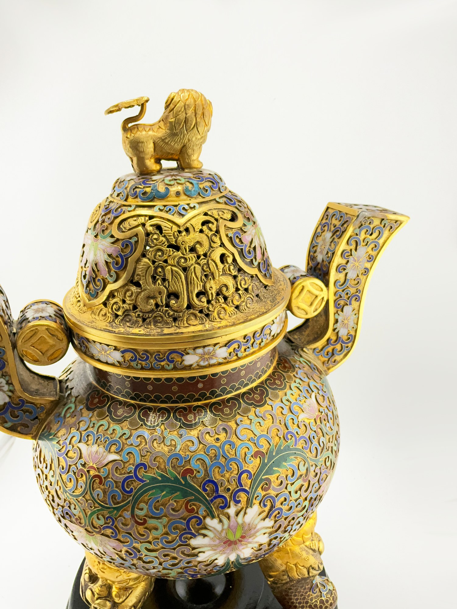 ANTIQUE CHINESE ENAMELED BRASS CLOISONNE FLORAL FOO DOG TRIPOD INCENCE BURNER W/ REMOVABLE LID AND STAND
