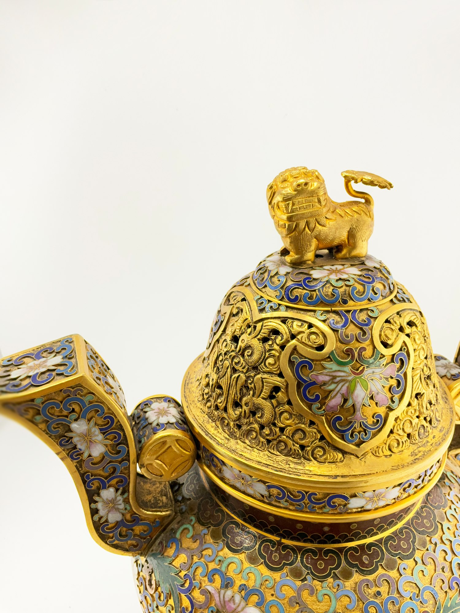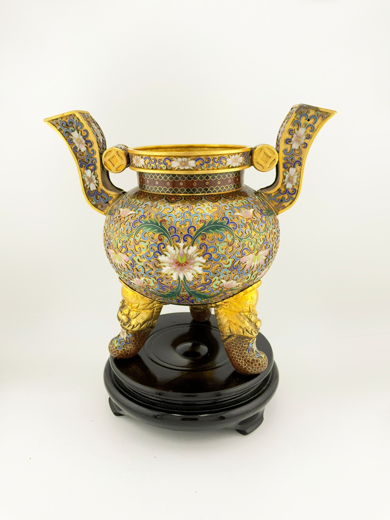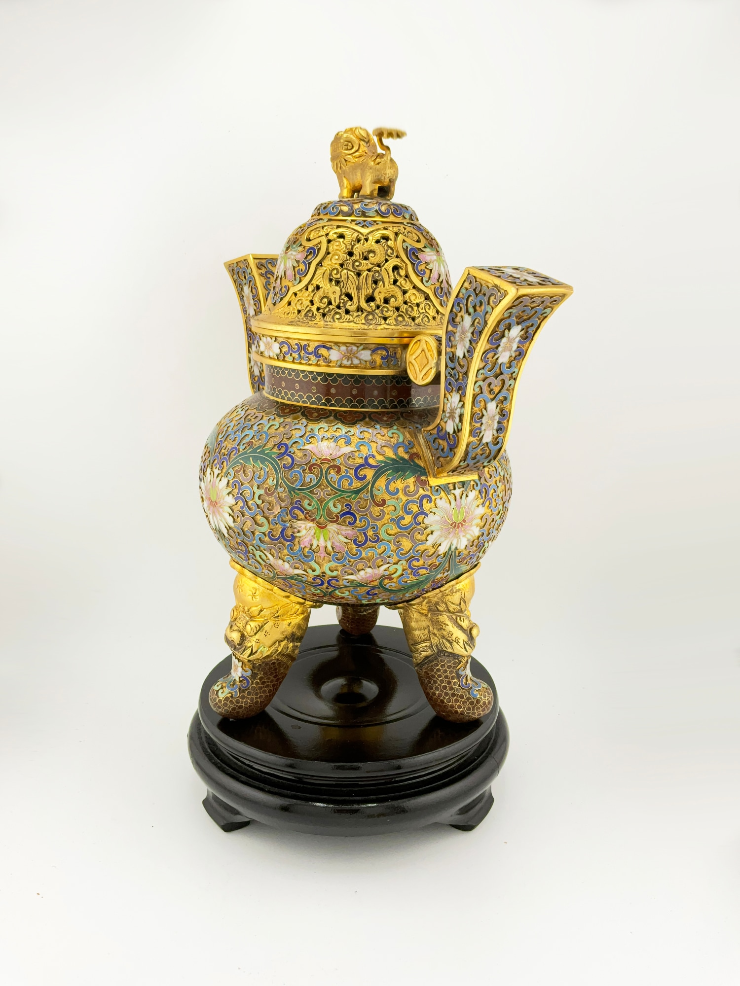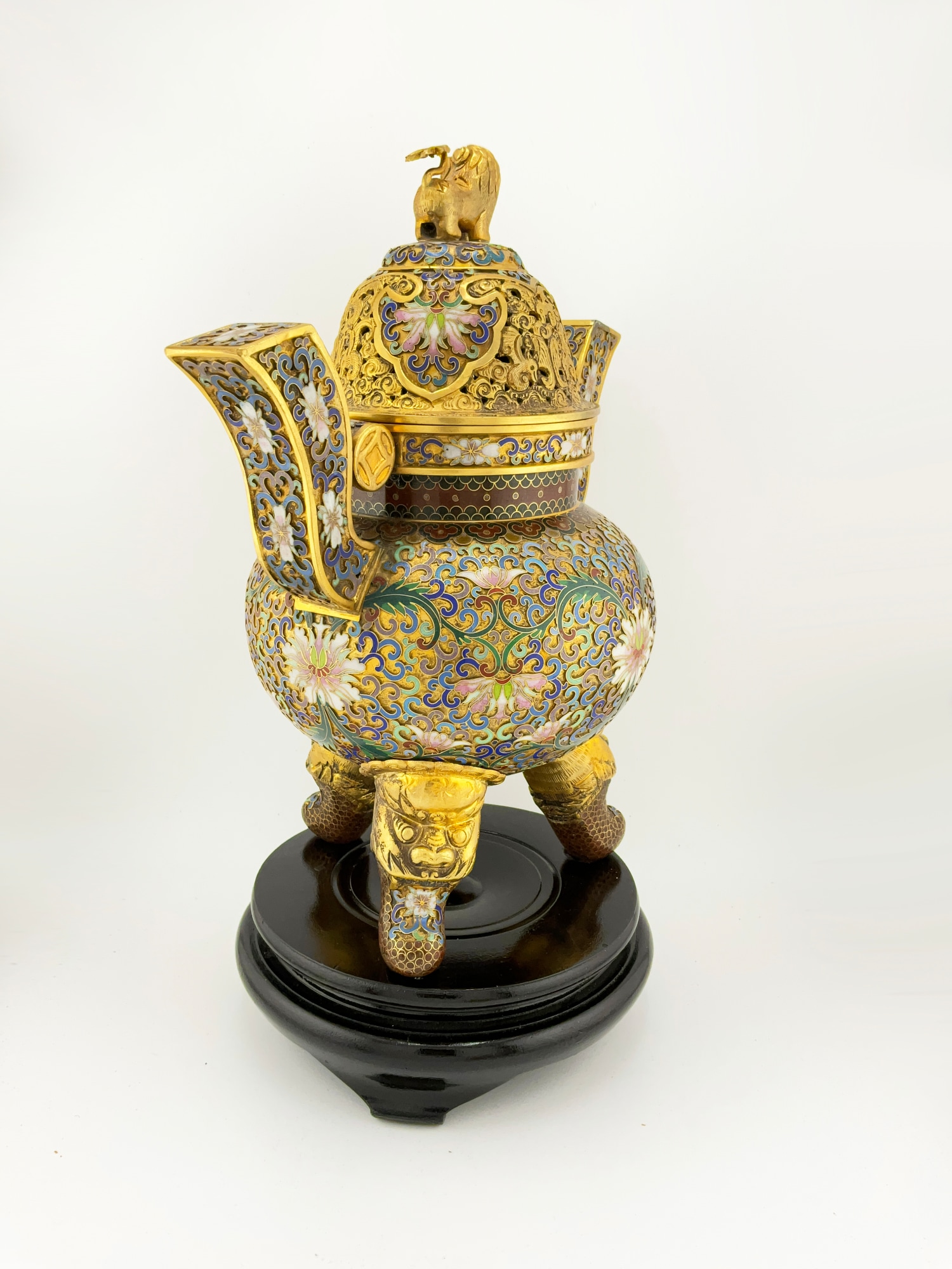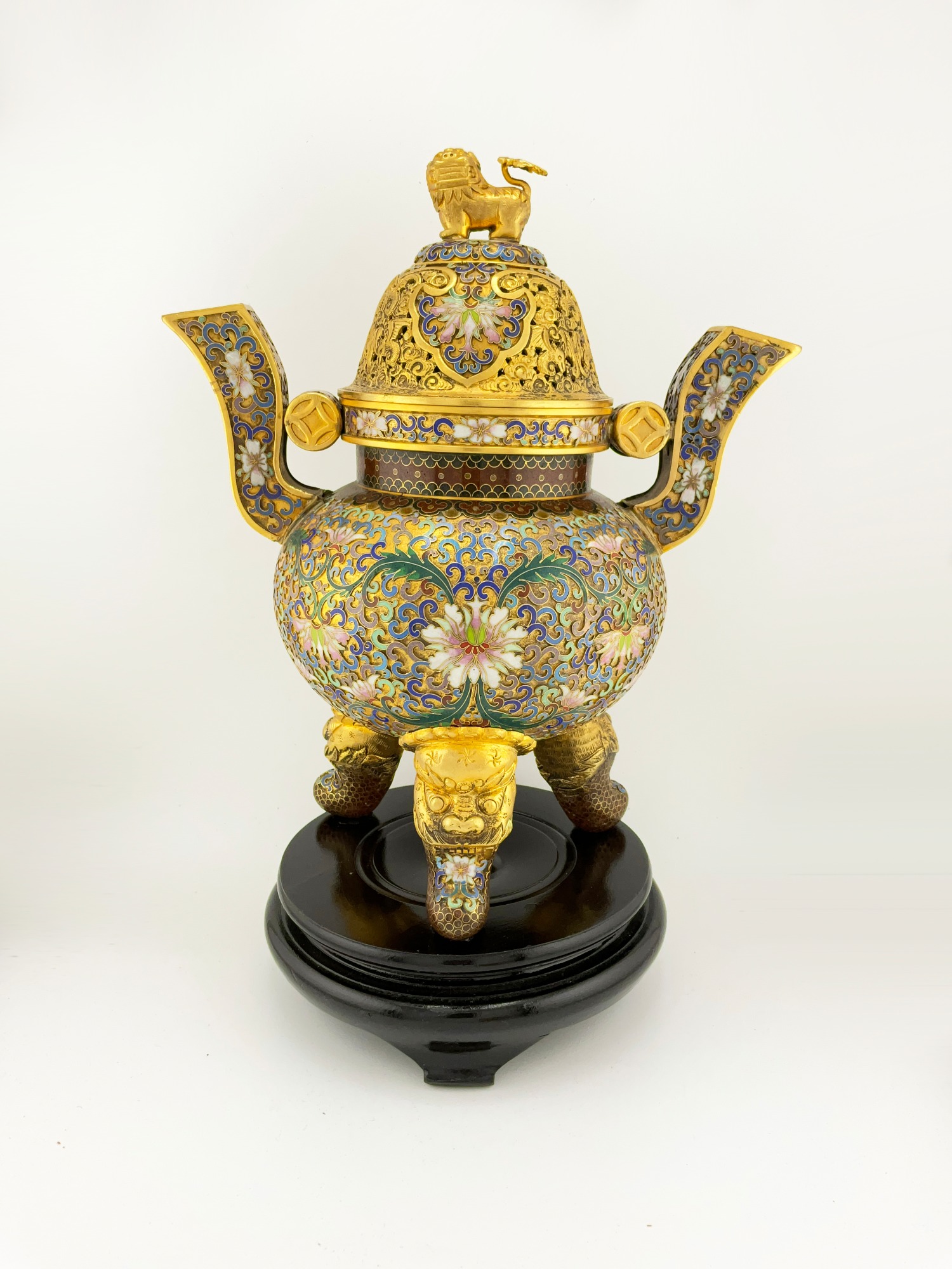 ANTIQUE CHINESE ENAMELED BRASS CLOISONNE FLORAL FOO DOG TRIPOD INCENCE BURNER W/ REMOVABLE LID AND STAND