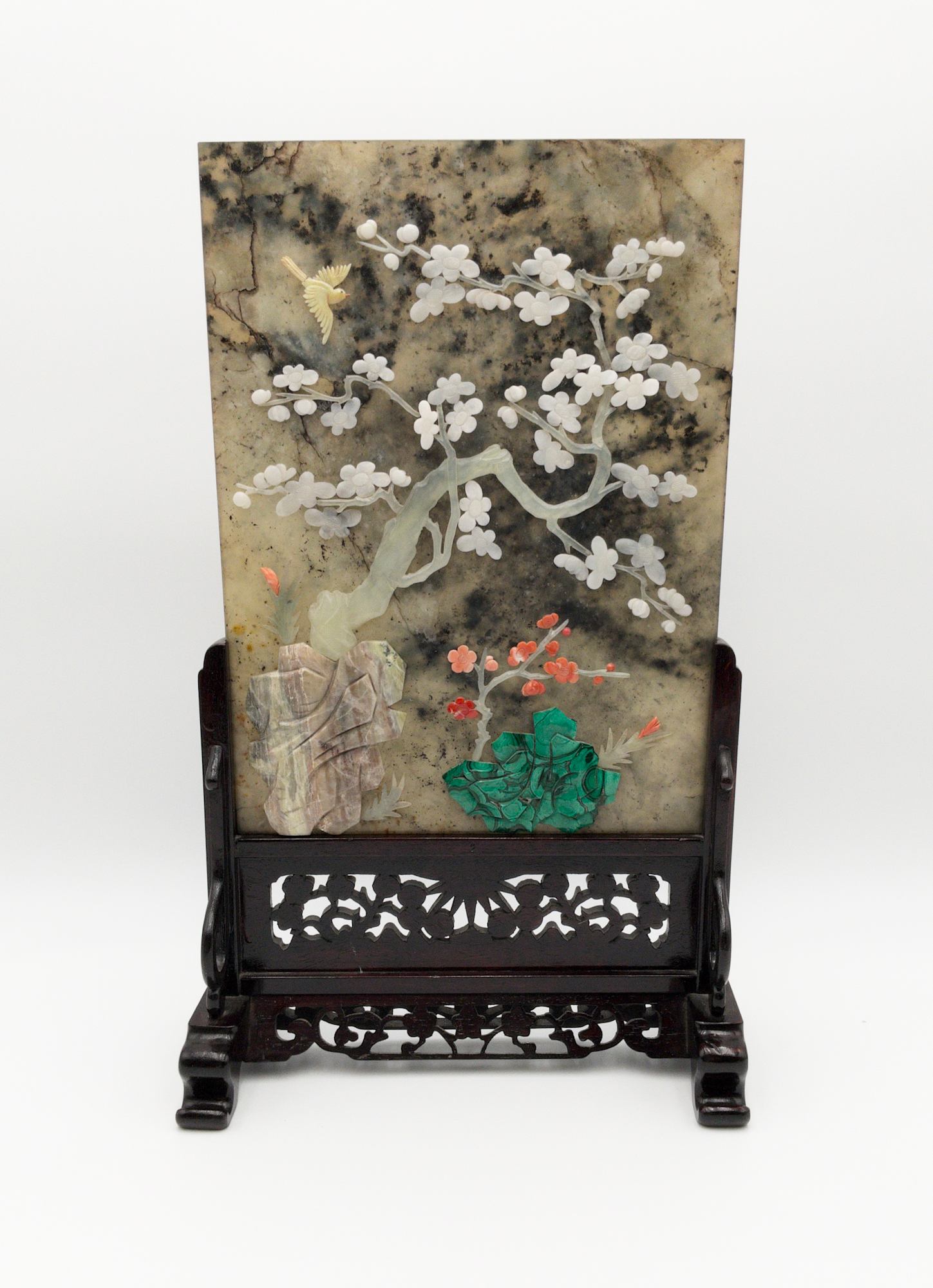 This vintage pair of Chinese table screens are made with quality spinach jade and marble making them a beautiful addition to any collection. The two table screens mirror each other depicting a blossoming tree with a yellow bird in the top corner and a small green bush in the opposing corner. Each screen on the stand measures 19 inches in height and 11 inches in width, with a depth of 5.5 inches and a weight of 5 lbs. 6 oz. They come with original hardwood stands that add to their overall charm. These antique screens are perfect for anyone who appreciates the beauty of Chinese art and design.