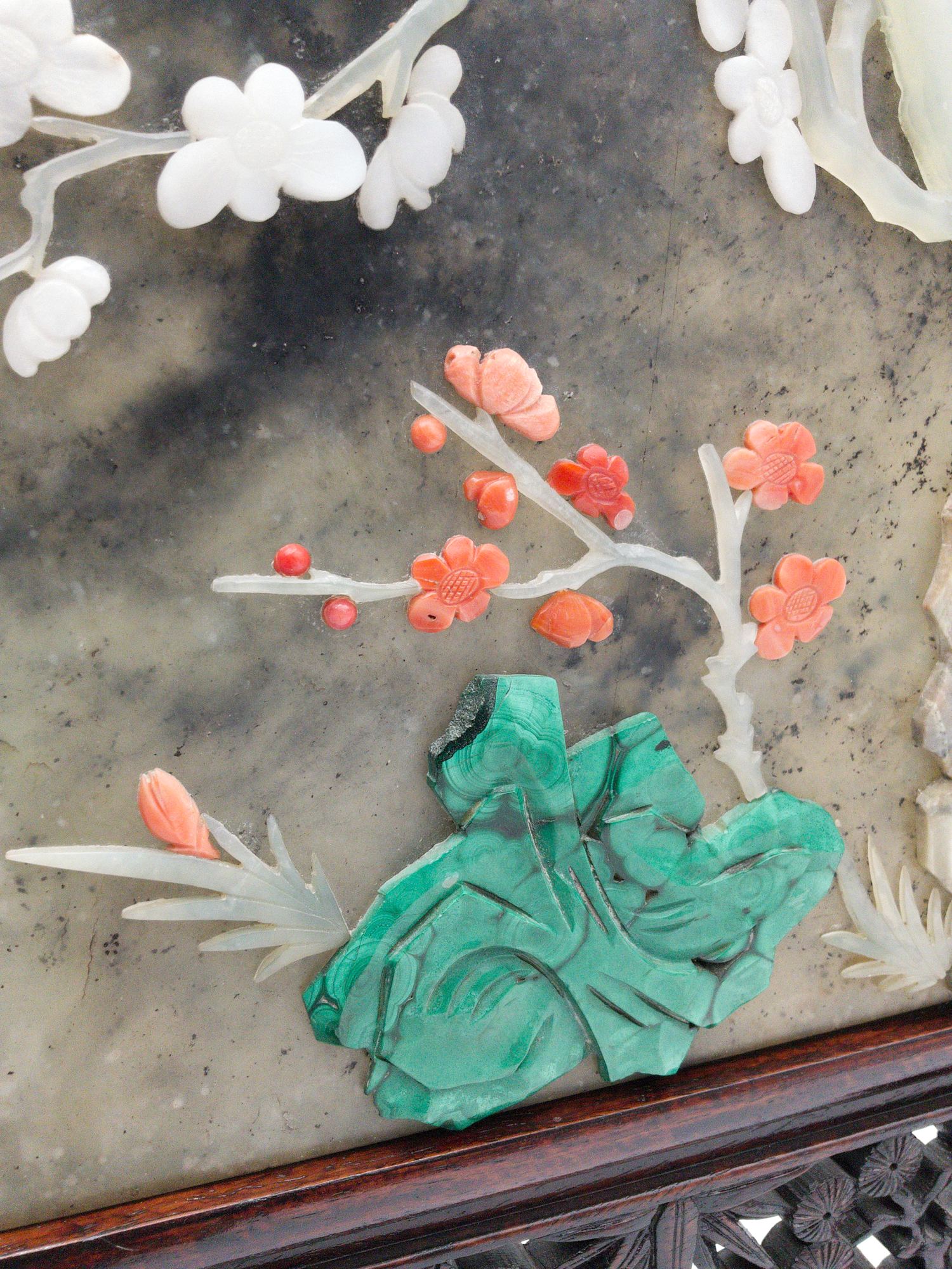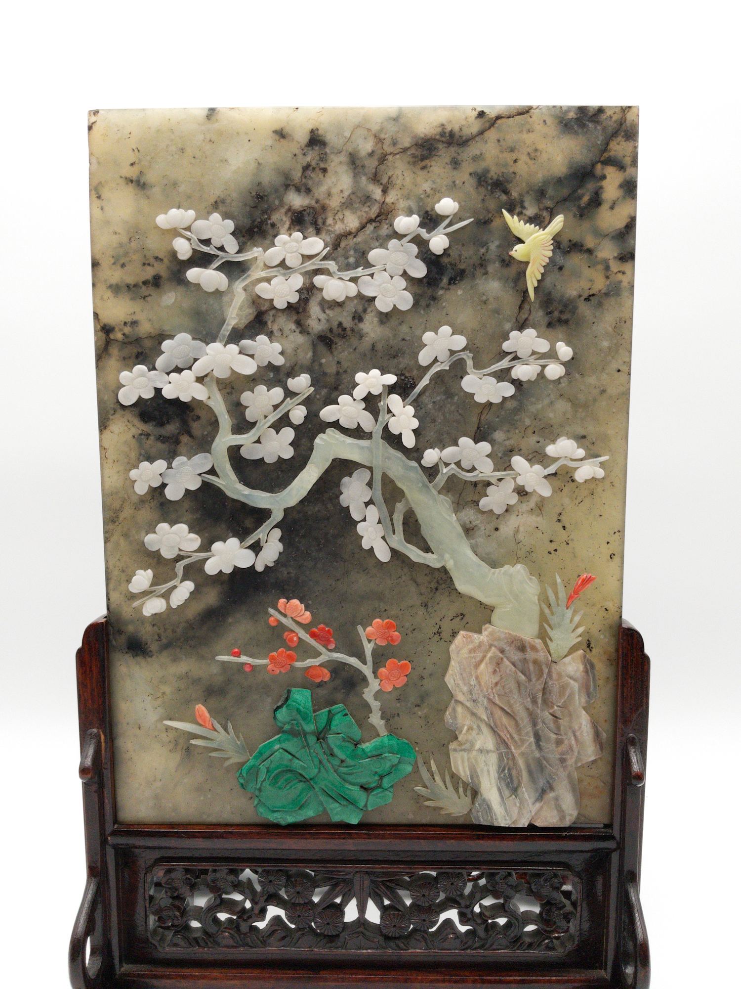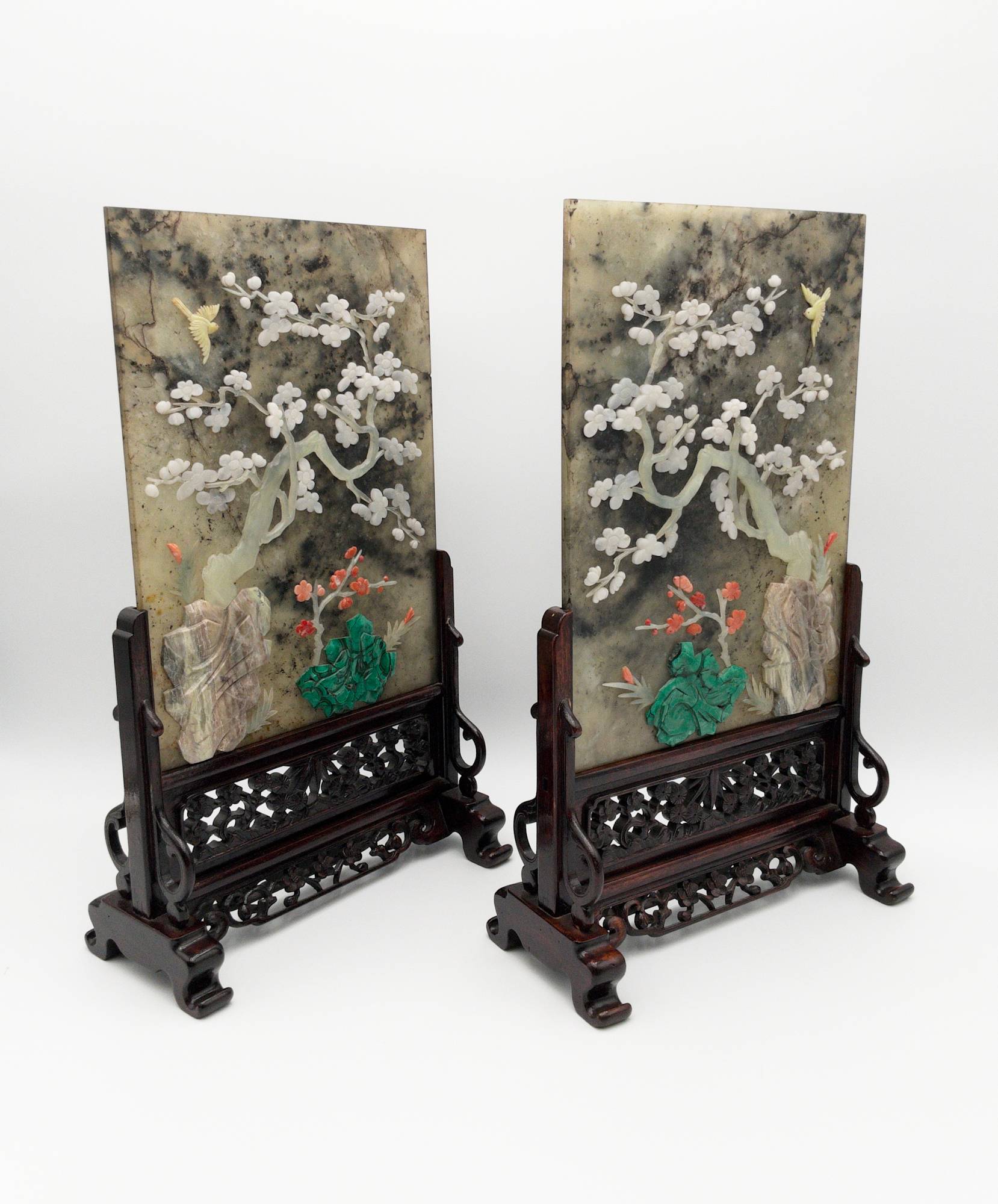 This vintage pair of Chinese table screens are made with quality spinach jade and marble making them a beautiful addition to any collection. The two table screens mirror each other depicting a blossoming tree with a yellow bird in the top corner and a small green bush in the opposing corner. Each screen on the stand measures 19 inches in height and 11 inches in width, with a depth of 5.5 inches and a weight of 5 lbs. 6 oz. They come with original hardwood stands that add to their overall charm. These antique screens are perfect for anyone who appreciates the beauty of Chinese art and design.
