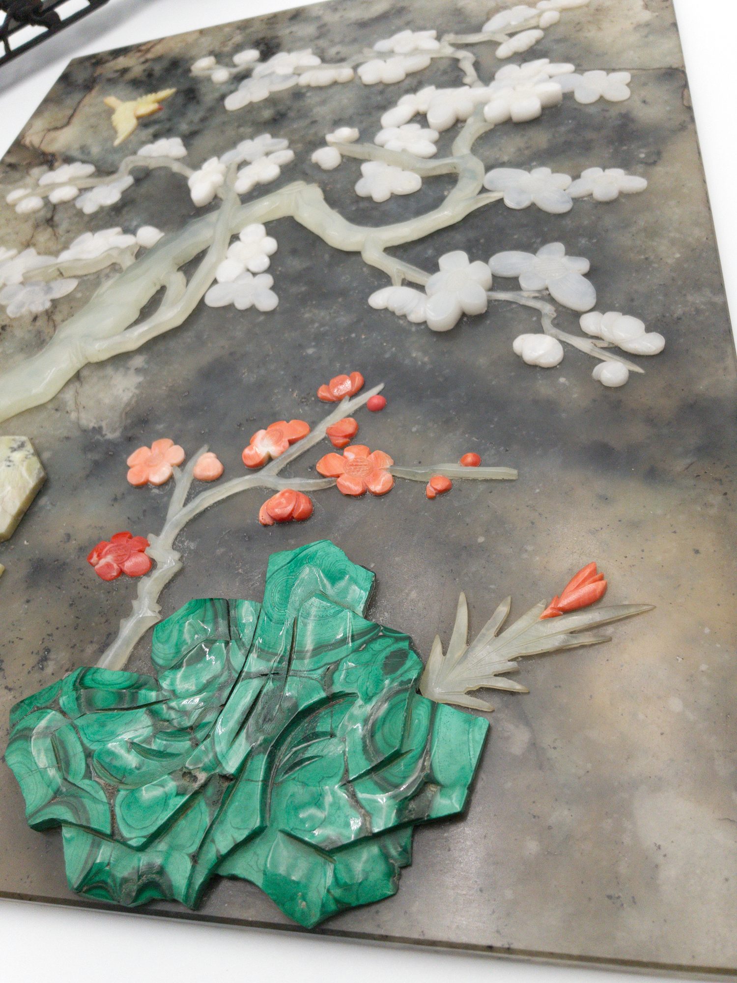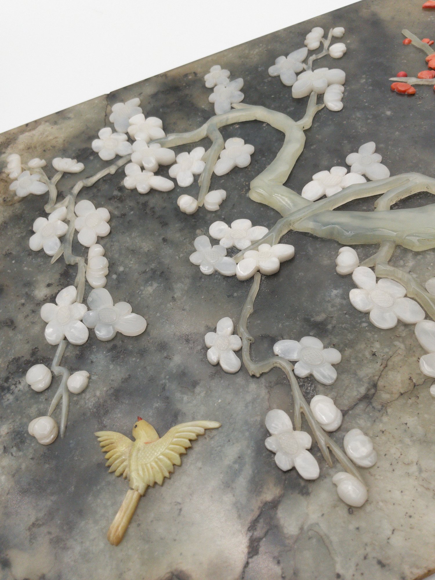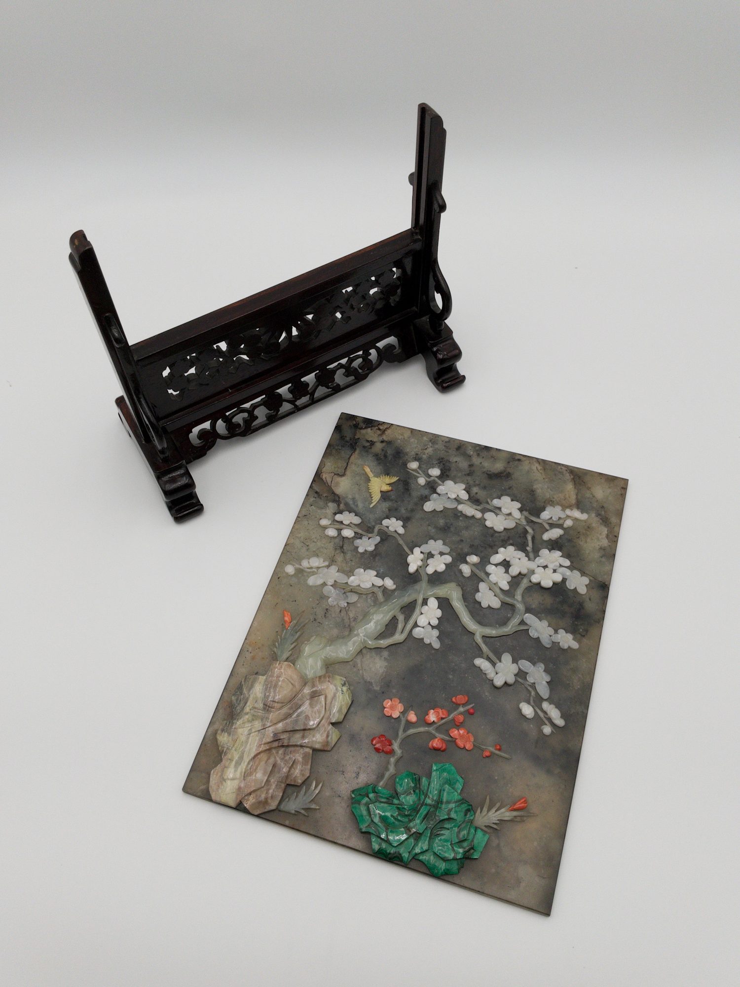This vintage pair of Chinese table screens are made with quality spinach jade and marble making them a beautiful addition to any collection. The two table screens mirror each other depicting a blossoming tree with a yellow bird in the top corner and a small green bush in the opposing corner. Each screen on the stand measures 19 inches in height and 11 inches in width, with a depth of 5.5 inches and a weight of 5 lbs. 6 oz. They come with original hardwood stands that add to their overall charm. These antique screens are perfect for anyone who appreciates the beauty of Chinese art and design.