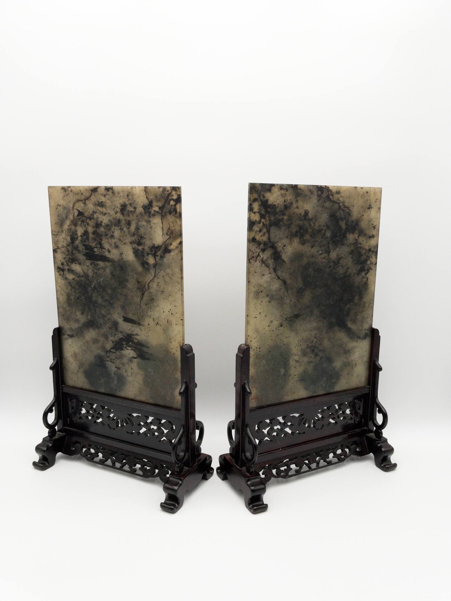 CHINESE SPINACH JADE & MARBLE TABLE SCREENS PAIR WITH HARDWOOD STANDS