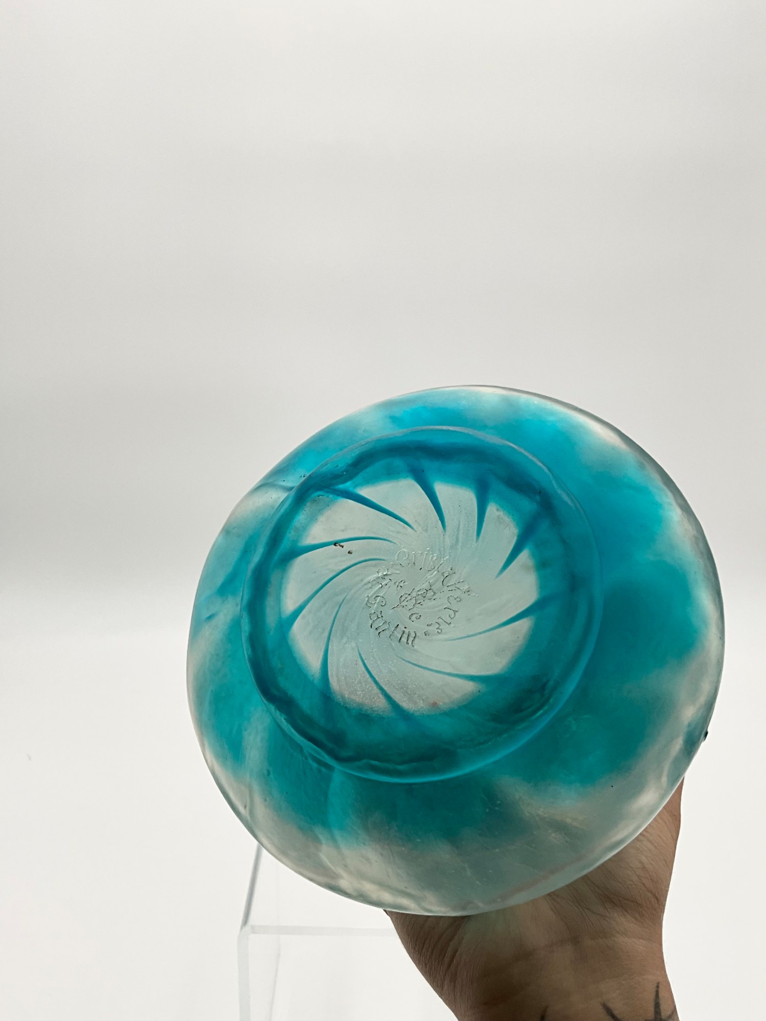 This exquisite vase is a stunning example of the work done by Christallerie de Pantin. This cameo art glass vase features a beautifully etched floral pattern on shades of blue and yellow, hand-blown from high-quality glass. This vase is an antique piece manufactured in France. The vase stands at a height of 15 inches and has a width of 5.5 inches. It is a perfect addition to any decorative collection and is suitable for all occasions. The vase is signed on the bottom of the base: Christallerie de Pantin. Monogram: STV & C (Saint-Hilaire, Touvier, de Varreaux and Company of Pantin, France). This original piece is a must-have for collectors and lovers of art glass.