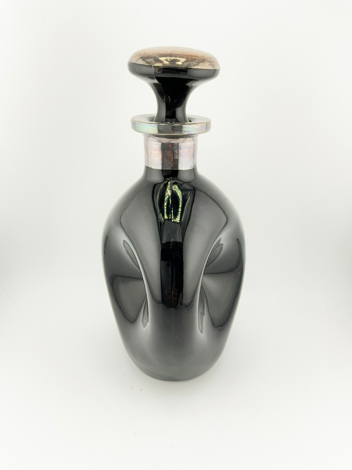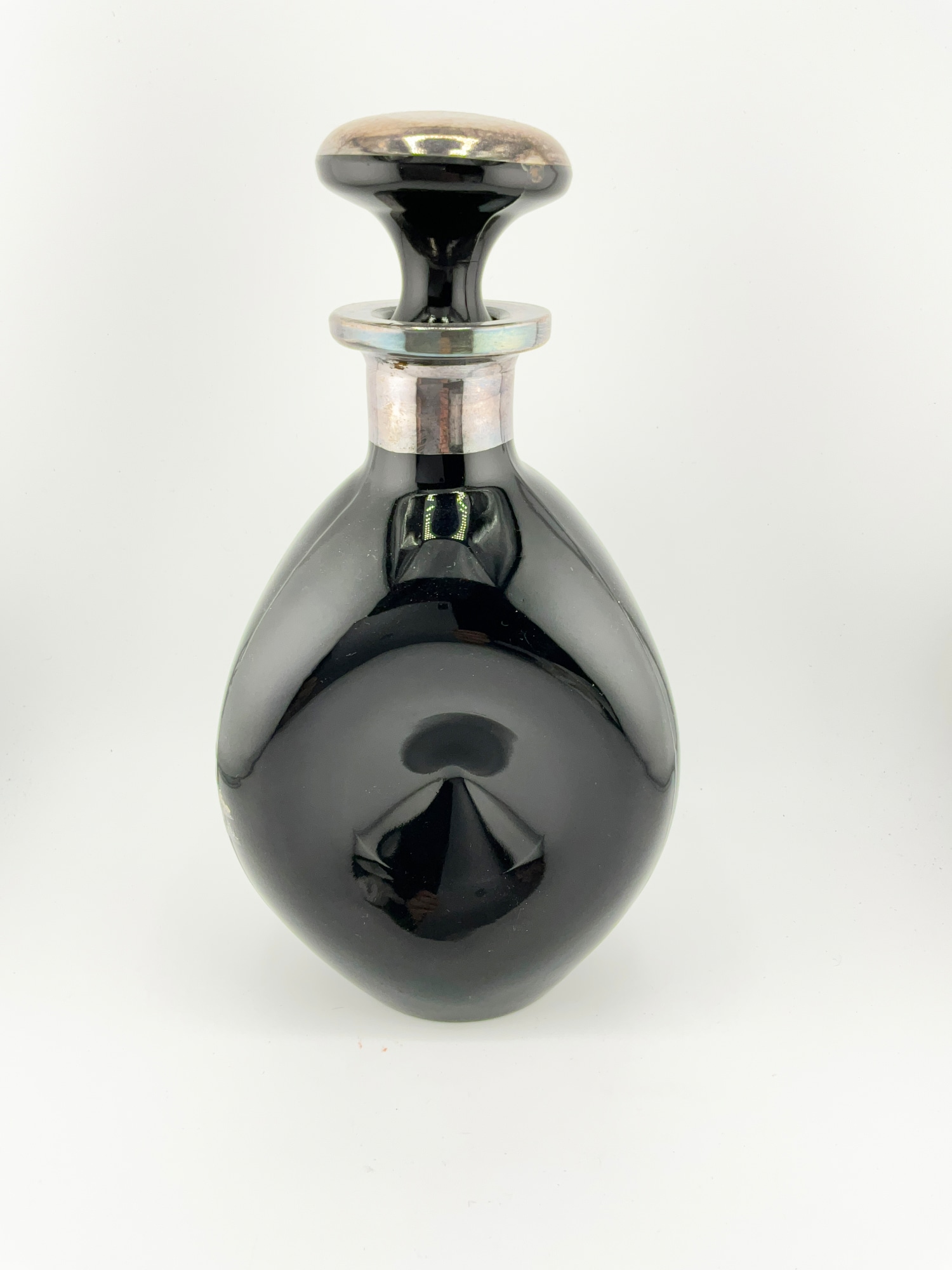 This Art Deco pinch decanter is a unique addition to any collection. The obsidian glass and sterling silver combination gives it a luxurious feel, while the hunting and equestrian themes add a touch of elegance. The decanter is an original piece from the early 20th century, and it has a glossy finish. The decanter is made with care and attention to detail, as evidenced by the silver inlay and pinched design. It is a perfect size for storing your favorite drink, and the bottle with stopper feature ensures that it stays secure. This National Silver Deposit Ware decanter is a must-have for any art glass enthusiast or collector.