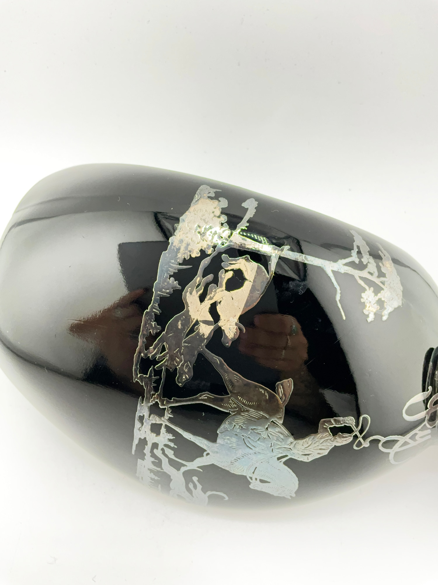 OBSIDIAN GLASS PINCHED DECANTER WITH INLAID STERLING SILVER HUNTING SCENE