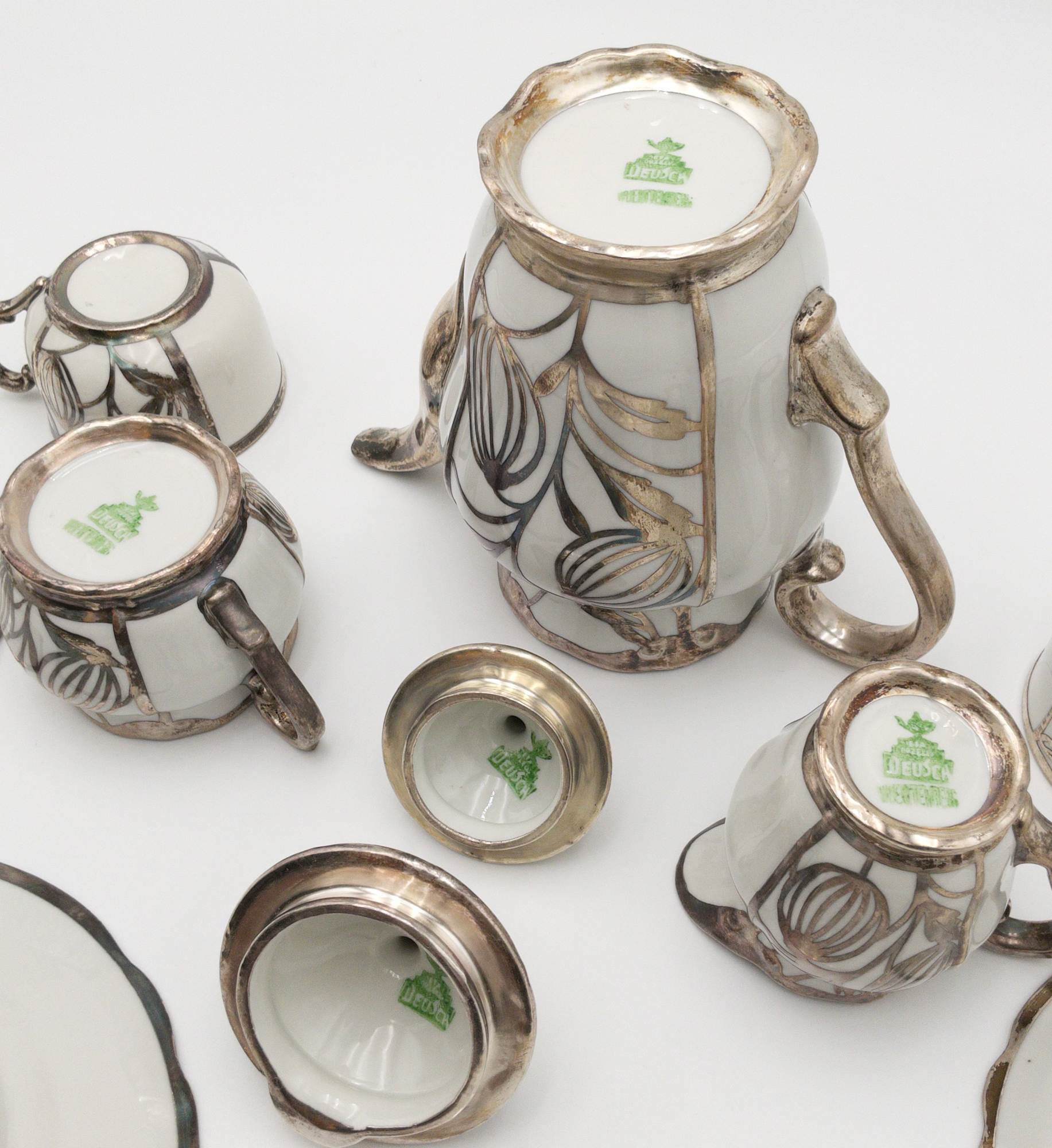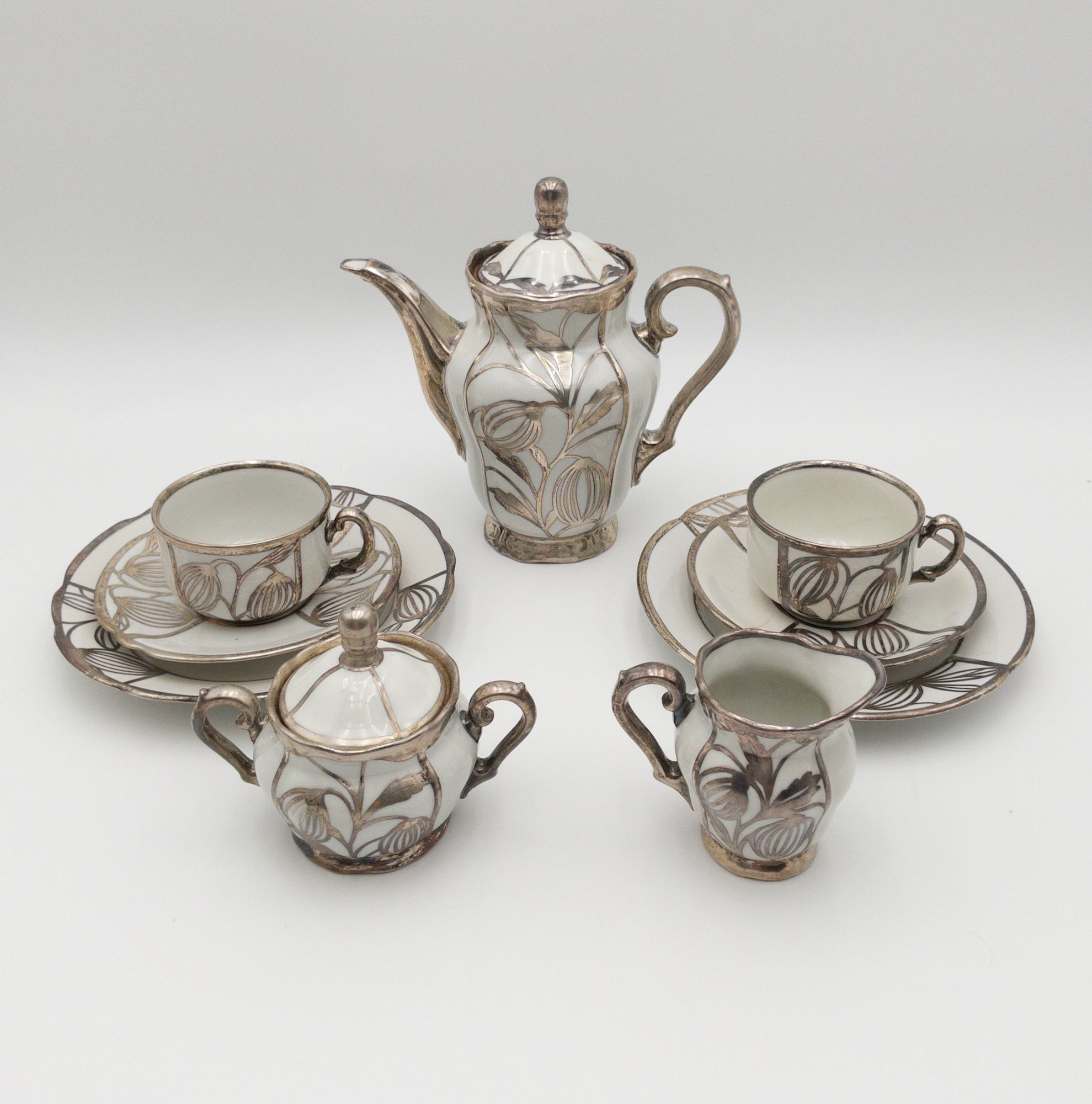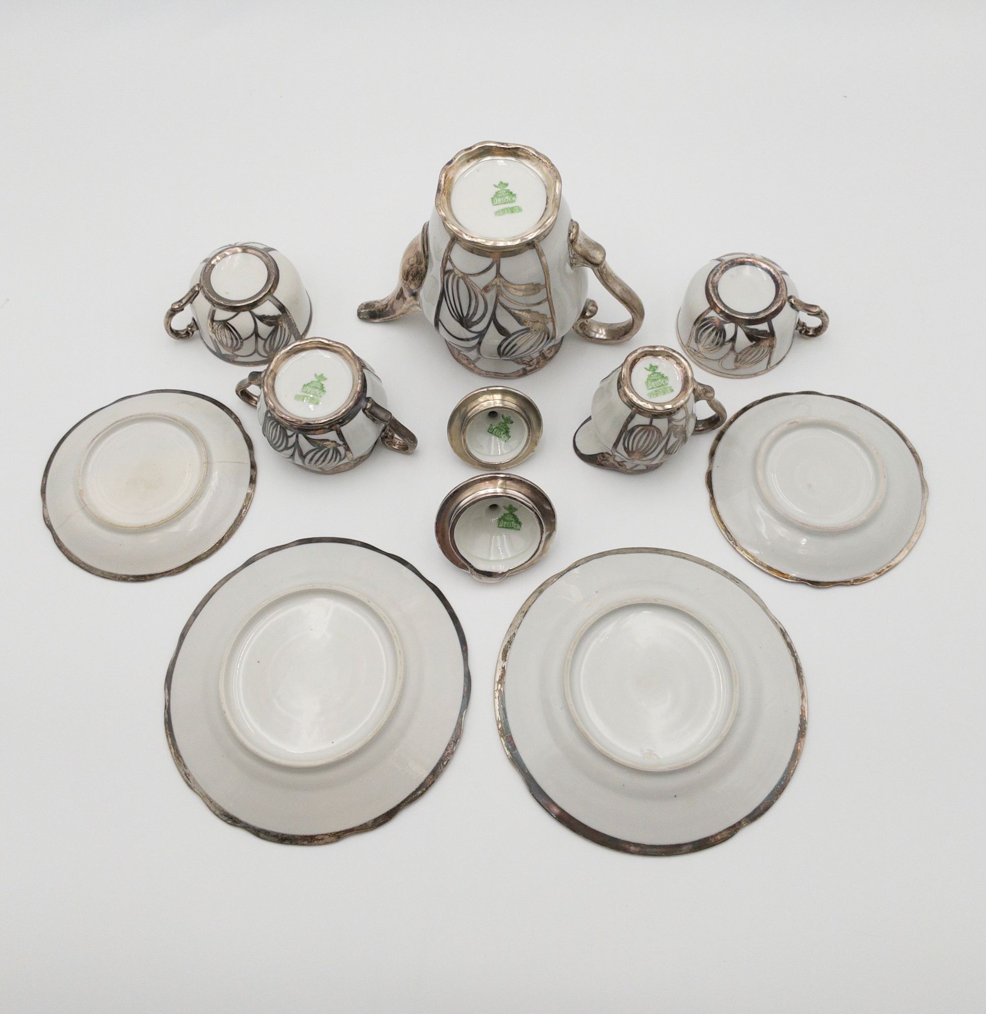 ORIGINAL DEUSCH & CO PORCELAIN W/ SILVER INLAY COFFEE POT, SUGAR, CREAMER, CUPS & SAUCER SET (9 PC)