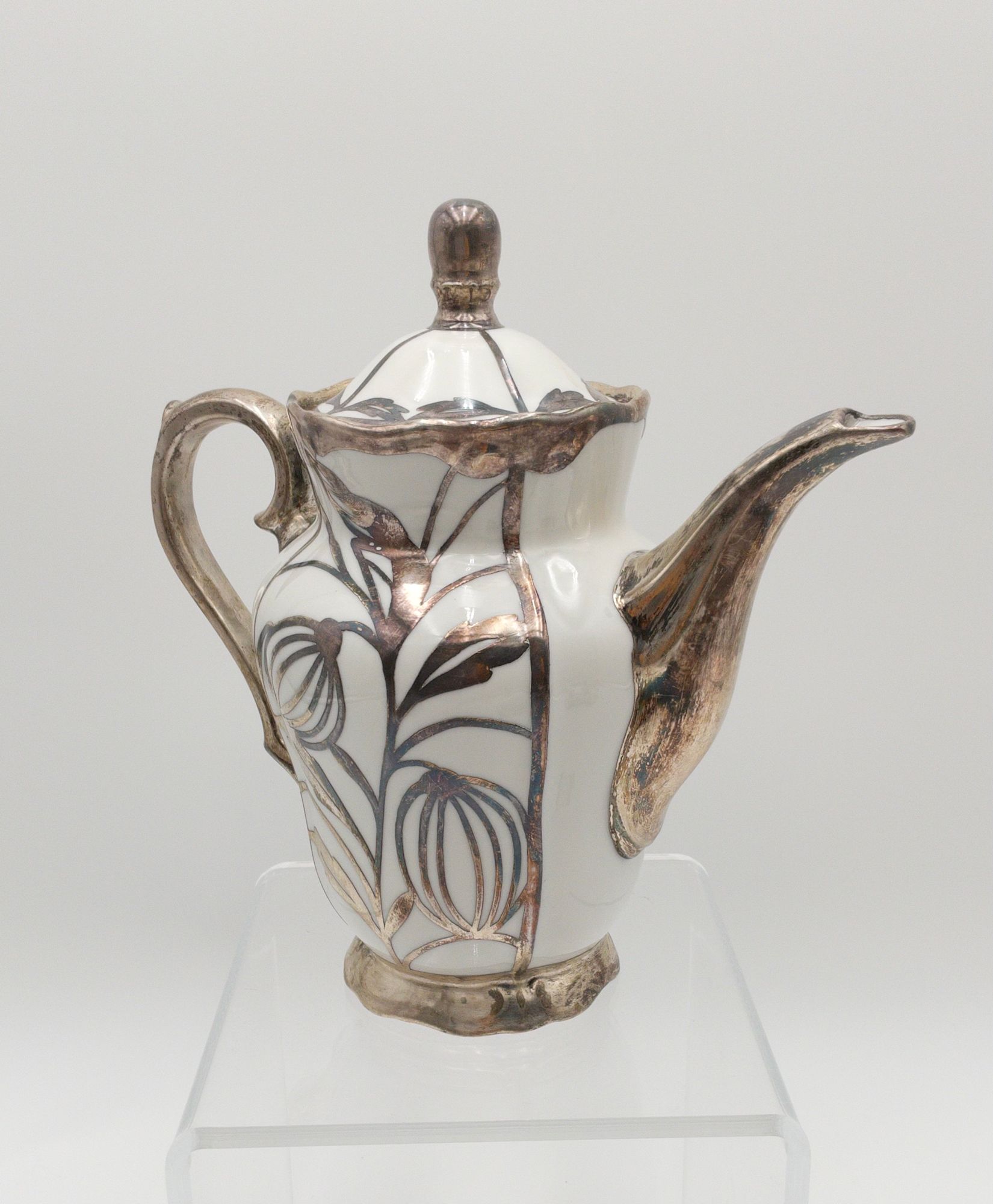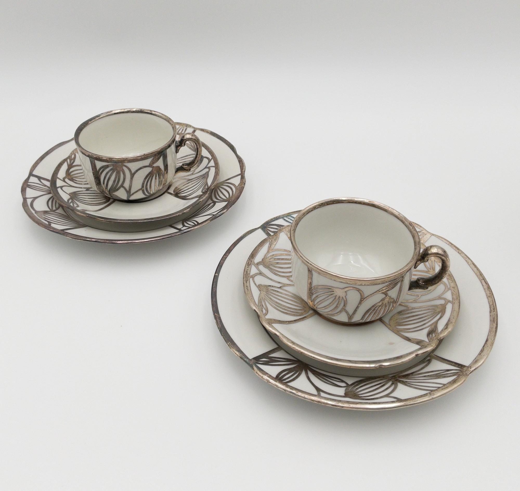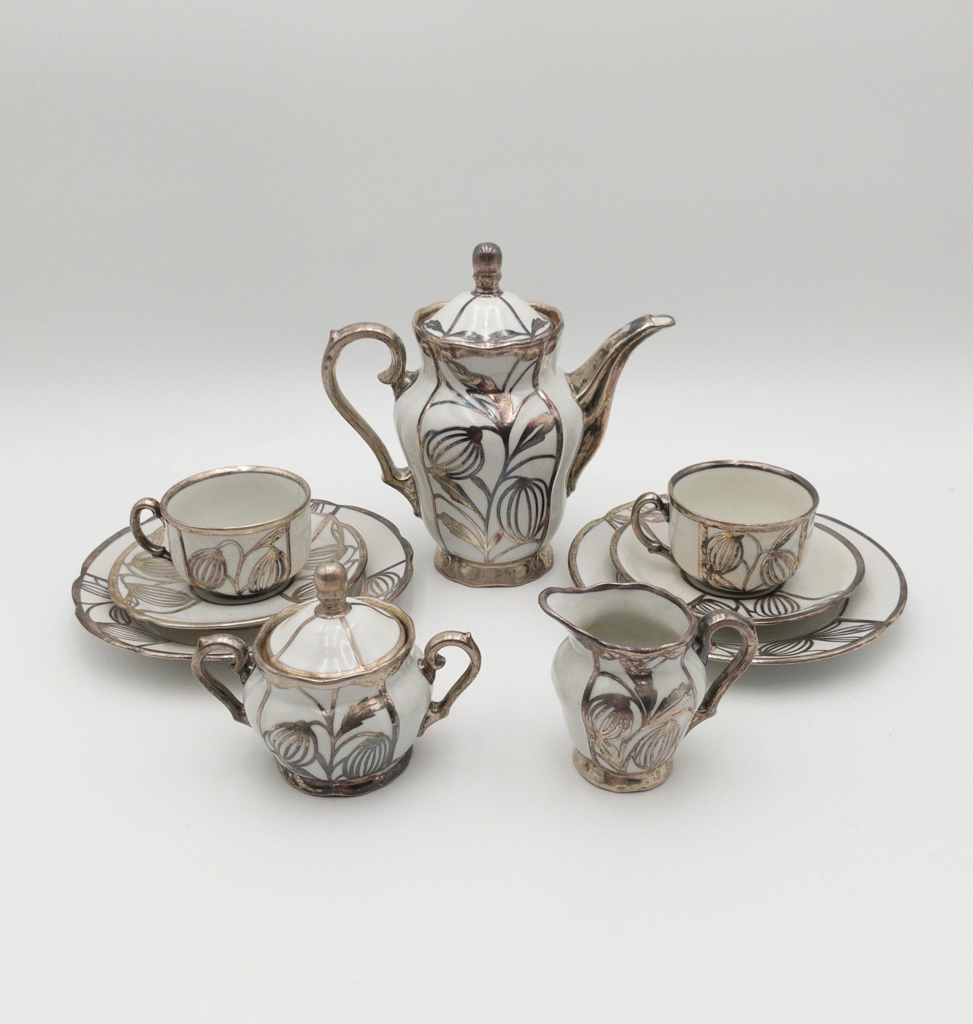 ORIGINAL DEUSCH & CO PORCELAIN W/ SILVER INLAY COFFEE POT, SUGAR, CREAMER, CUPS & SAUCER SET (9 PC)