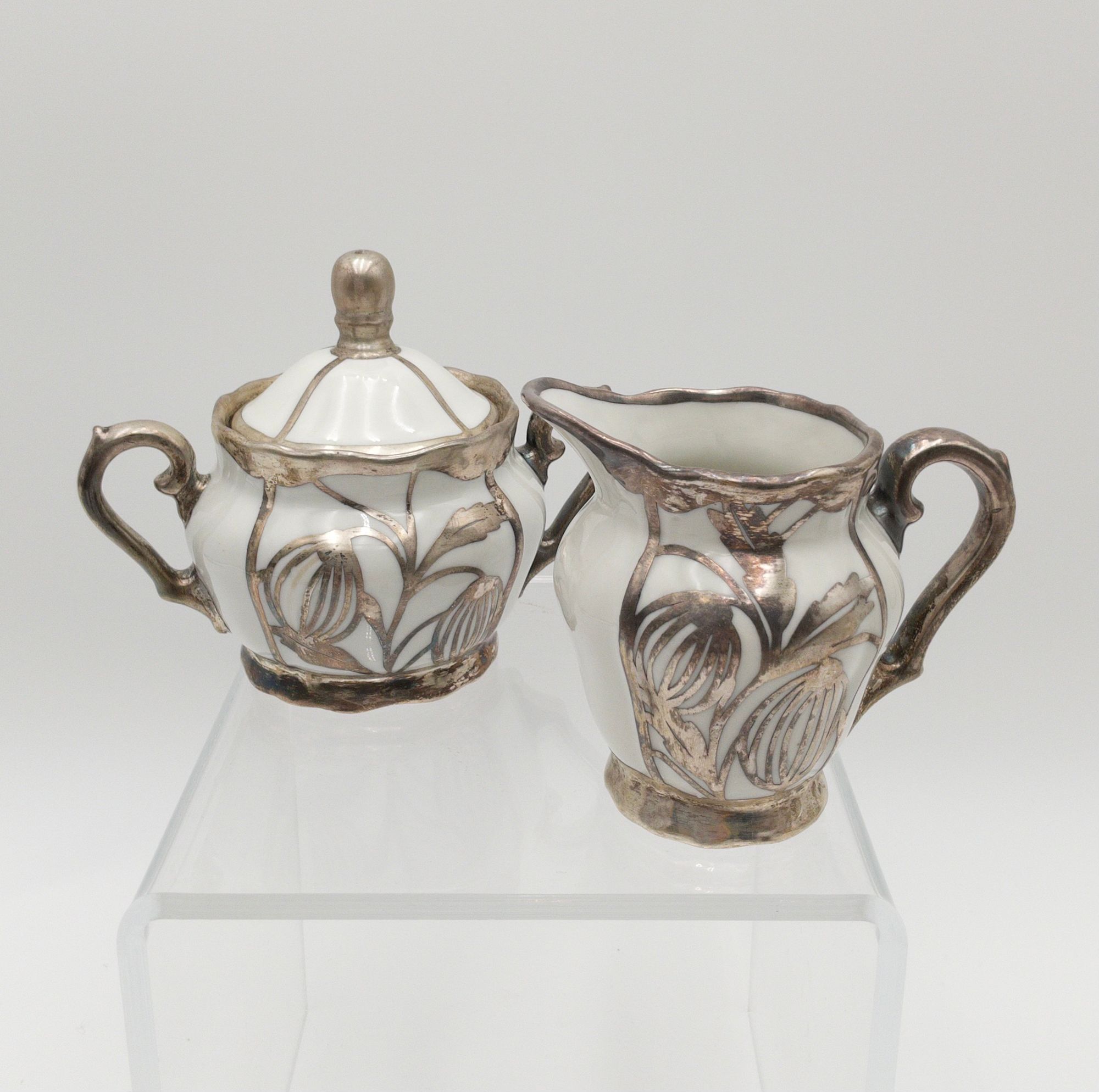 This exquisite set from Deusch & Co. features a porcelain base with a stunning silver inlay floral like pattern. The set includes a large pitcher, 1 creamer, 1 sugar, 2 cups and 4 plates; 2 smaller and 2 larger. The pitcher measures 8.5 inches in height and can handle approximately 24 fluid oz. Sugar container measures 4.5 inches in height while the creamer measures 4 inches. The diameter of both saucers measures 5.75 inches for the smaller and 7.75 inches for the larger. Crafted in Germany, this original Art Nouveau style set is perfect for any food and drink theme, and is sure to impress your guests. The set all together weighs 4 lbs. 8 oz. All pieces are marked with the Deusch maker mark on the bottom in green print outside of the cup and saucer sets.