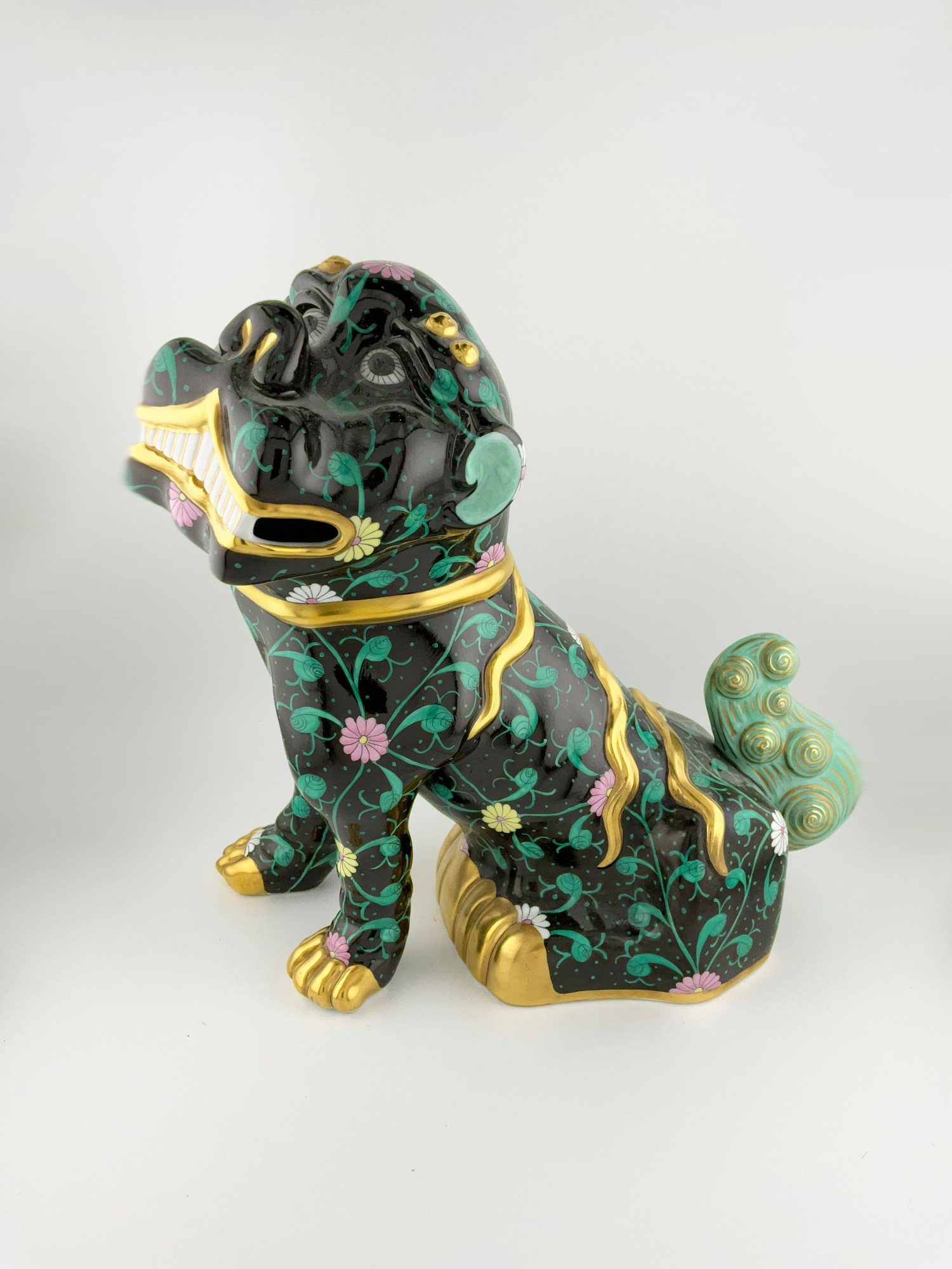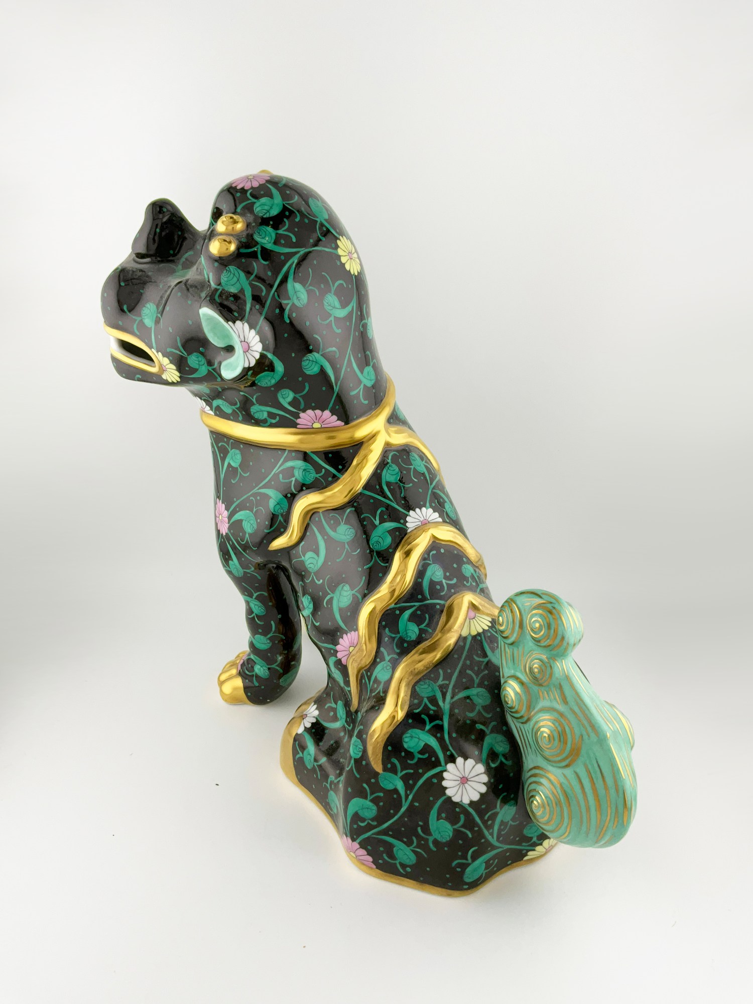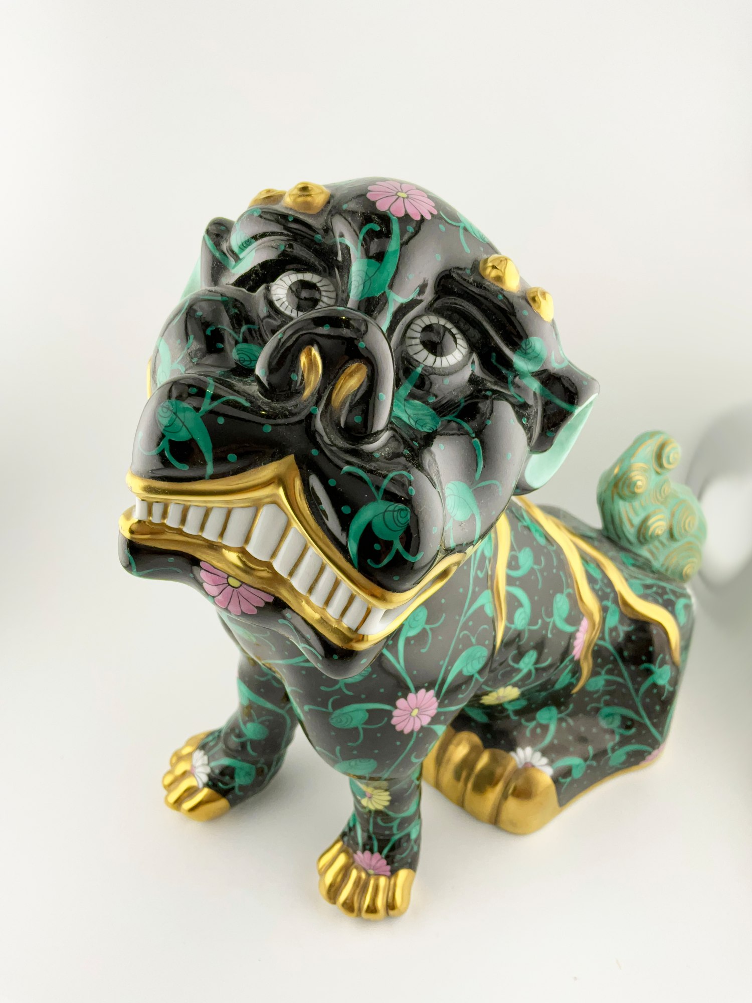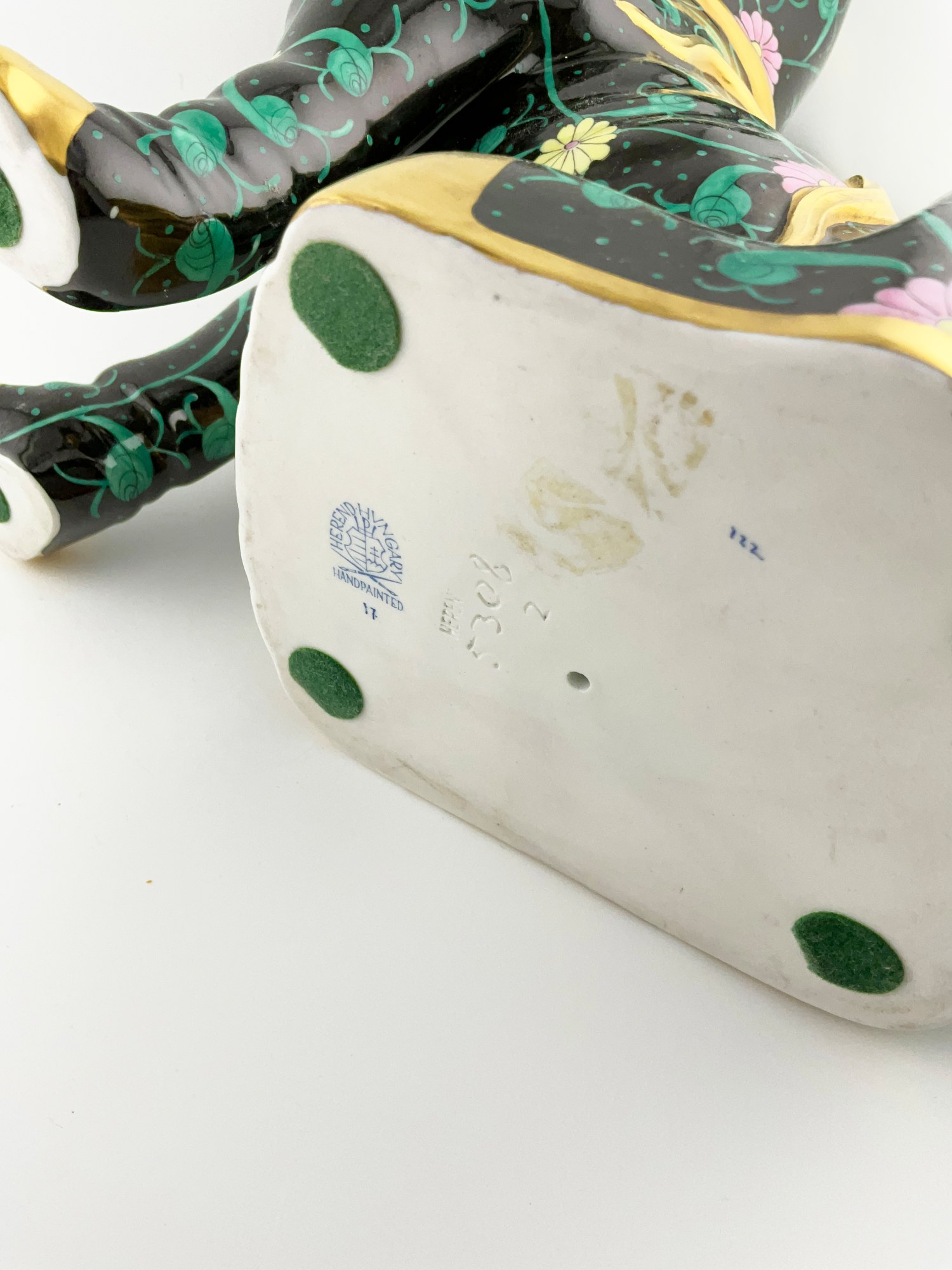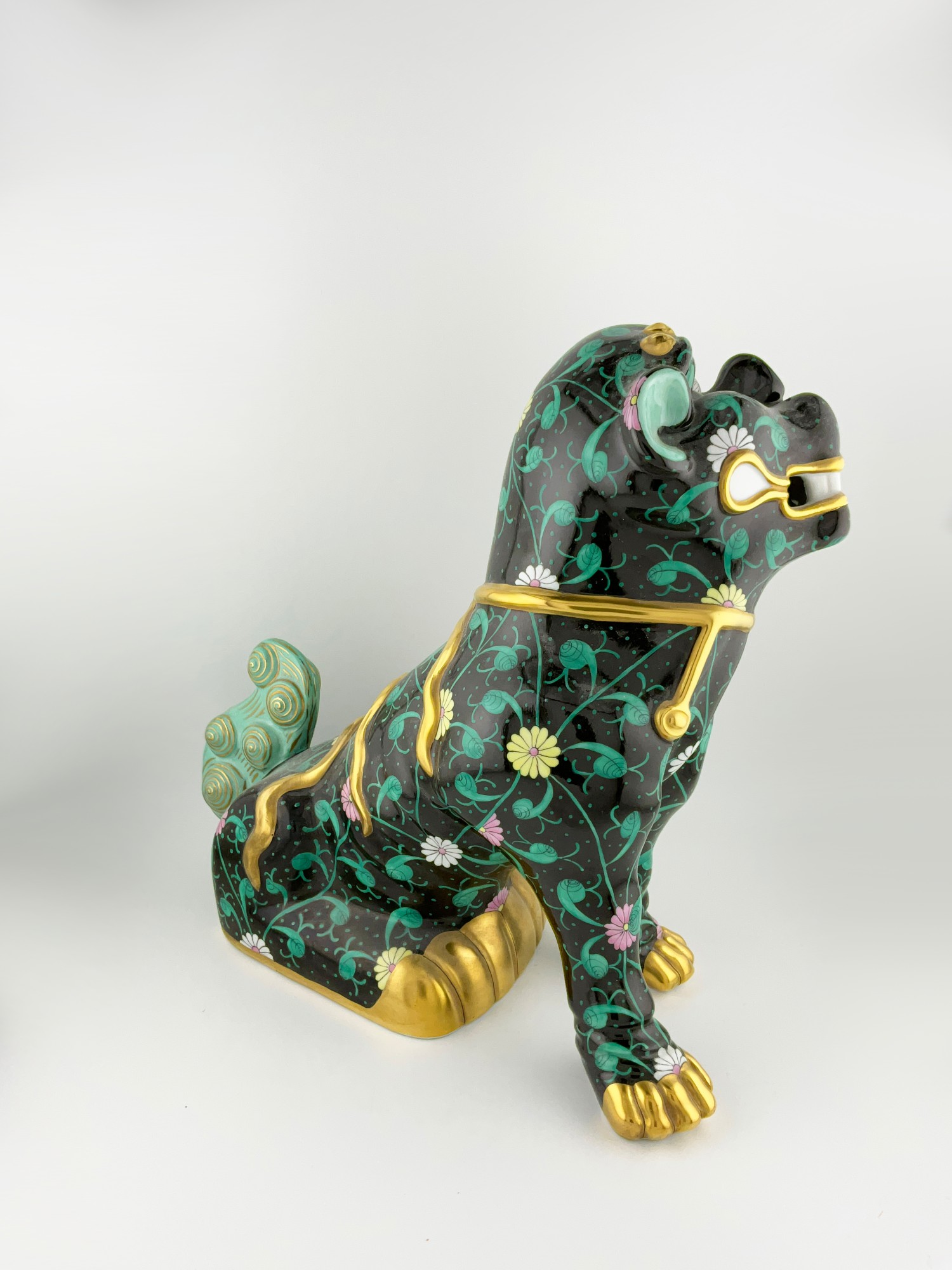 This exquisite large porcelain figurine of a black dynasty Siang Noir dog is an original Herend piece, hand-painted with intricate details on high-quality porcelain material.The mythology of the “Foo Dog” stands for Buddha or Prosperity. The glossy finish and elegant gold detailing make it a perfect addition to any collection. Crafted in Hungary the figurine measures 10” in height, 10.5 inches in length and 4.5 inches in width, with a weight of approximately 3 lbs. Marked on the bottom with the Herend maker mark in blue with the lettering: Hand painted 17 with incised letters and numbers: Herend 5308 2.