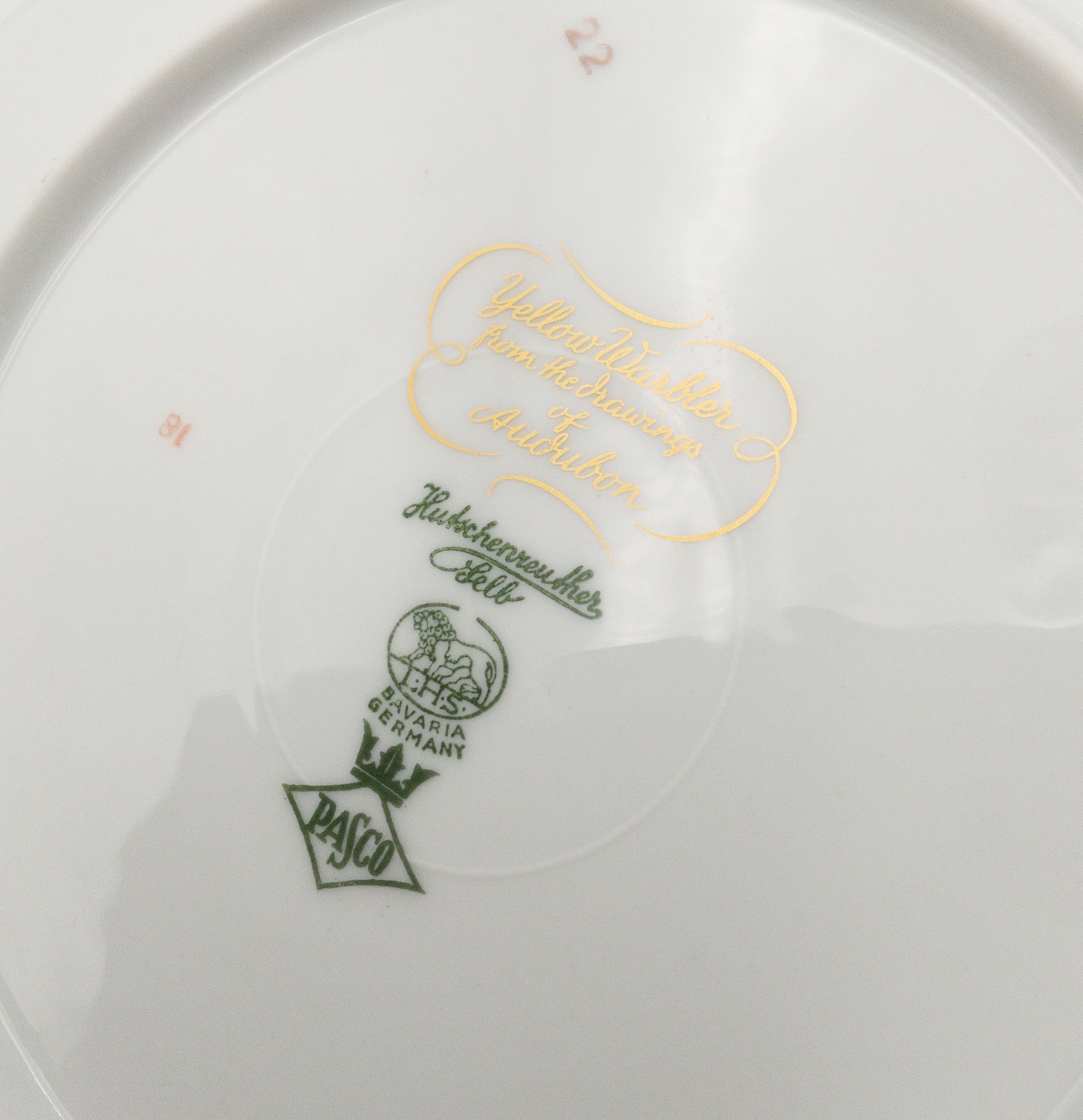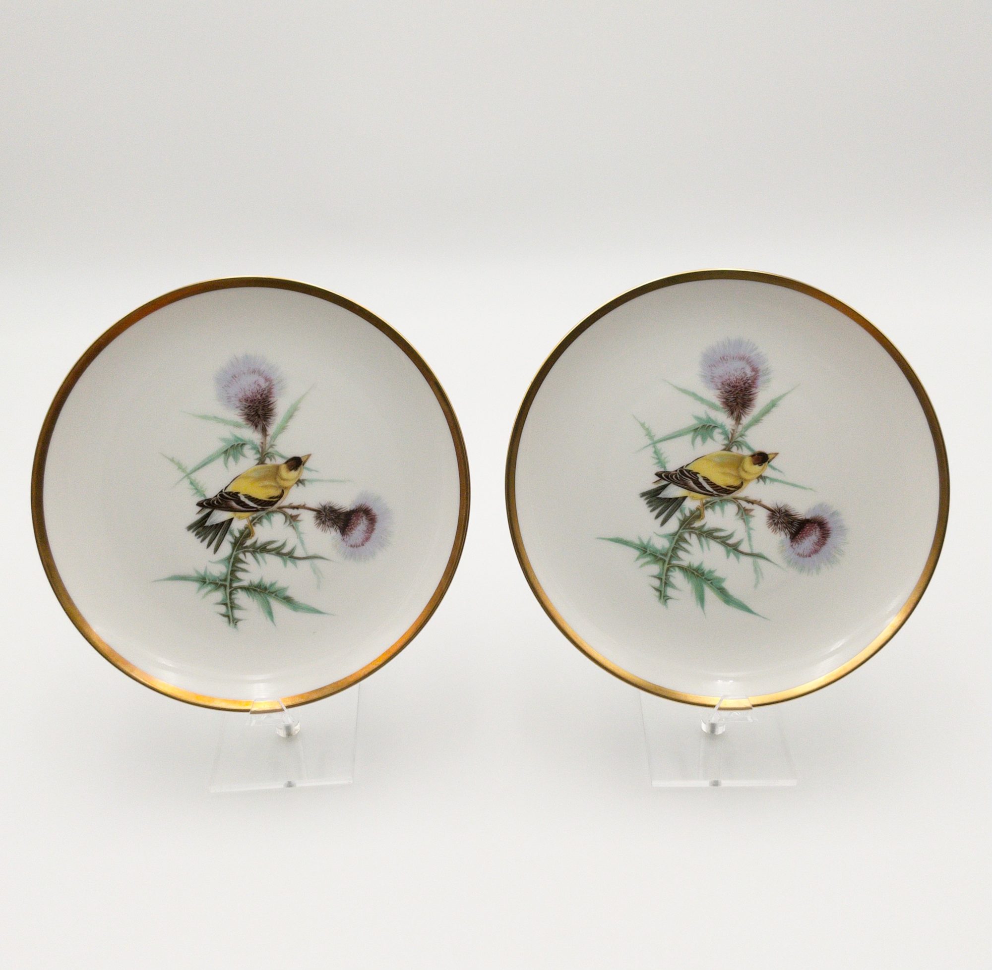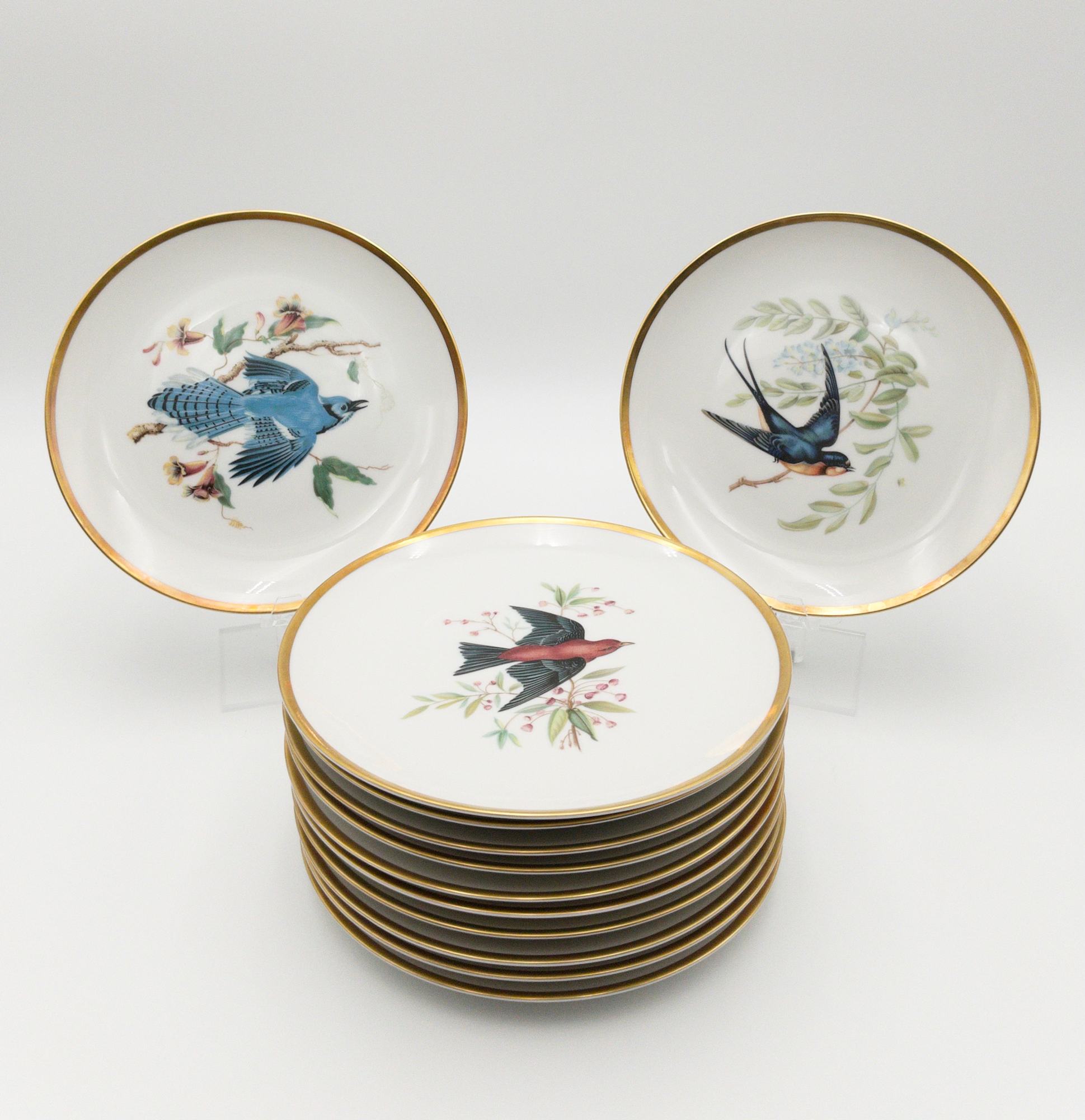 This set of twelve round plates from Hutschenreuther's Audubon collection is a beautiful addition for any bird lover or any dinnerware collection. Each plate features an incredibly illustrated bird from the drawings of Audubon. Each plate measures 8 inches in diameter. The plates were manufactured in Bavaria, Germany by PASCO/ Hutschenreuther Selb in the mid-20th century each with a gold rim and a glossy finish. The set includes 12 plates. 8 different designs, all marked on the bottom with the Hutschenreuther maker mark in green; titled in gold. The plates are original and not licensed reproductions. Perfect for dessert, salad, tea or any occasion. Birds included on each plate are listed below.