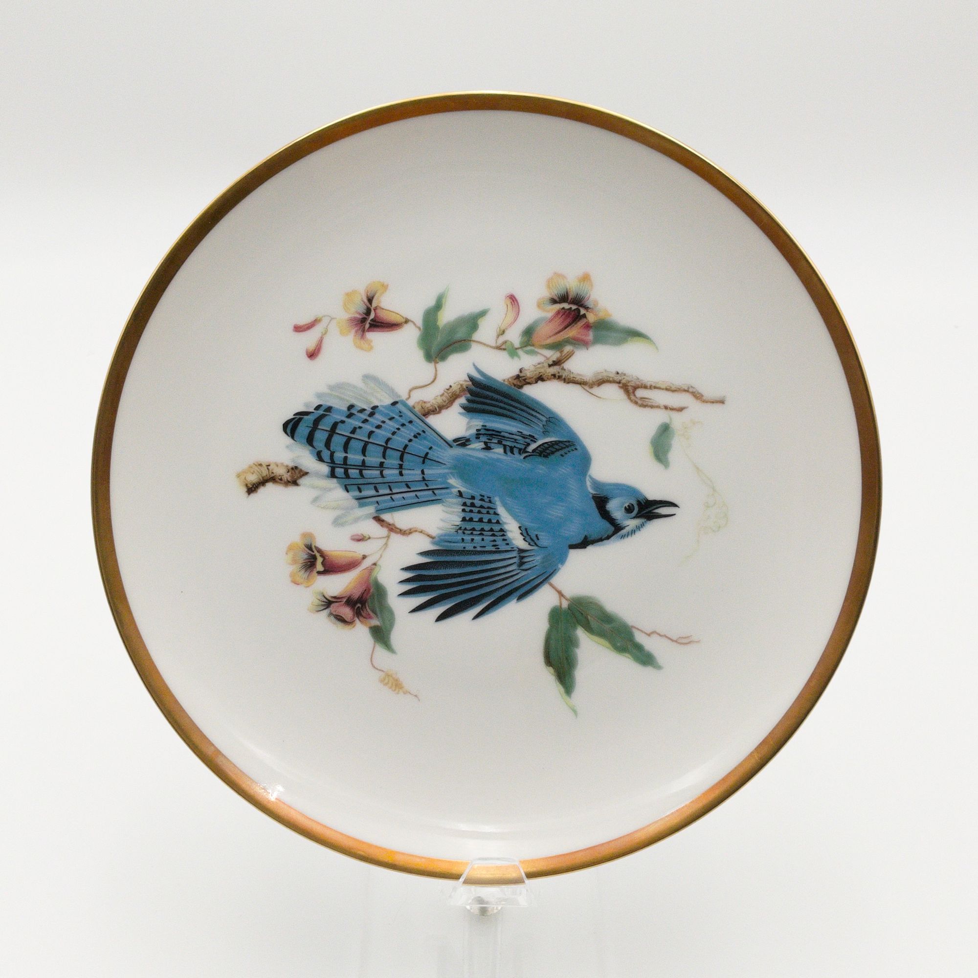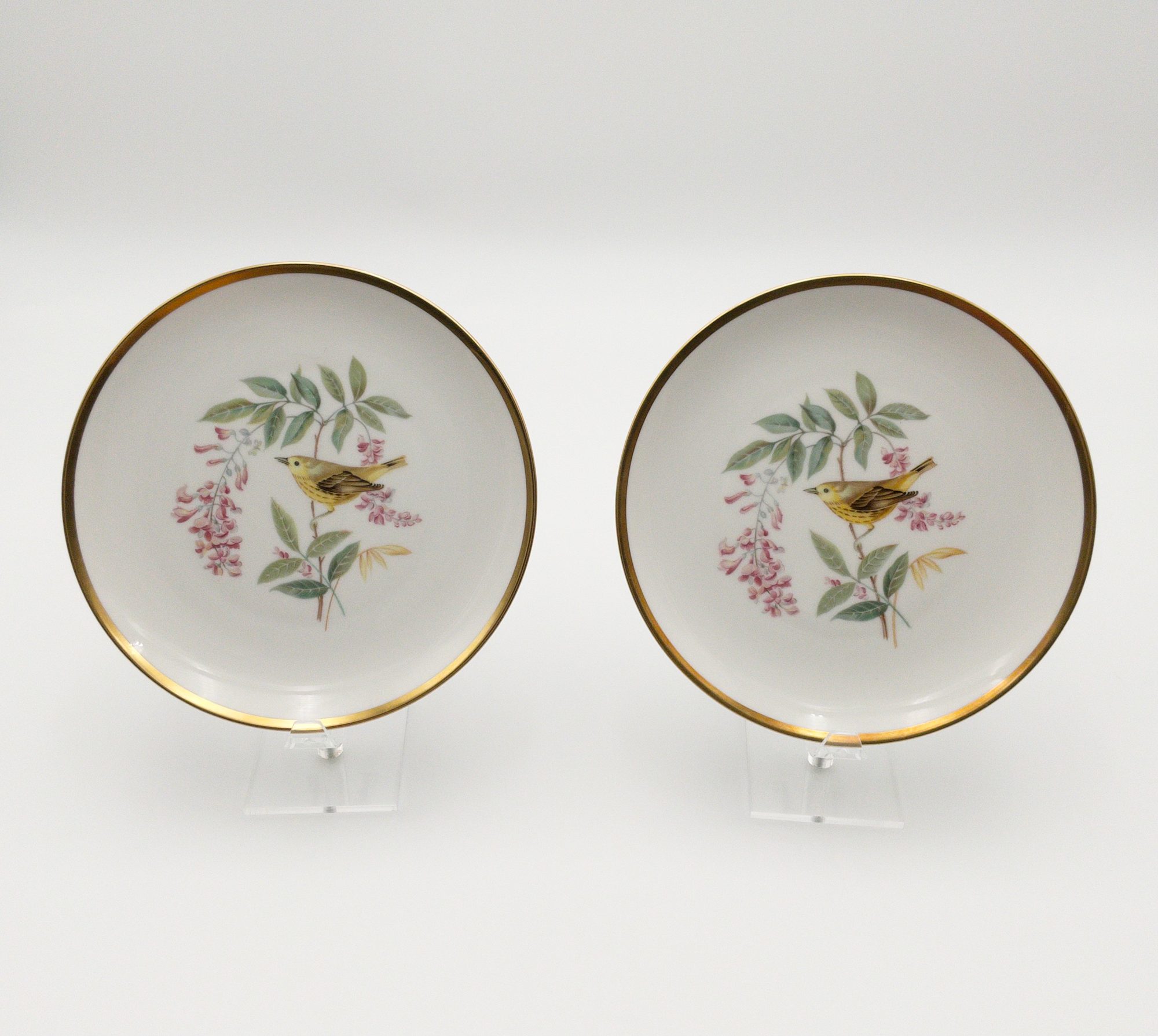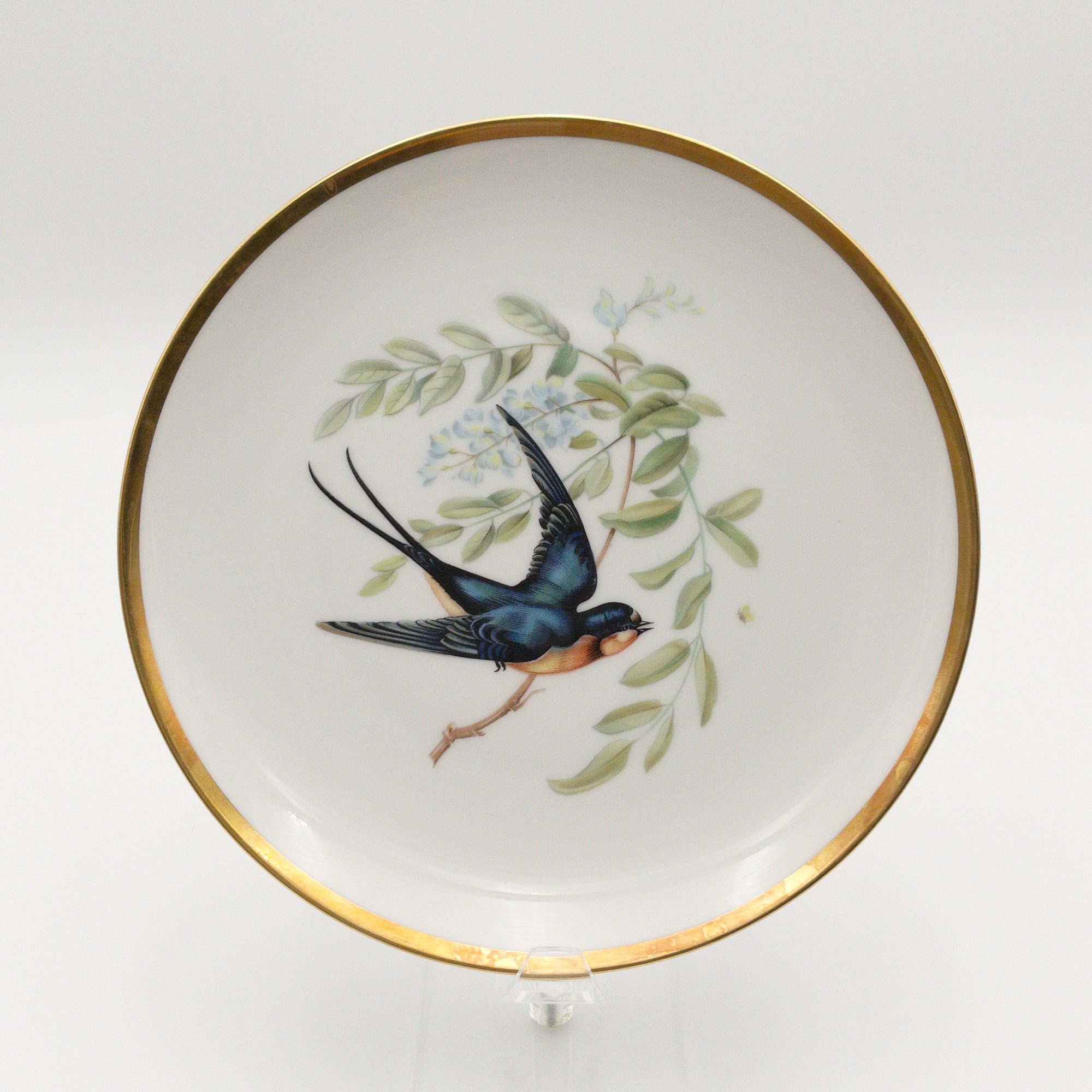 This set of twelve round plates from Hutschenreuther's Audubon collection is a beautiful addition for any bird lover or any dinnerware collection. Each plate features an incredibly illustrated bird from the drawings of Audubon. Each plate measures 8 inches in diameter. The plates were manufactured in Bavaria, Germany by PASCO/ Hutschenreuther Selb in the mid-20th century each with a gold rim and a glossy finish. The set includes 12 plates. 8 different designs, all marked on the bottom with the Hutschenreuther maker mark in green; titled in gold. The plates are original and not licensed reproductions. Perfect for dessert, salad, tea or any occasion. Birds included on each plate are listed below.