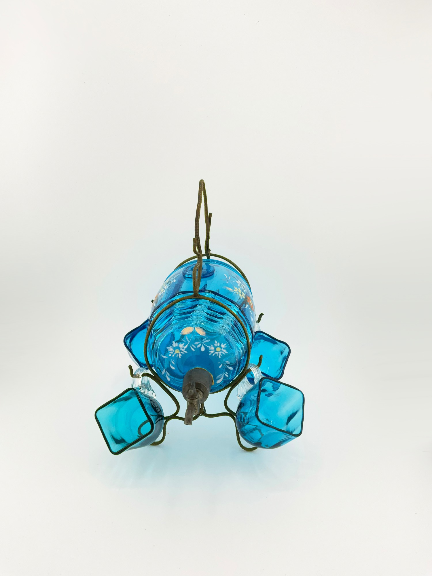 This antique liquor decanter set is a stunning addition to any barware collection. The set includes a beautiful hand painted blue glass decanter with a barrel/keg shape, perfect for all occasions. The decanter has a diameter of 3 inches, a length of 4 inches, and a height of 7.75 inches. The set also includes 4 incredible blown glasses and a brass stand holder with a rack/holder and handle. This original piece is perfect for collectors and enthusiasts alike.