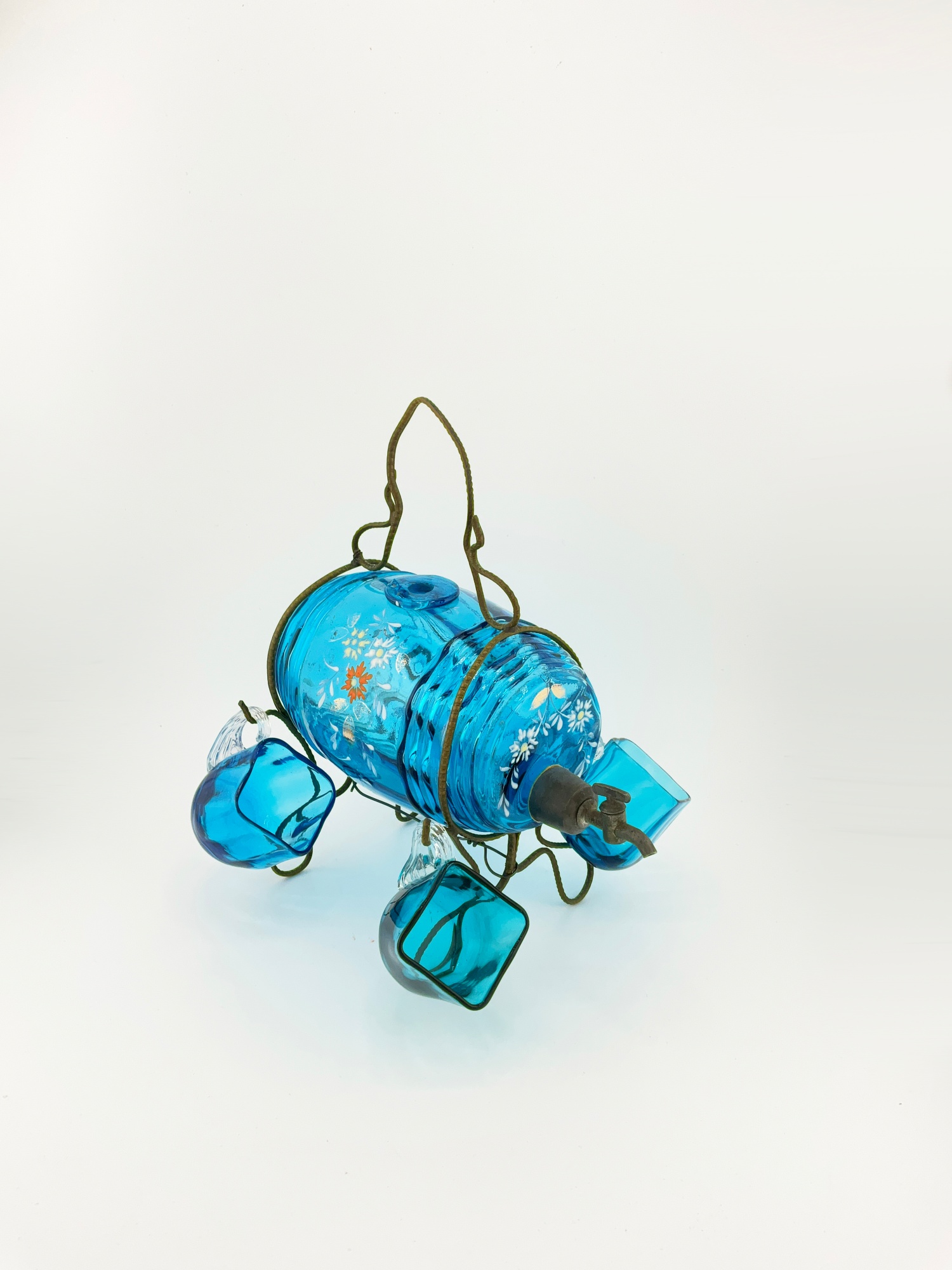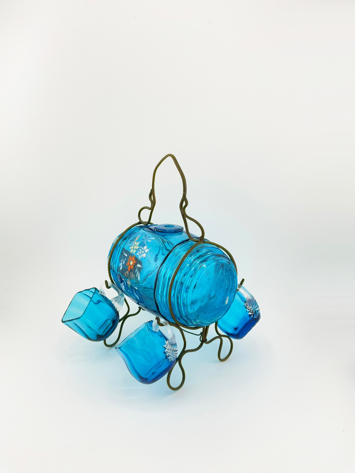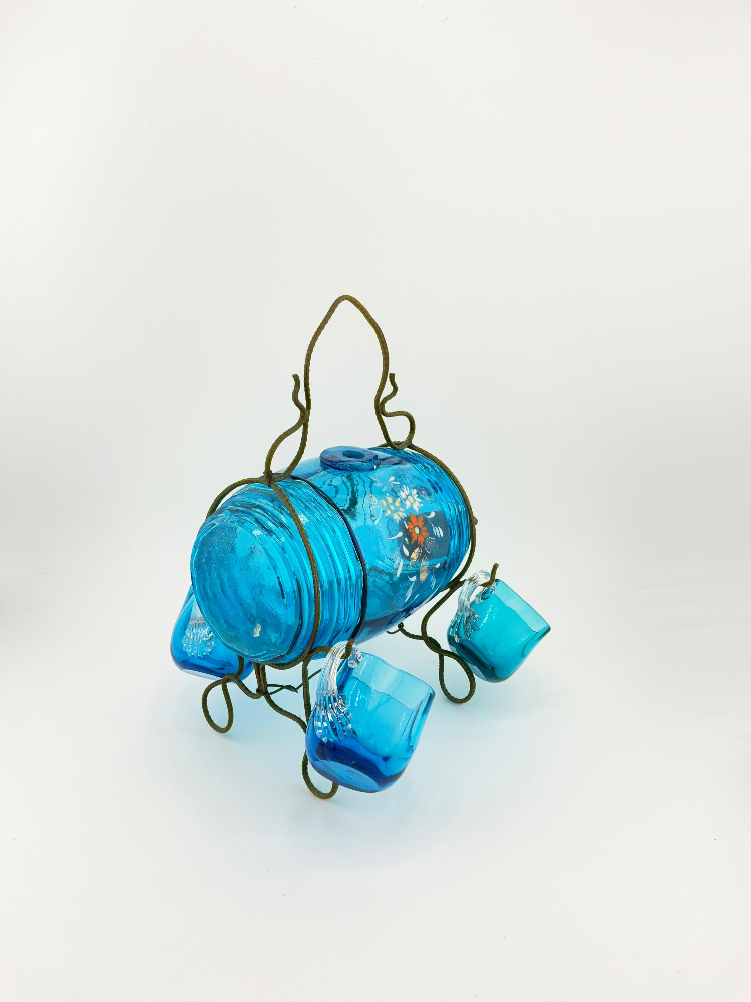 MINI ANTIQUE HAND PAINTED BLUE FLORAL GLASS DECANTER / KEG BARREL WITH GLASSES (SET OF 5)