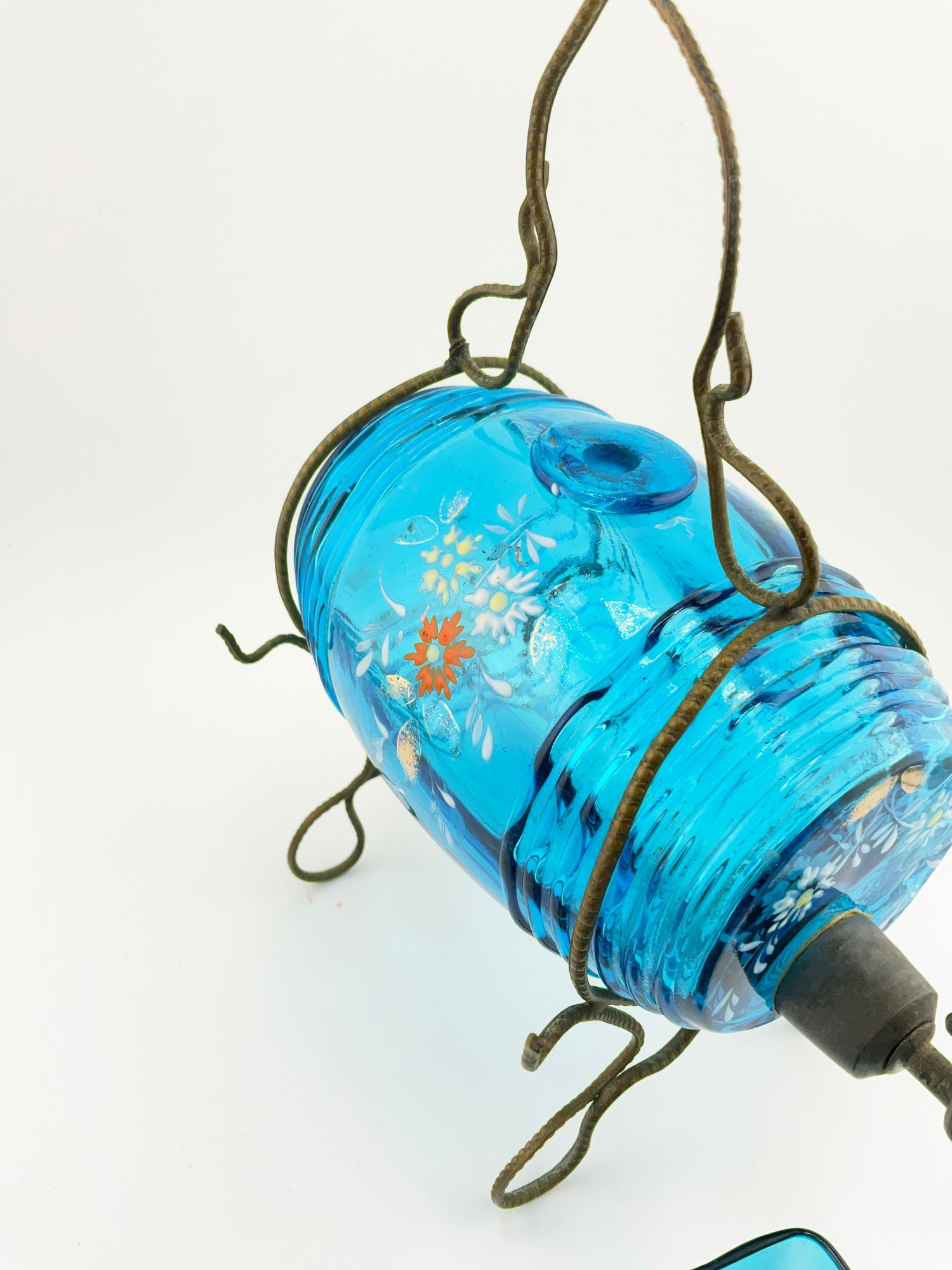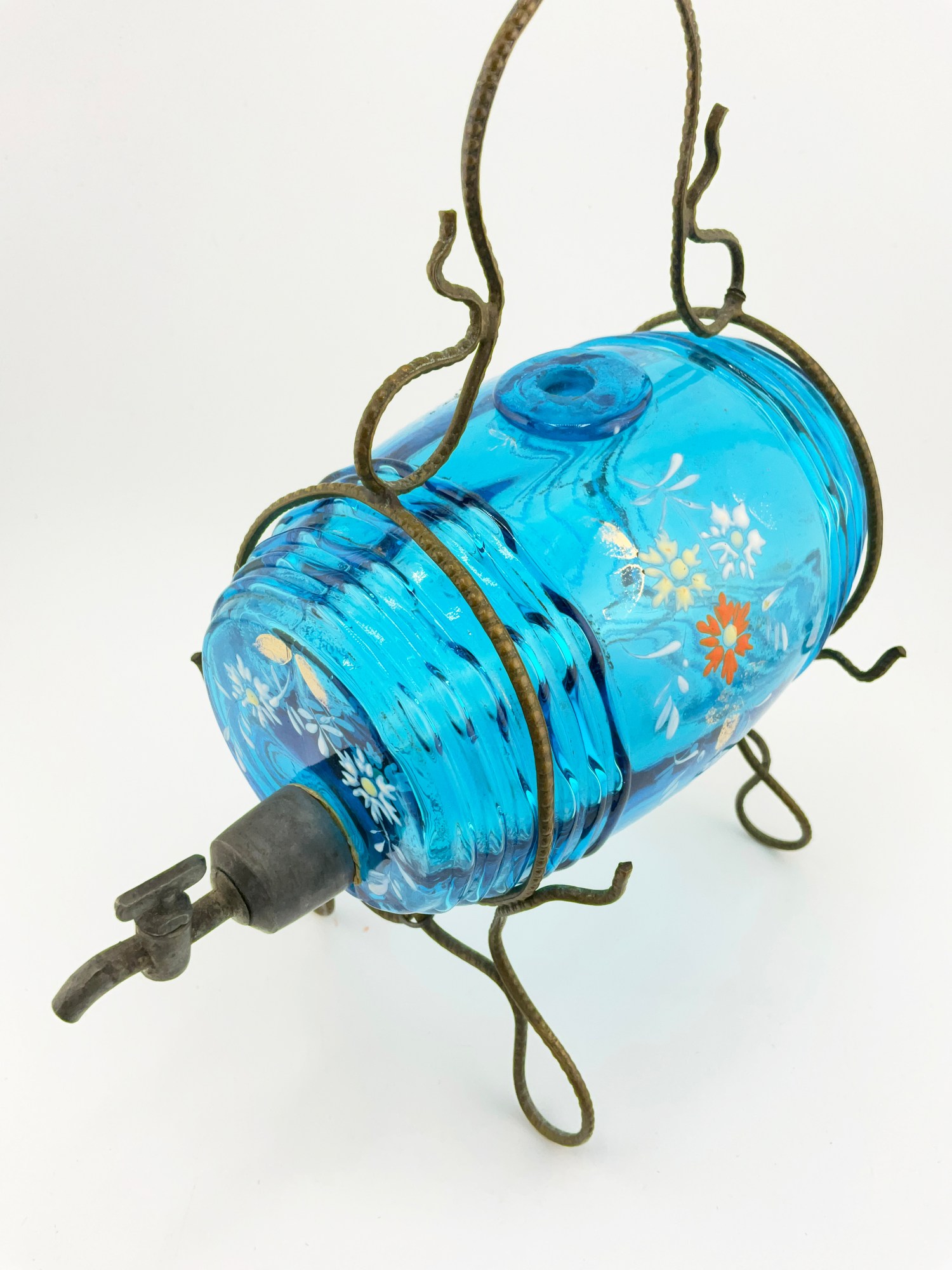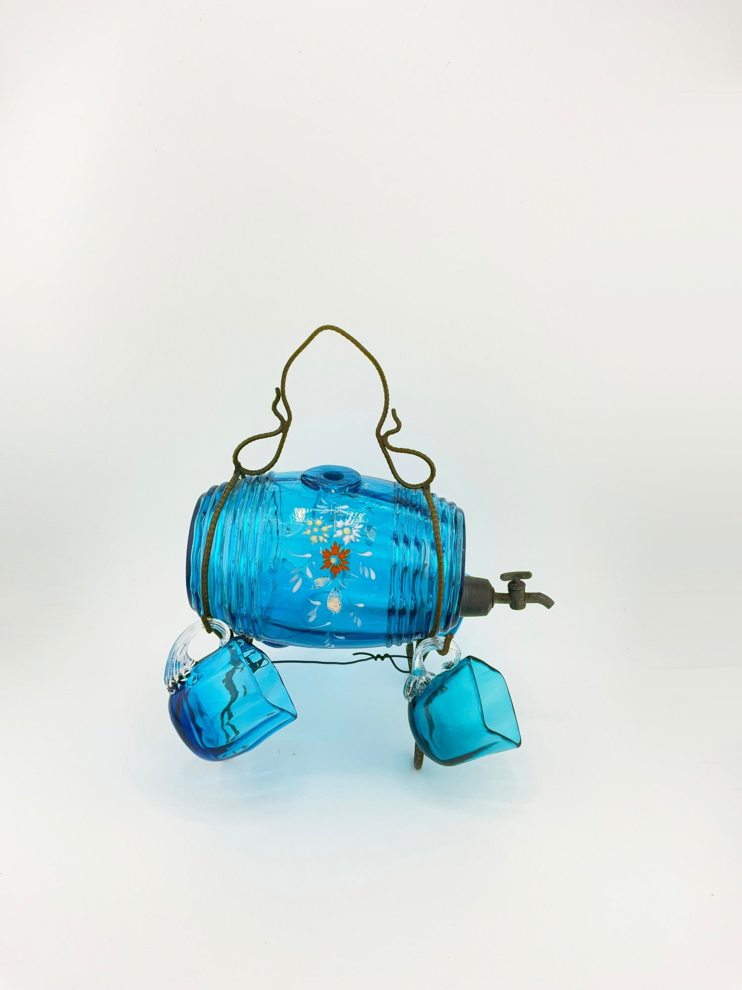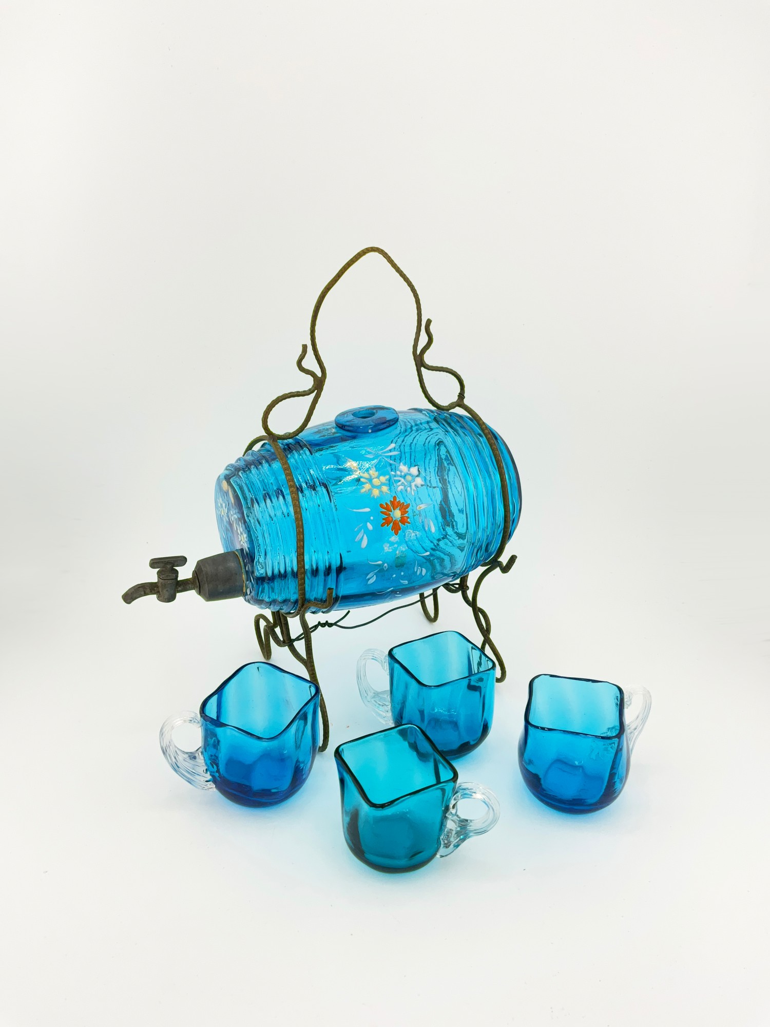 MINI ANTIQUE HAND PAINTED BLUE FLORAL GLASS DECANTER / KEG BARREL WITH GLASSES (SET OF 5)