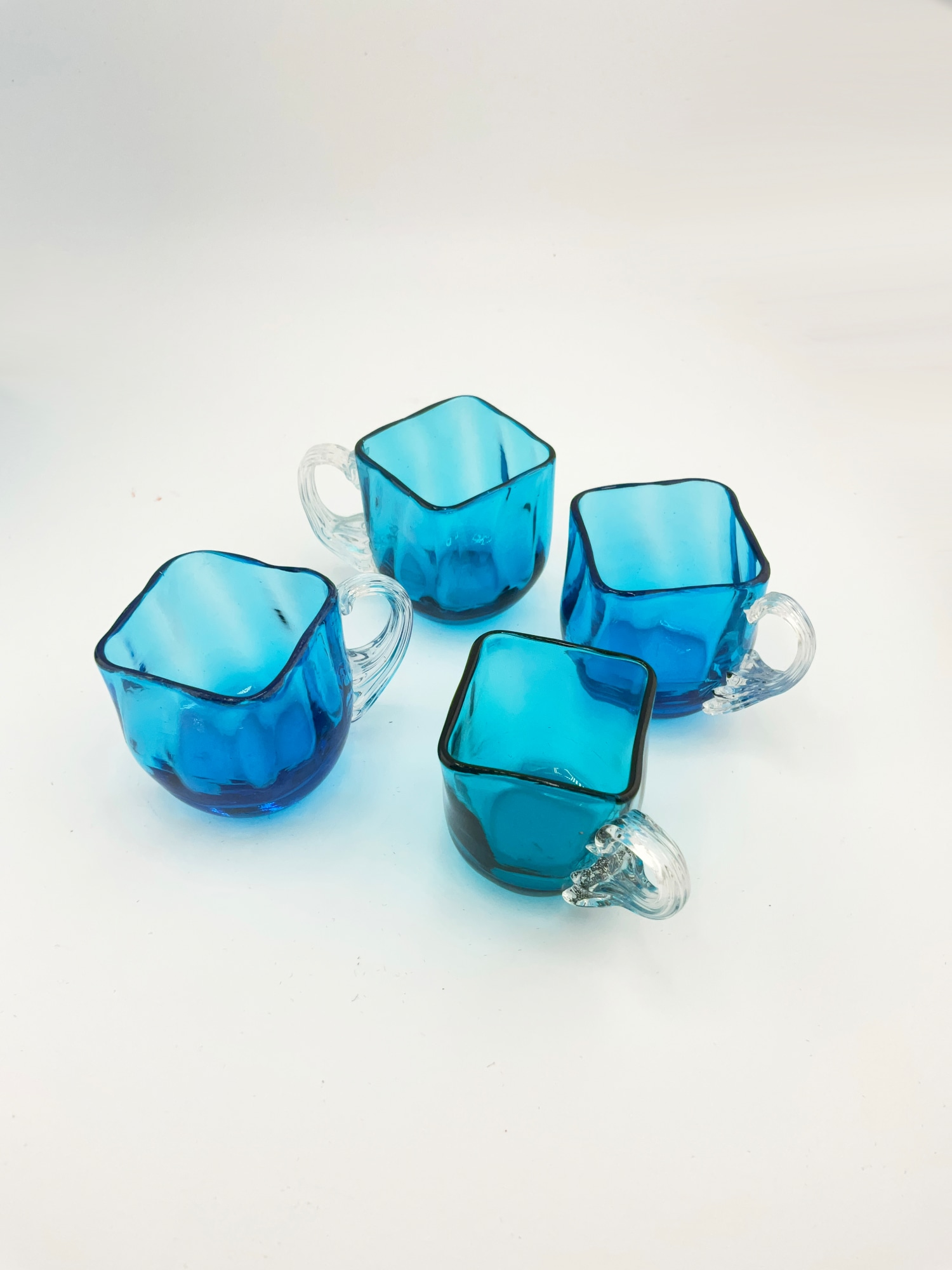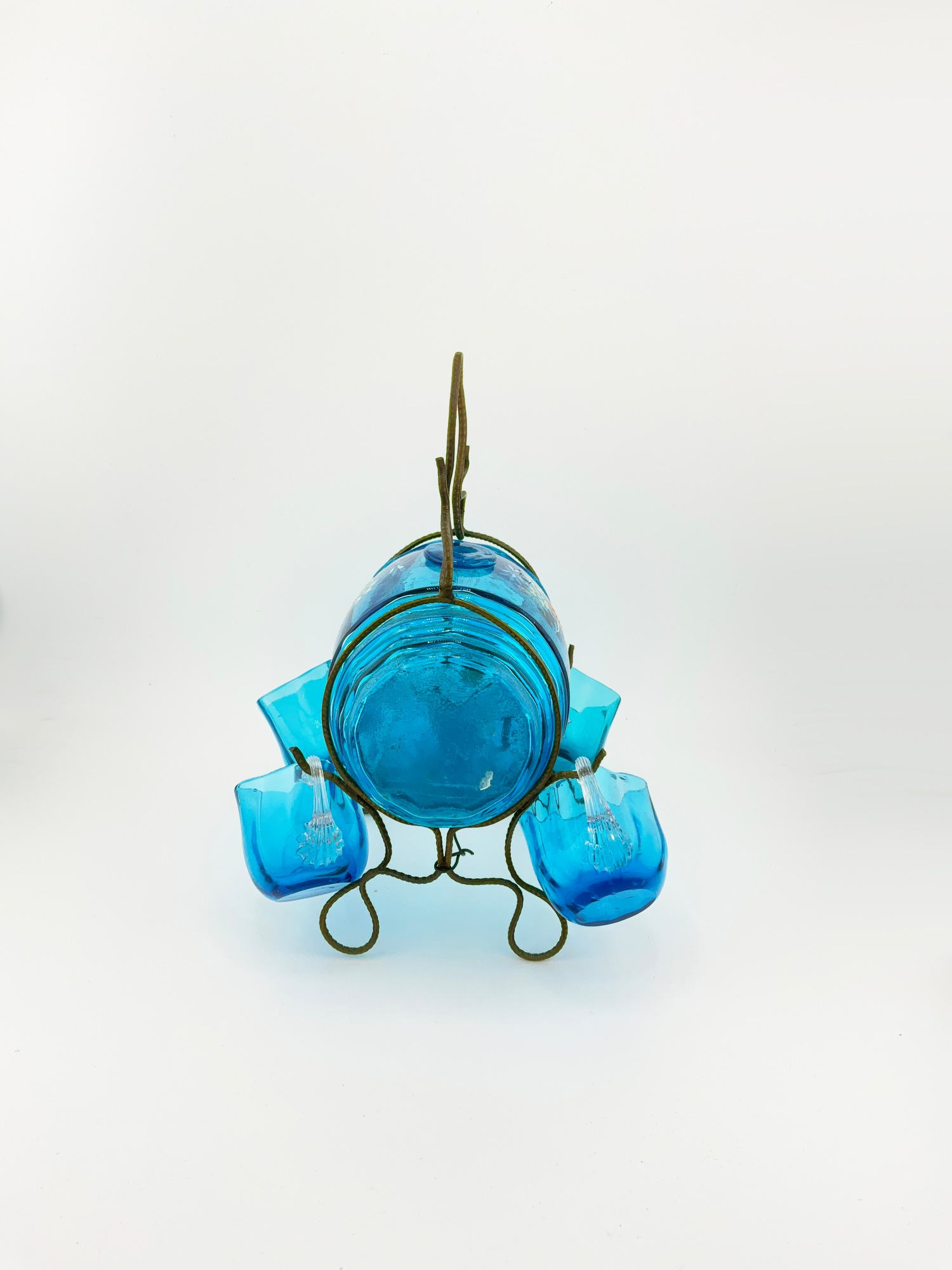 This antique liquor decanter set is a stunning addition to any barware collection. The set includes a beautiful hand painted blue glass decanter with a barrel/keg shape, perfect for all occasions. The decanter has a diameter of 3 inches, a length of 4 inches, and a height of 7.75 inches. The set also includes 4 incredible blown glasses and a brass stand holder with a rack/holder and handle. This original piece is perfect for collectors and enthusiasts alike.