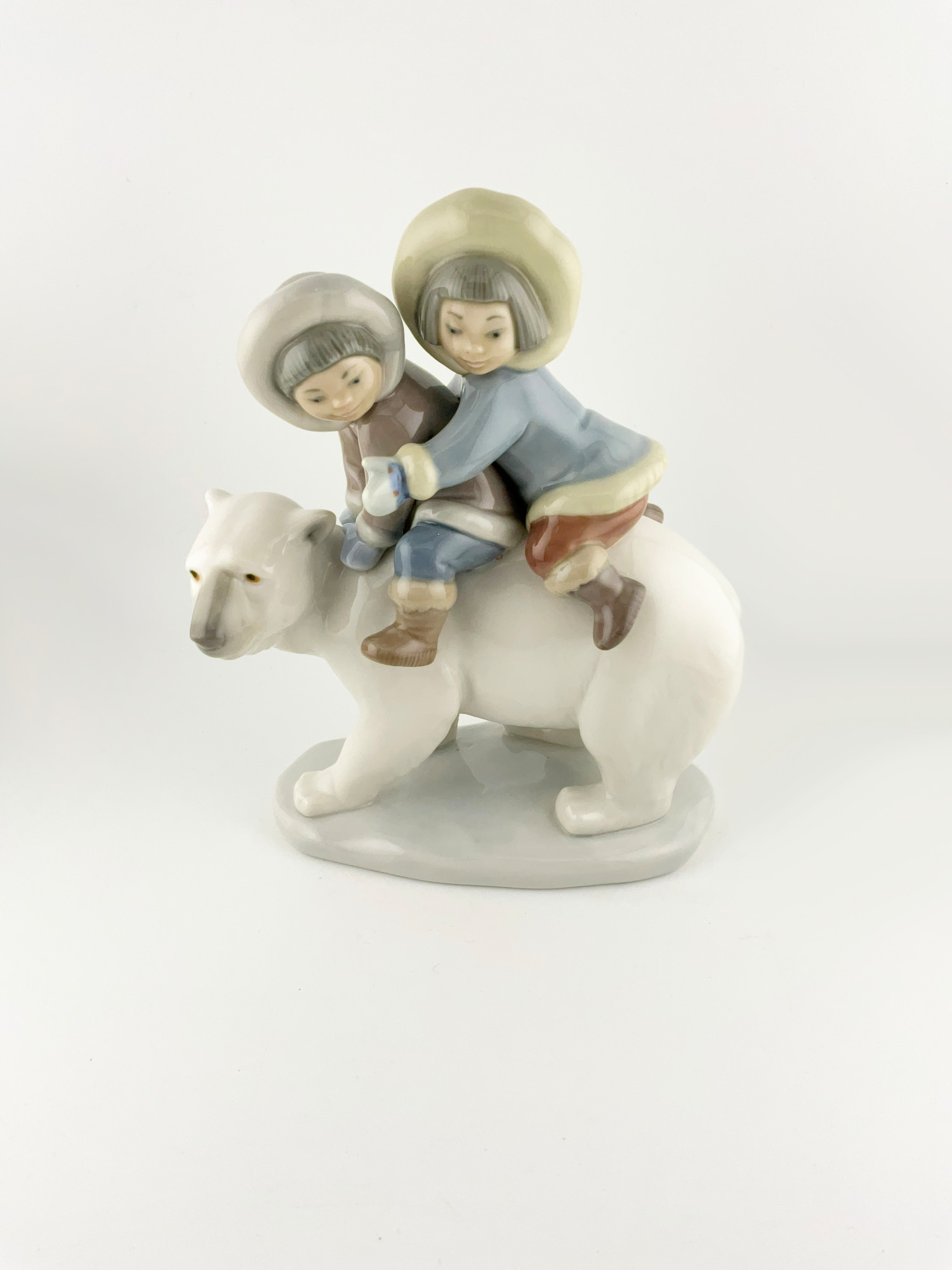 This beautiful Lladró porcelain figurine by the Spanish sculptor, José Puche features a stunning scene of two small Eskimo children riding on a Polar bear. Handmade in Spain this figurine is a true masterpiece. Measuring 5.5 inches in length, 7 inches in height, and 3 inches in width, this medium-sized figurine is perfect for any room and any occasion. The glossy finish and multicolor design make this figurine a true gem in any collection. It comes unboxed and is an original piece, not a reproduction. This retired figurine from the "Eskimo Riders" collection is a must-have for any collector of animal-themed decorative collectibles..