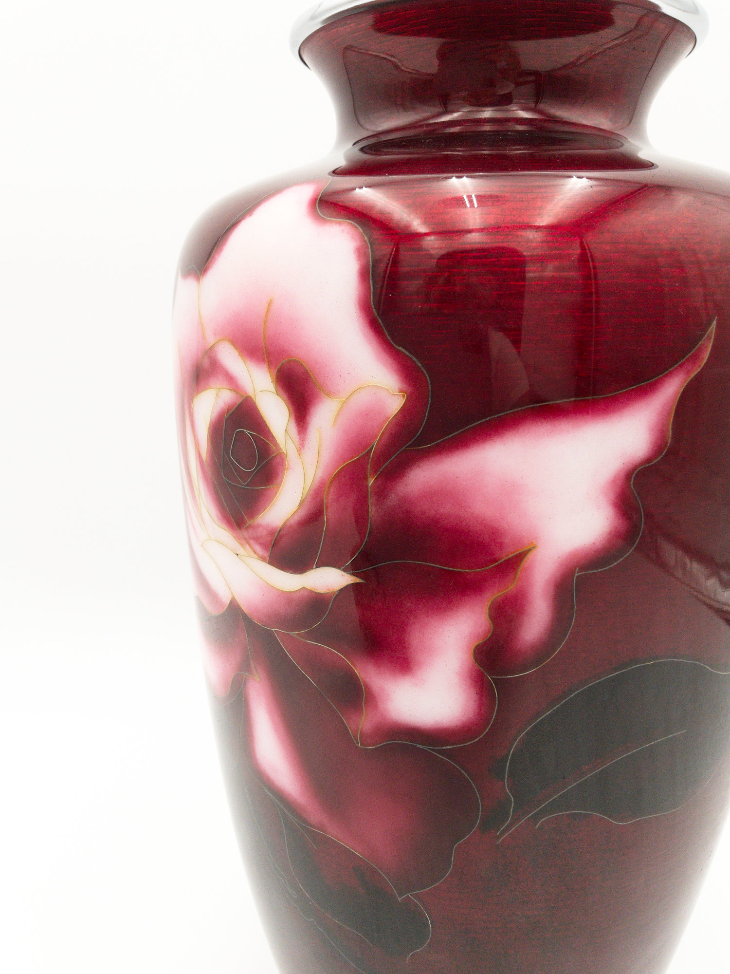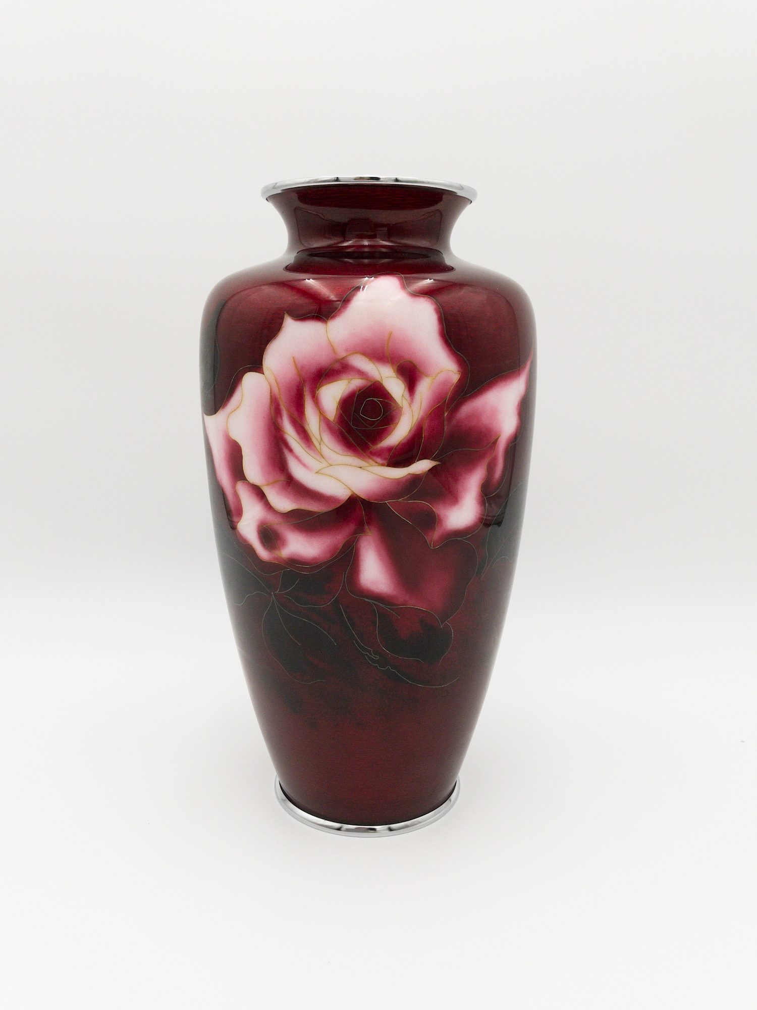 This exquisite vase is a stunning piece of Japanese artistry. The intricate design features a beautiful rose in a rich pigeon blood/foil back style. Crafted from high-quality cloisonne enamel, this vase is a true masterpiece. Made by the renowned Ando brand, this vase is a testament to the rich culture of Japanese art. Measuring 12.5 inches in height and 7 inches in width it is a perfect addition to any collection.
