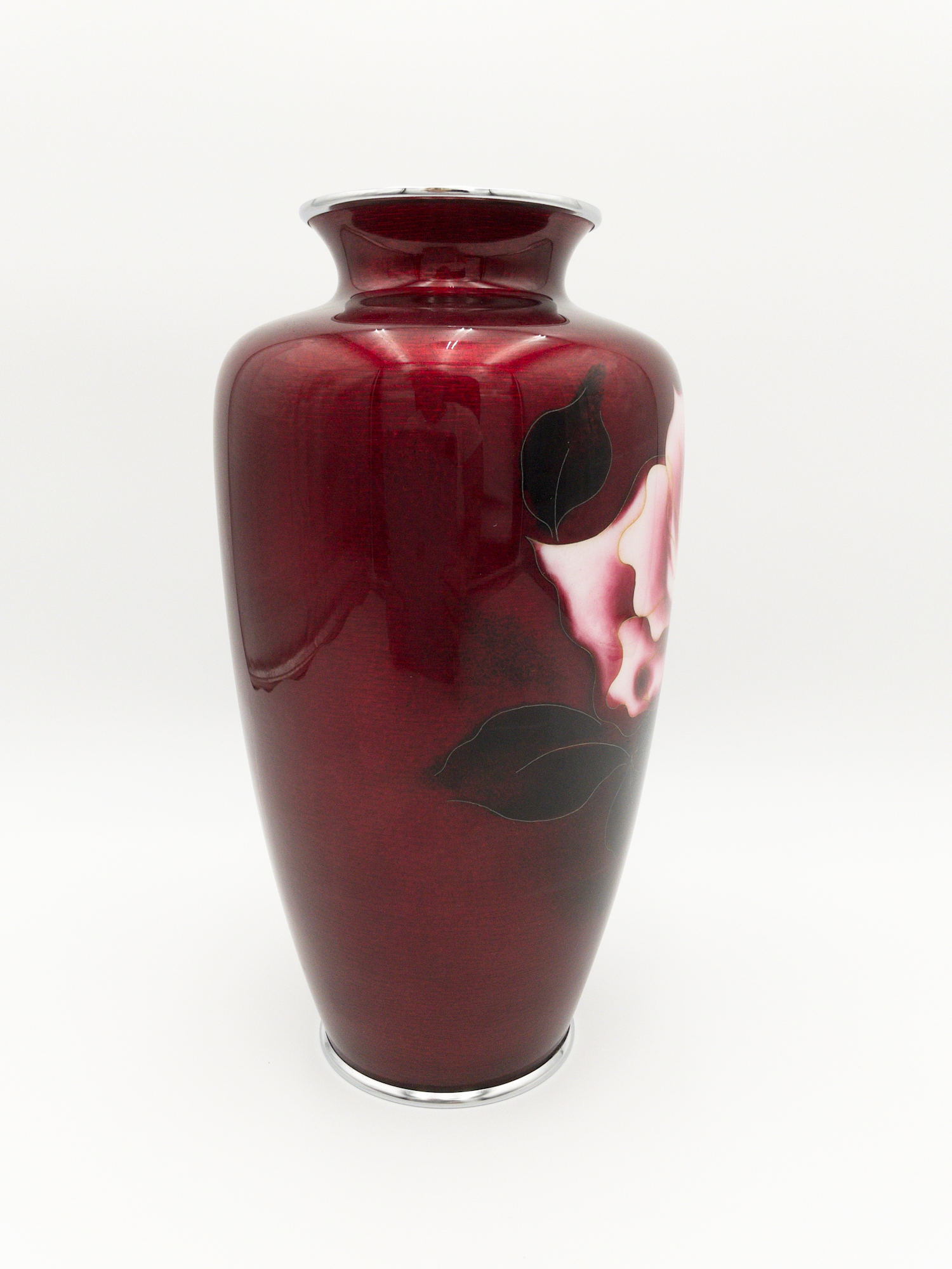 ORIGINAL JAPANESE ANDO JUBEI CLOISONNE RED GINBARI ROSE ENAMEL VASE (12.5")