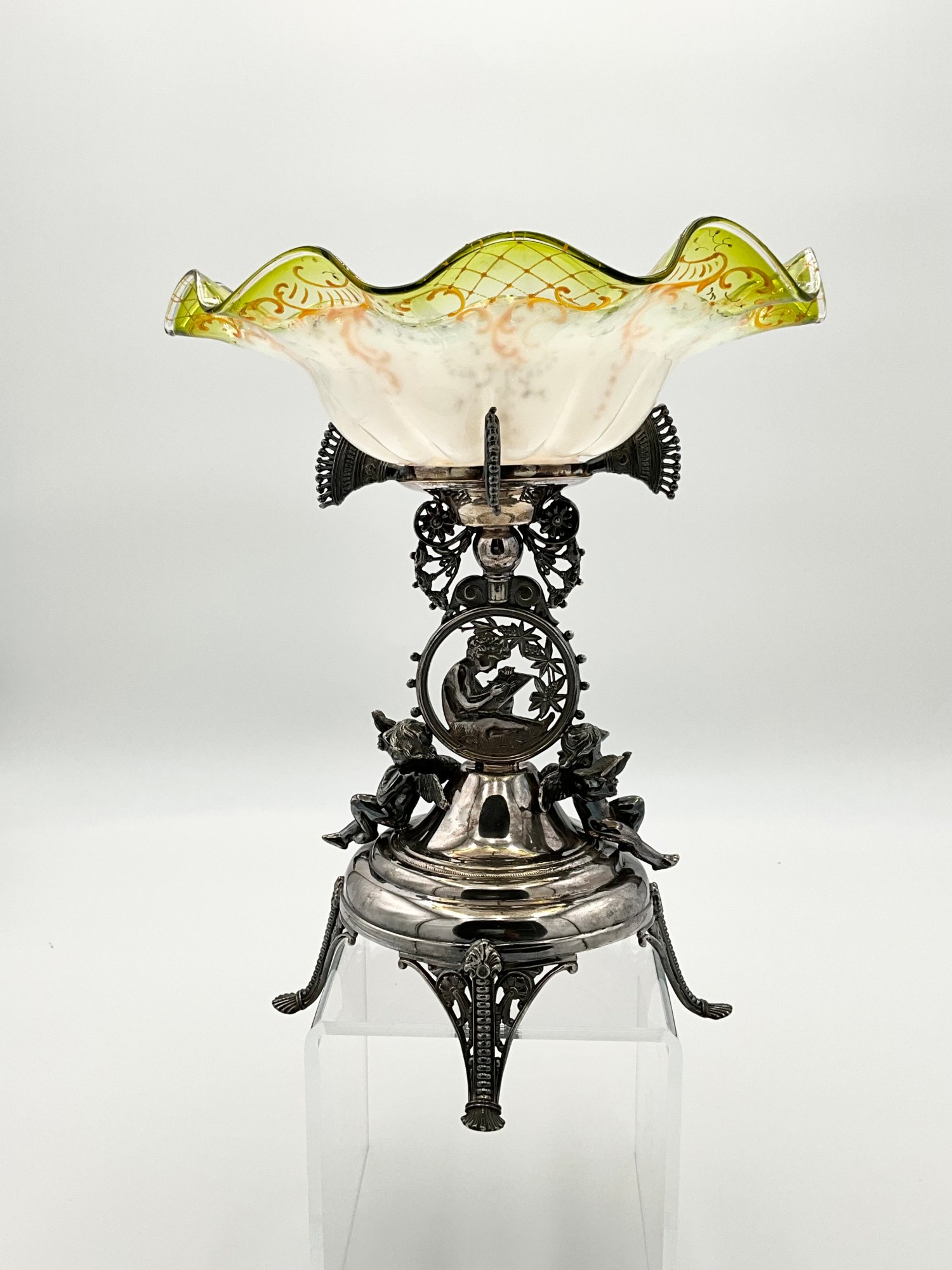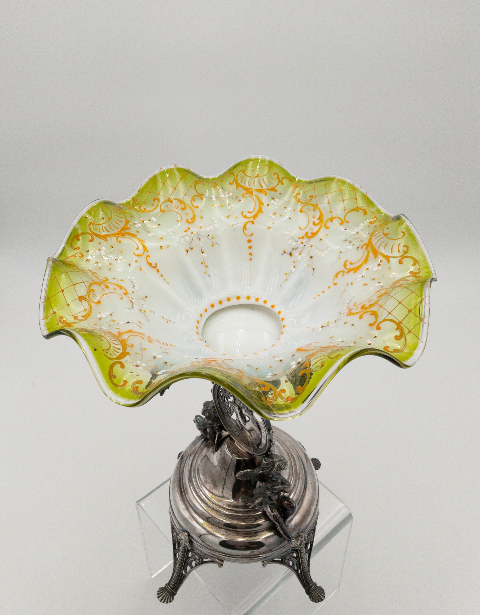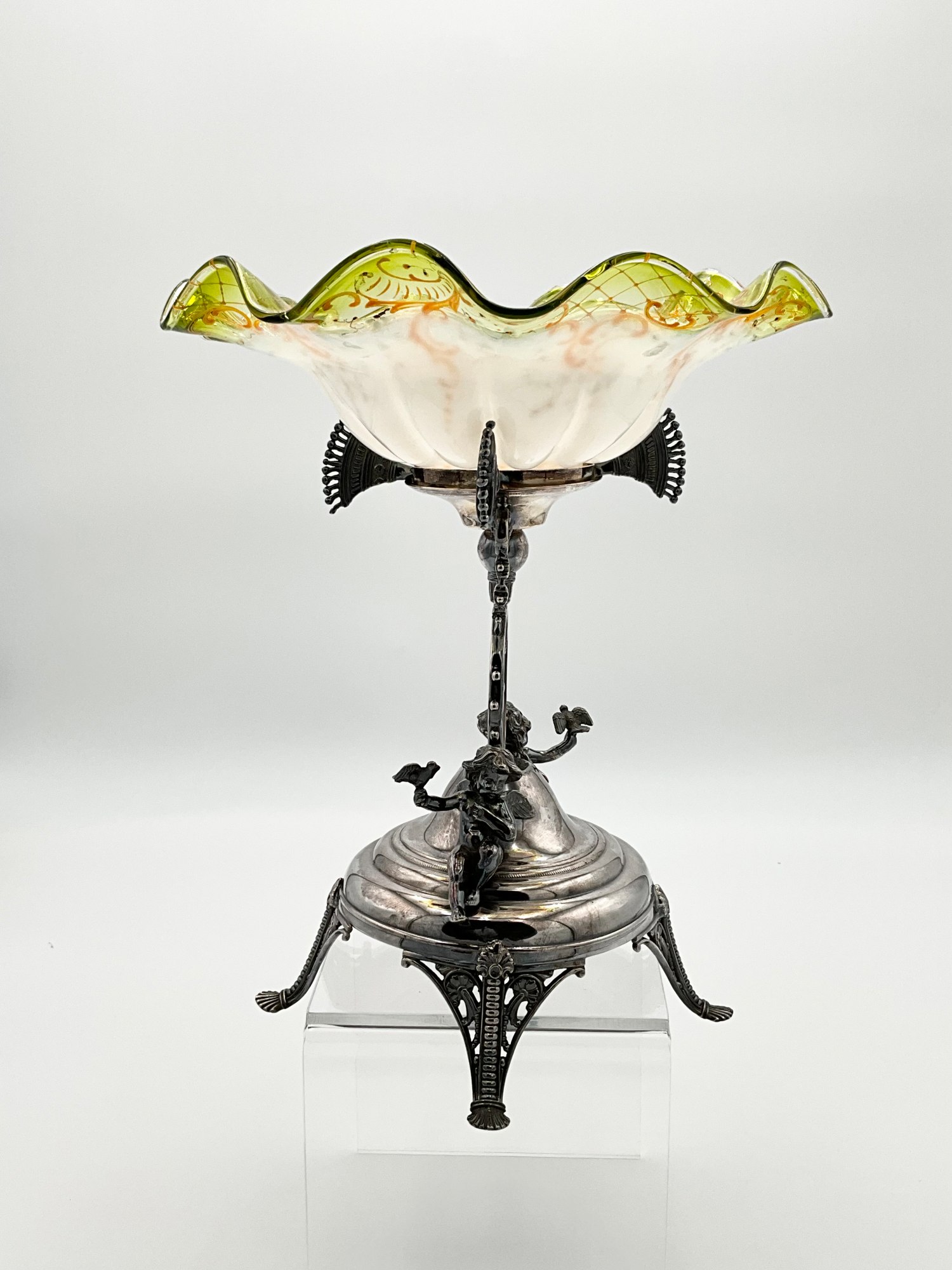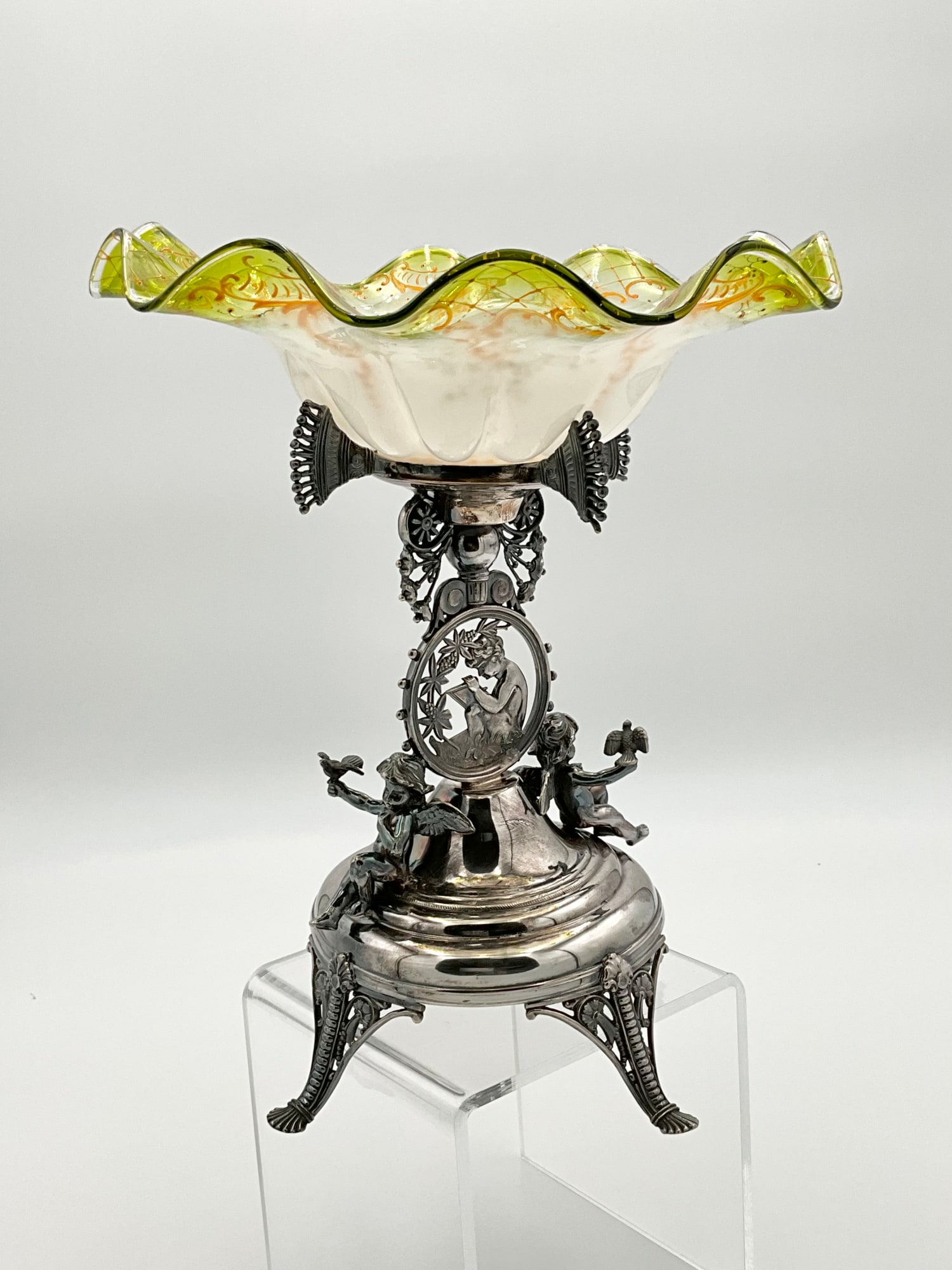 Add a touch of elegance to your dining table with this stunning Rogers Smith & Co. glass compote. The Victorian-style brides basket features a hand painted pattern on white translucent glass with a clear yellow rim . It stands at a height of 13.5 inches and has a width of 10.75 inches, making it the perfect size for serving fruits or other desserts. Crafted between 1900-1940, this antique piece is a gorgeous addition to any collection. It weighs 3 lbs 2 oz. and comes with a silver plated stand. The silver stand is meticulously detailed showing a cherub in the middle writing and two additional cherubs on either side holding birds. Marked on the bottom with the makers mark reading: ROGERS SMITH & CO; NEW HAVEN CONN.