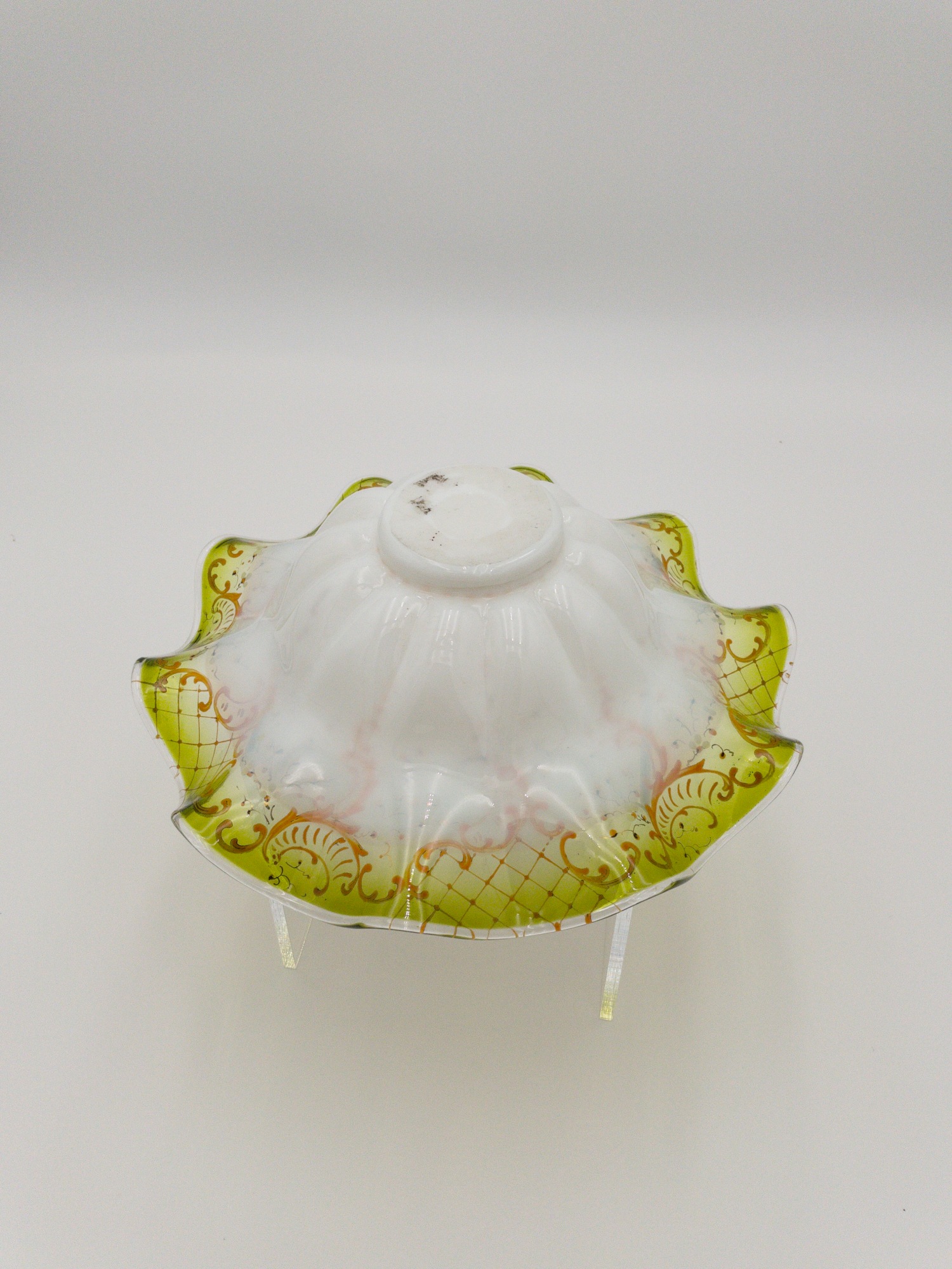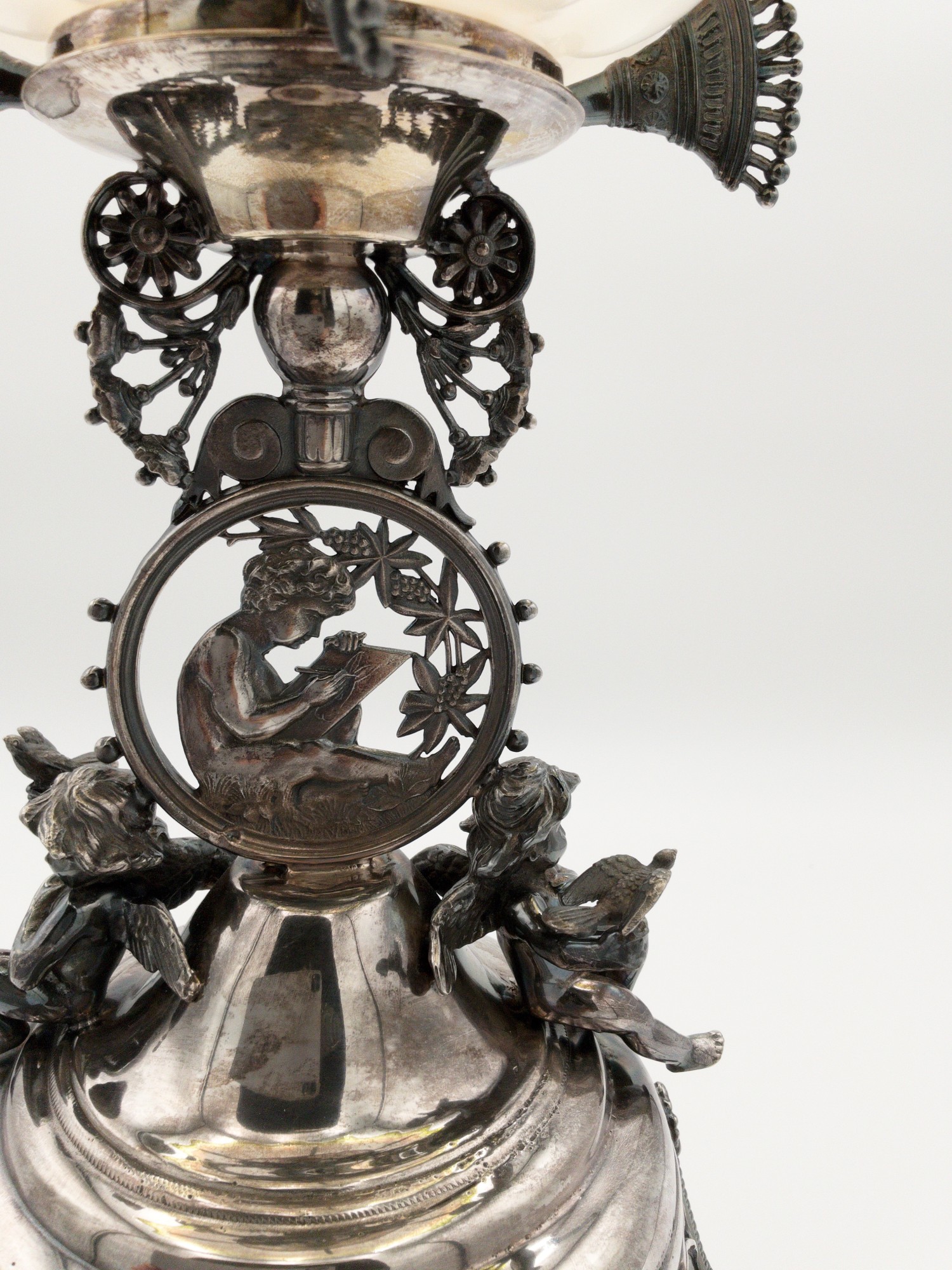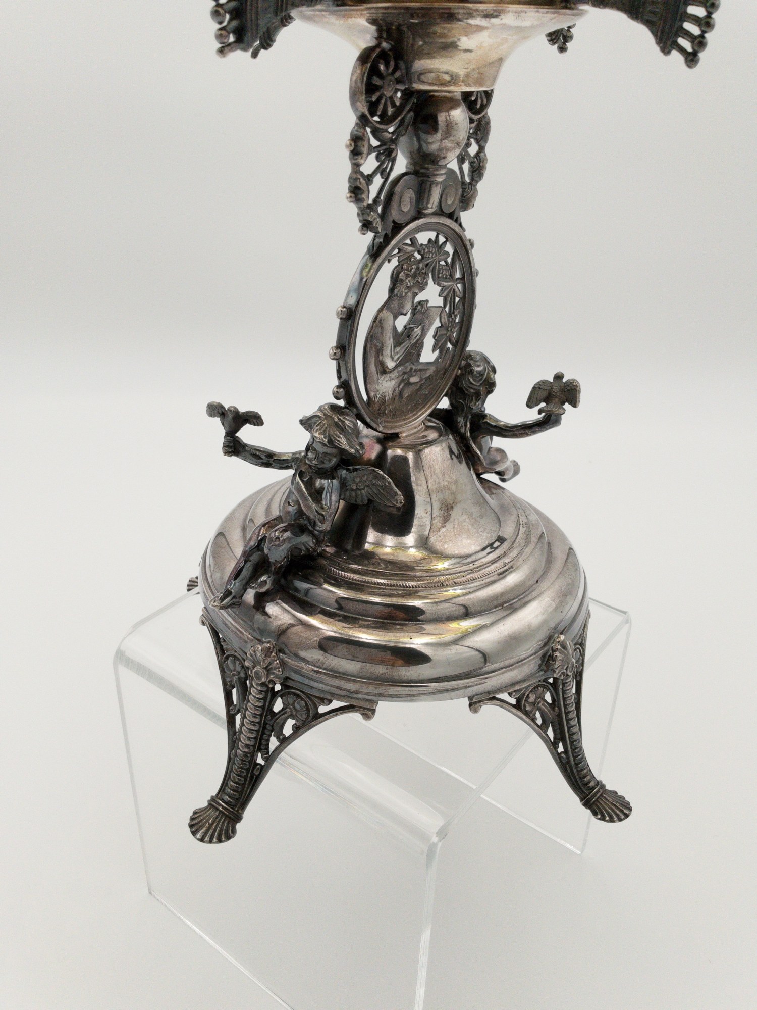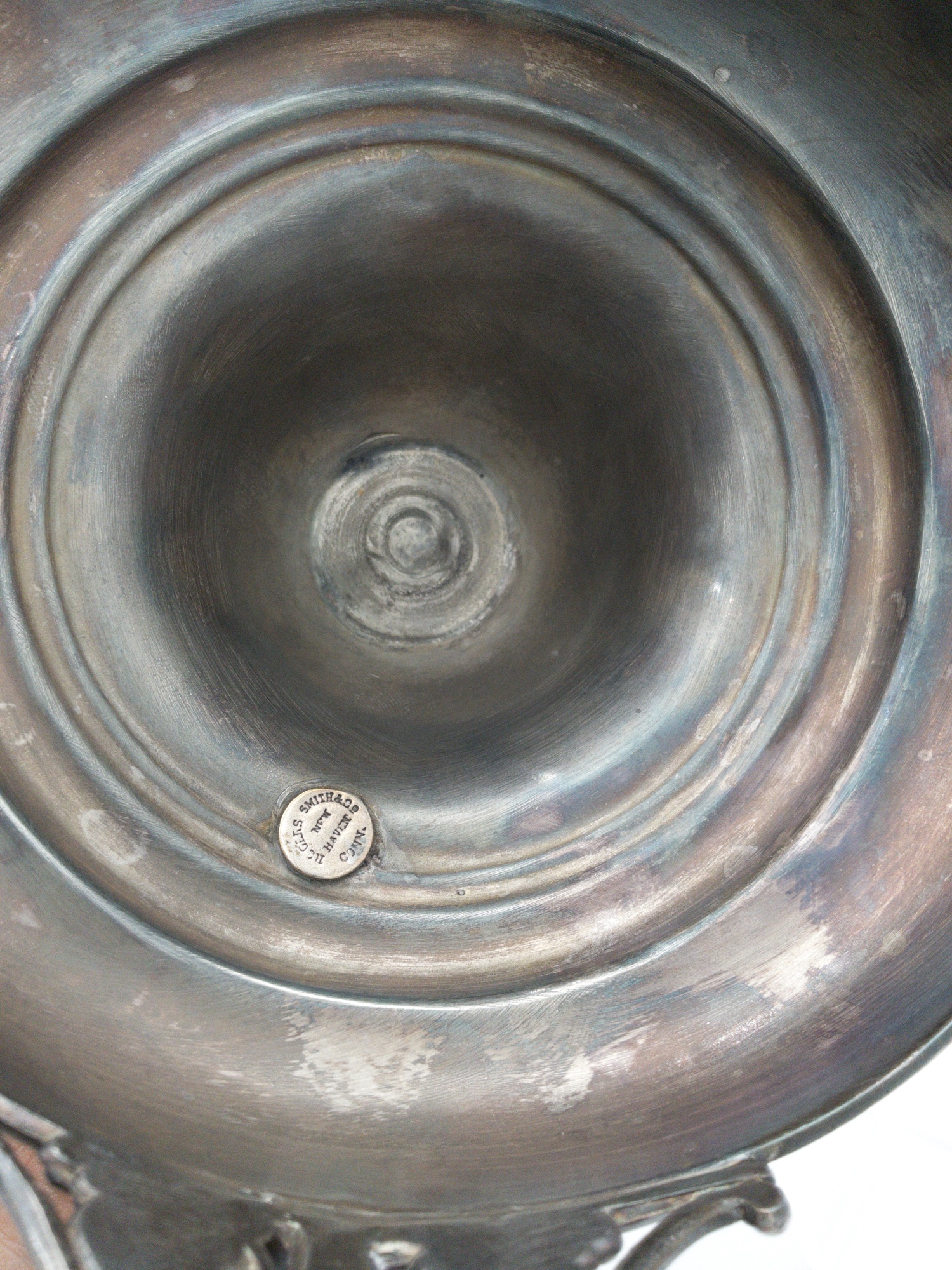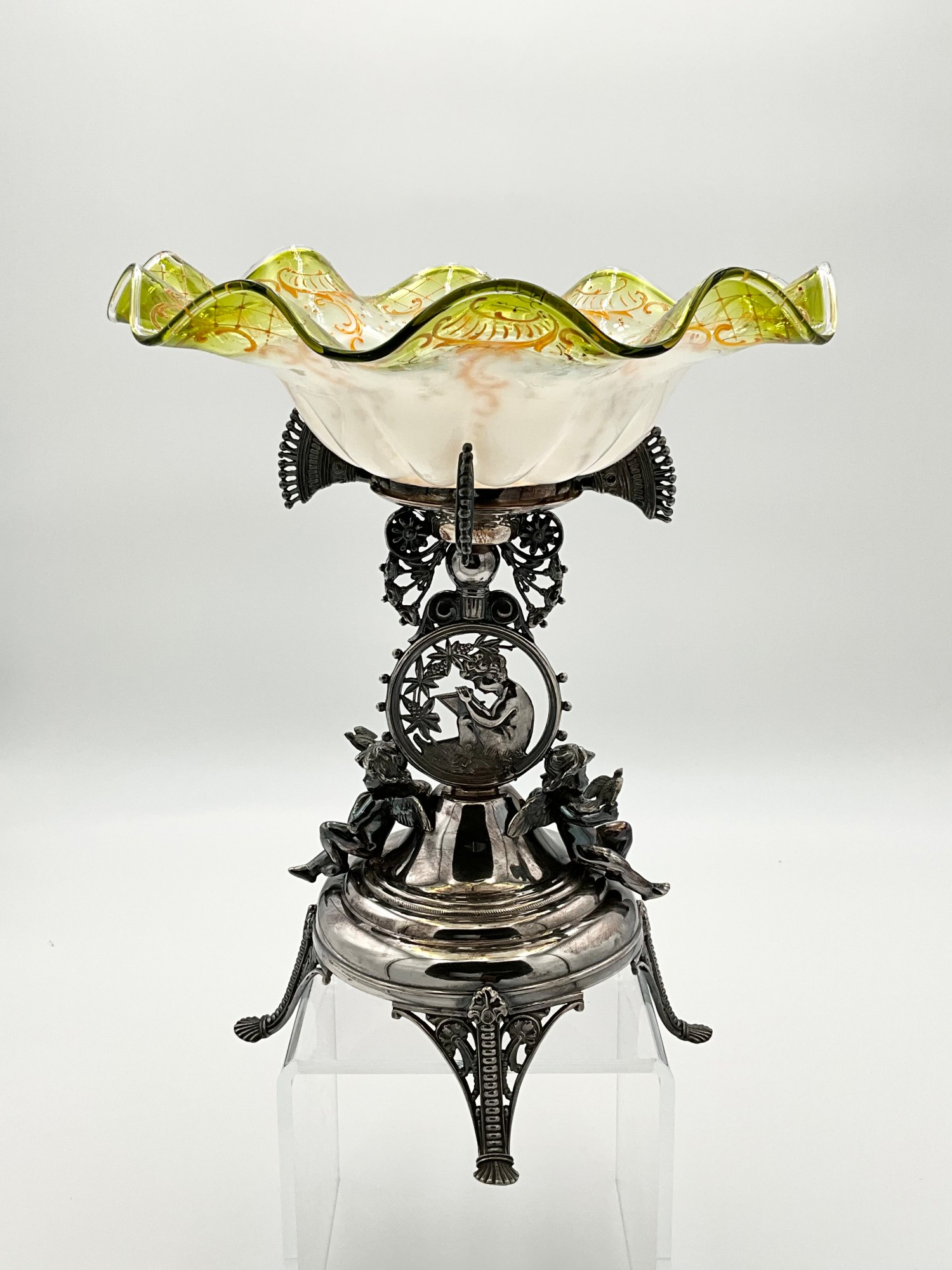 Add a touch of elegance to your dining table with this stunning Rogers Smith & Co. glass compote. The Victorian-style brides basket features a hand painted pattern on white translucent glass with a clear yellow rim . It stands at a height of 13.5 inches and has a width of 10.75 inches, making it the perfect size for serving fruits or other desserts. Crafted between 1900-1940, this antique piece is a gorgeous addition to any collection. It weighs 3 lbs 2 oz. and comes with a silver plated stand. The silver stand is meticulously detailed showing a cherub in the middle writing and two additional cherubs on either side holding birds. Marked on the bottom with the makers mark reading: ROGERS SMITH & CO; NEW HAVEN CONN.