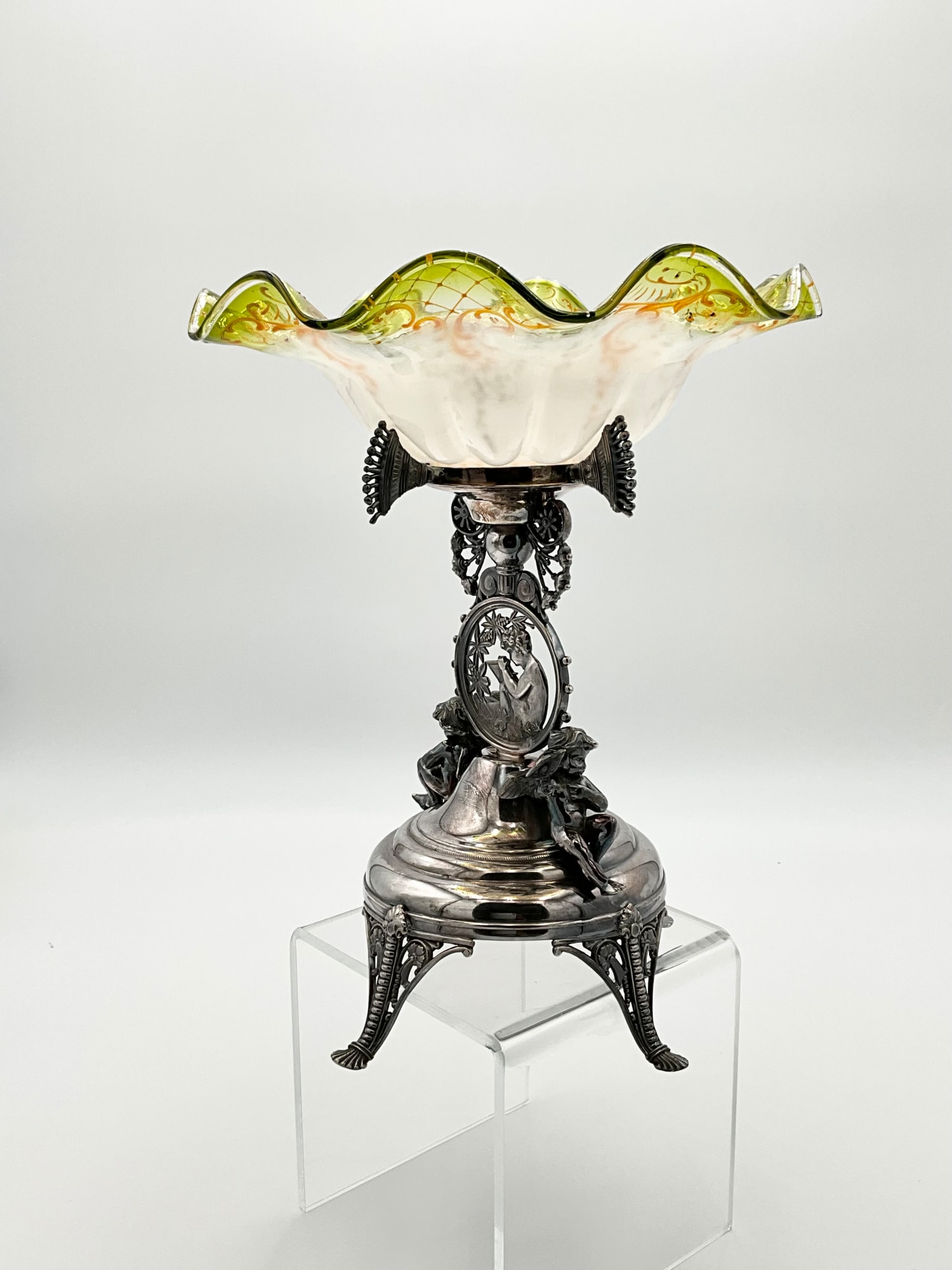 ROGERS SMITH & CO. GLASS COMPOTE FRILLED BRIDES BASKET W/ FIGURAL SILVER PLATED METAL STAND