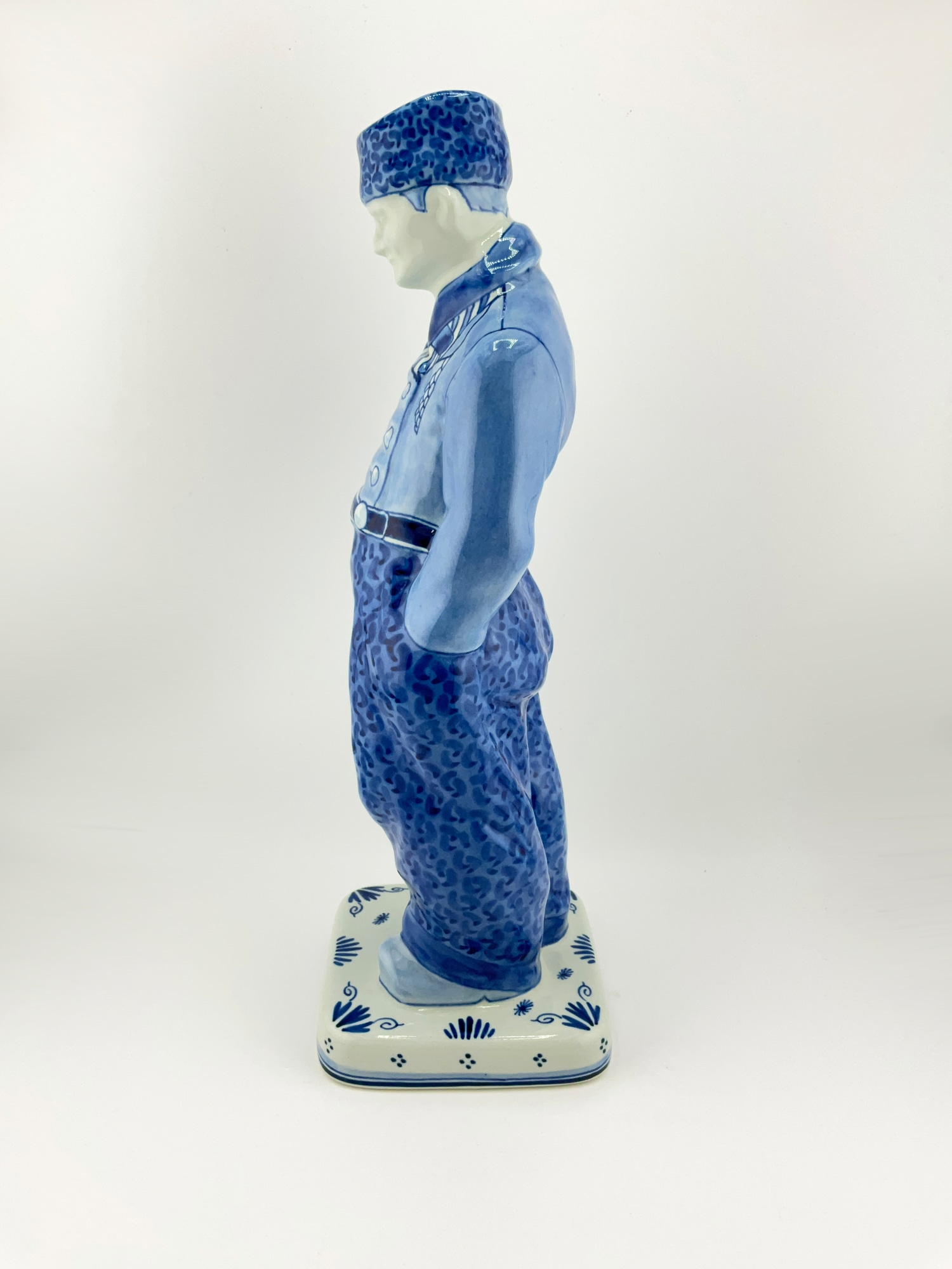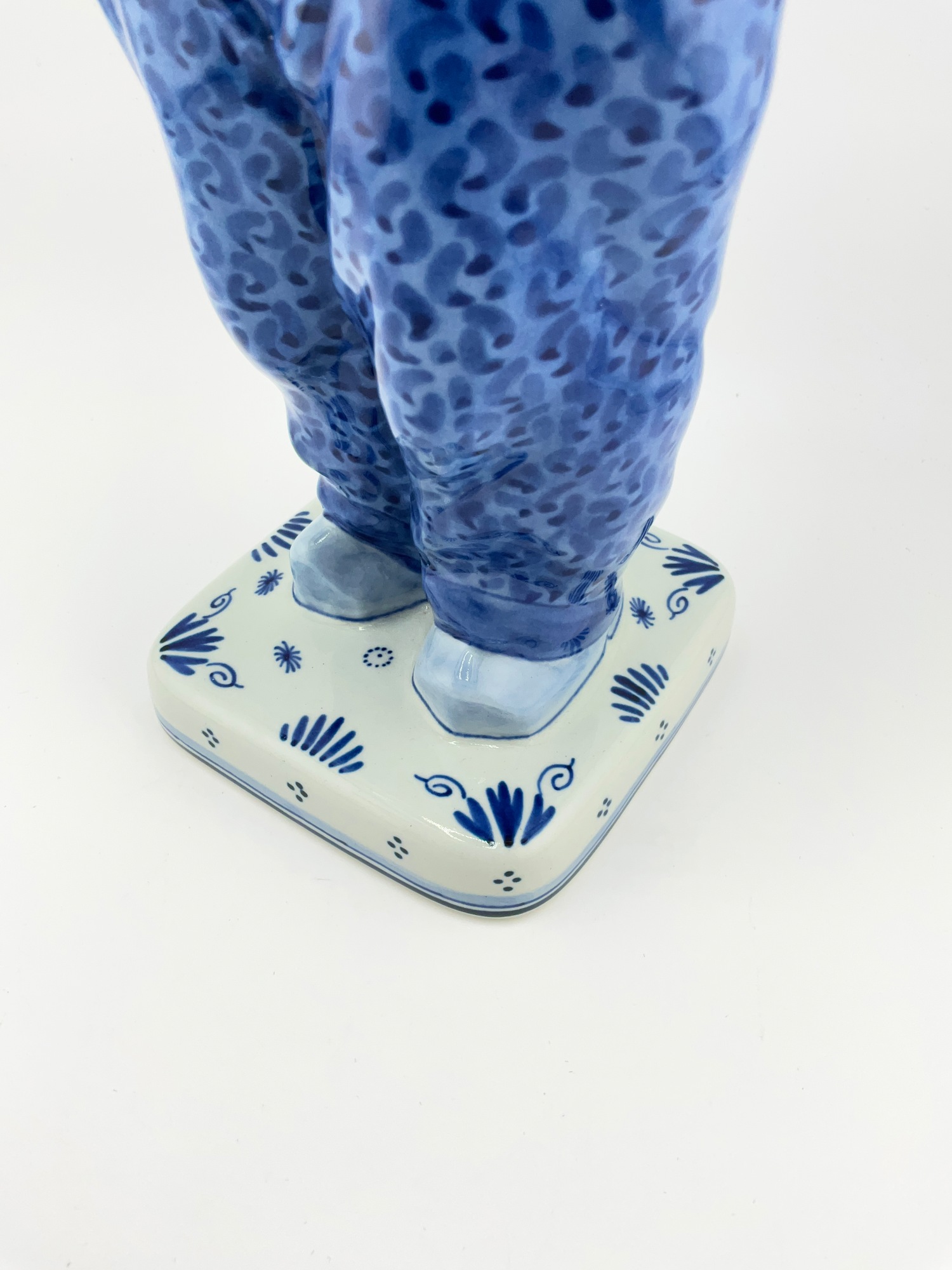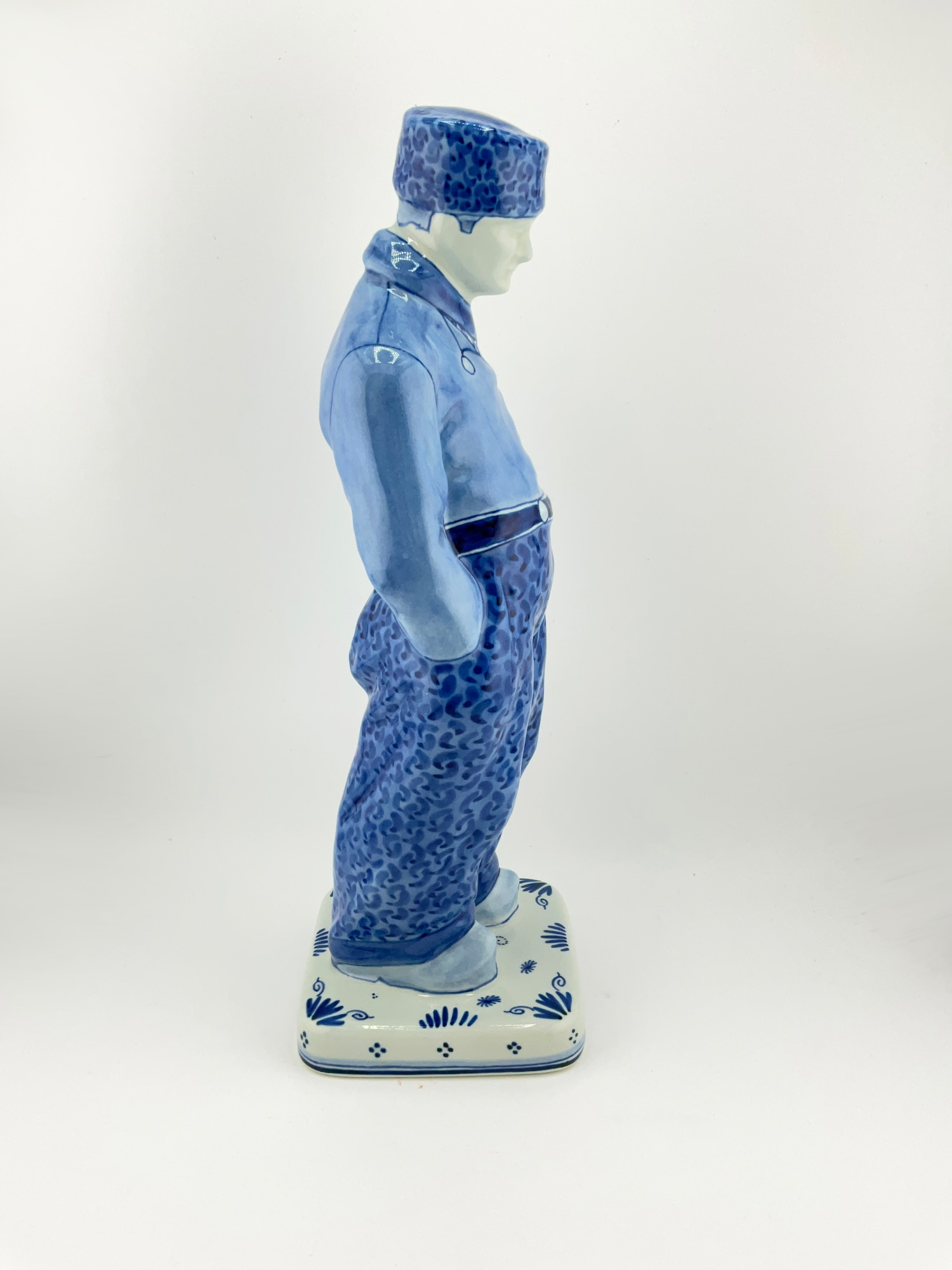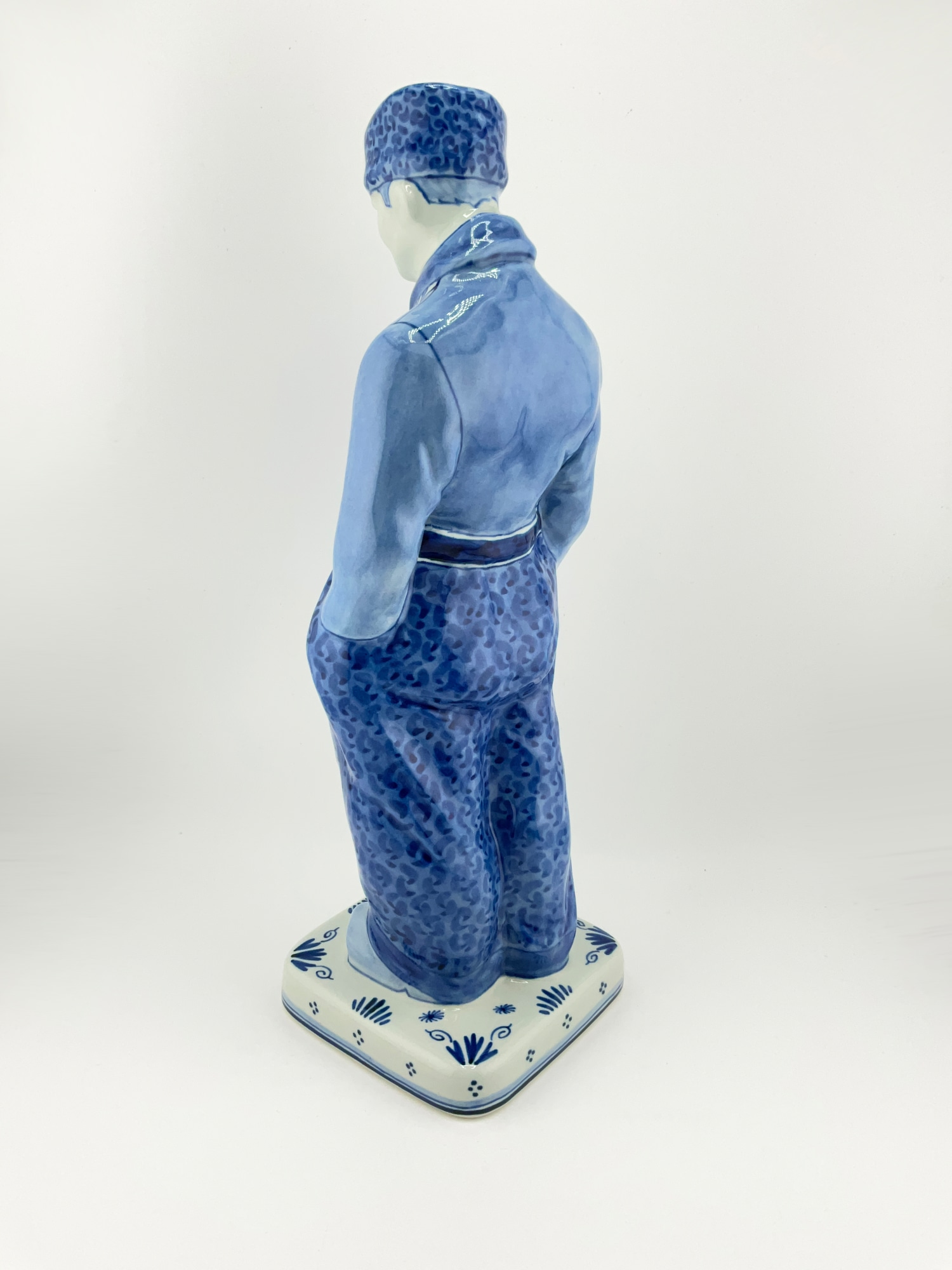 This beautiful handmade original figurine is a true piece of history. Made in the Netherlands by Royal Delft, it features a Dutch farmer with a glossy finish. The figurine is made of porcelain and ceramic, and stands at a height of 11.5 inches with a width of 3.75 inches. Marked on the bottom with the Royal Delft maker mark in blue with the artist's initials: SDR, and with the numbers: Delft DD. 5478. The artist's initials is that of S. Driessen who was employed at DPF from 1975. The DD alpha-date indicates production of 1984. It weighs 2 lb and comes unboxed.