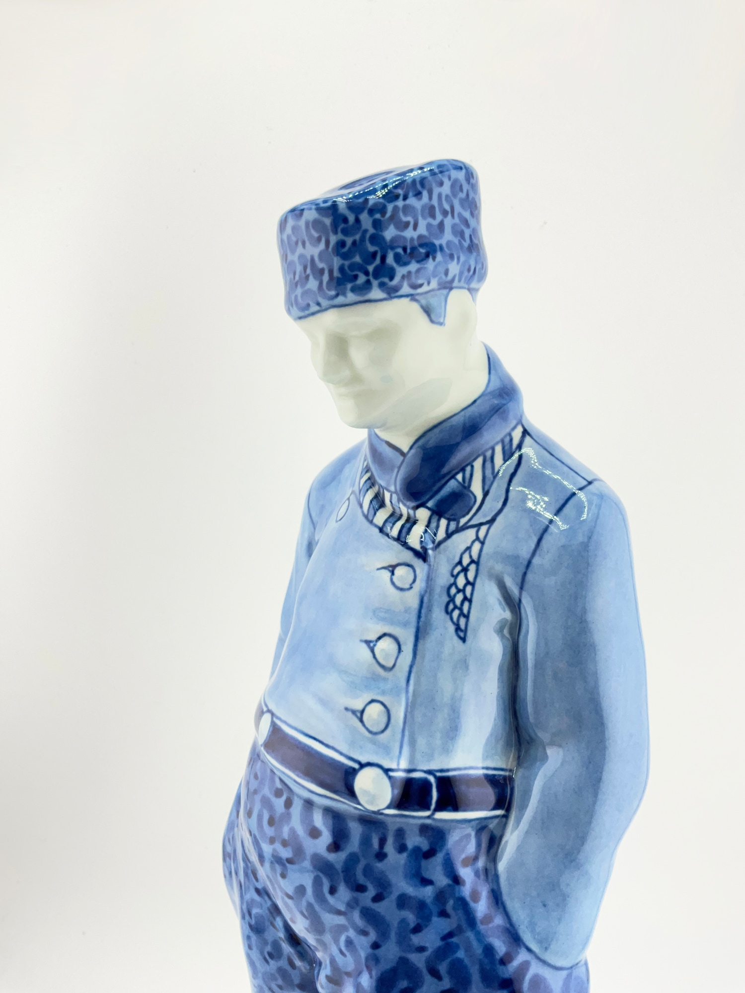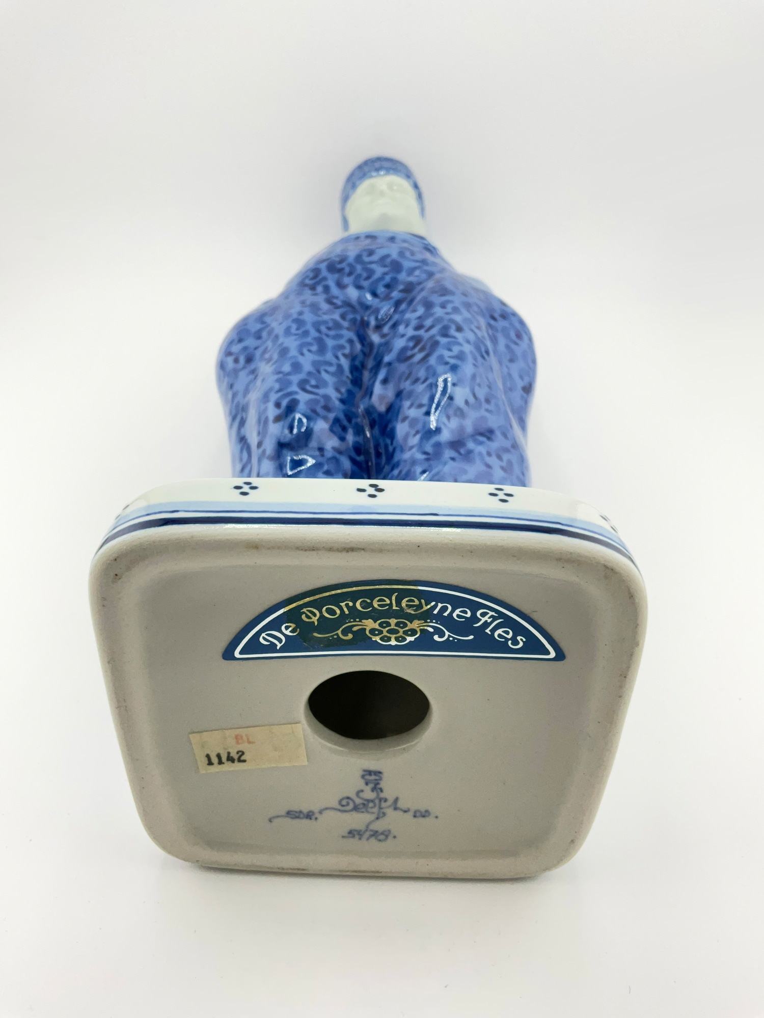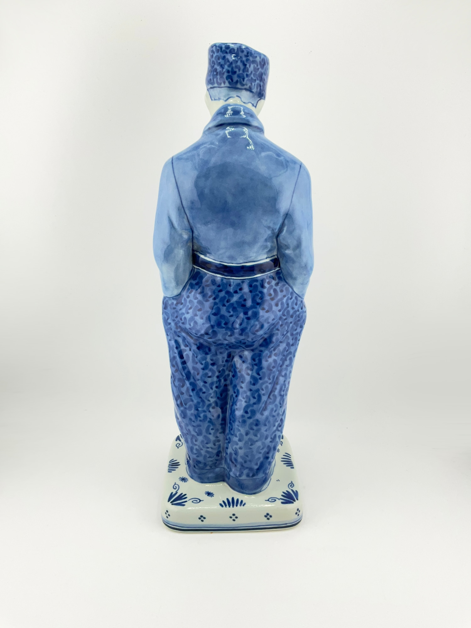 This beautiful handmade original figurine is a true piece of history. Made in the Netherlands by Royal Delft, it features a Dutch farmer with a glossy finish. The figurine is made of porcelain and ceramic, and stands at a height of 11.5 inches with a width of 3.75 inches. Marked on the bottom with the Royal Delft maker mark in blue with the artist's initials: SDR, and with the numbers: Delft DD. 5478. The artist's initials is that of S. Driessen who was employed at DPF from 1975. The DD alpha-date indicates production of 1984. It weighs 2 lb and comes unboxed.