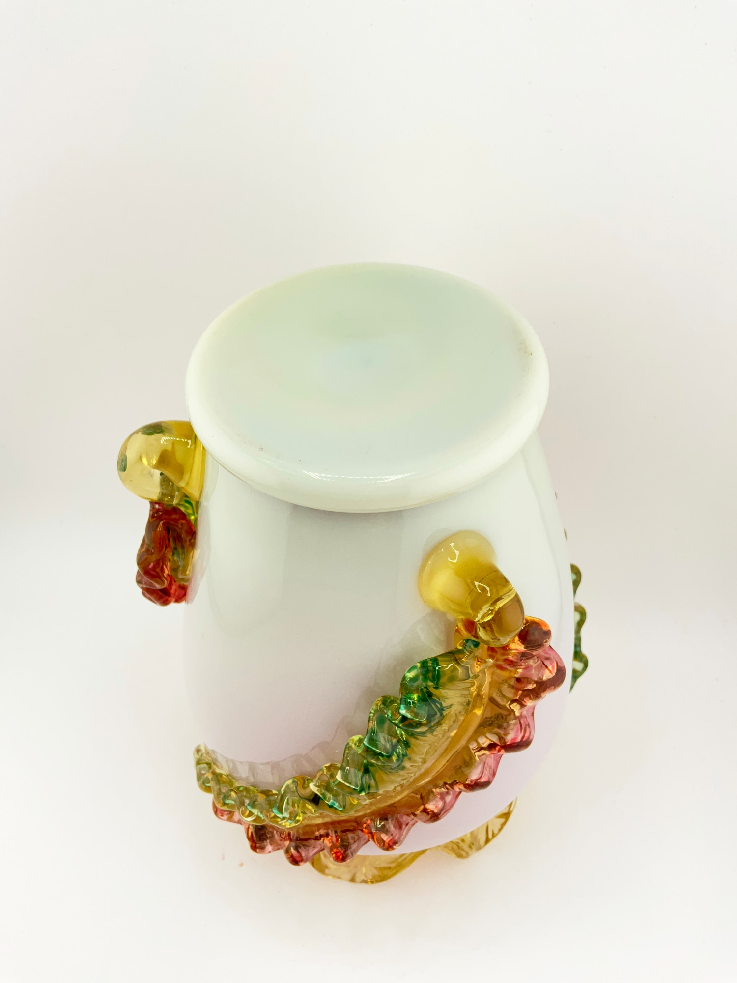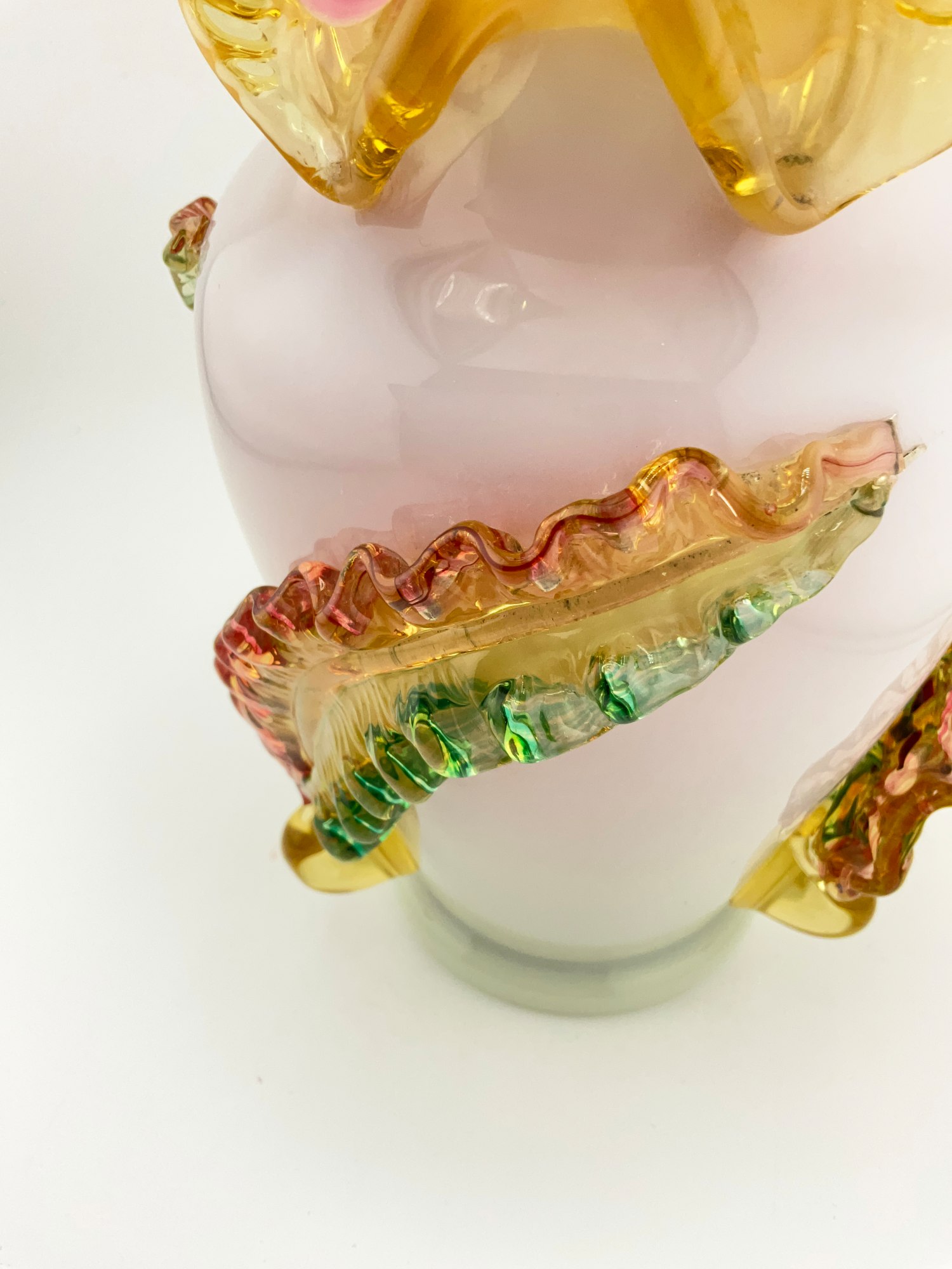 This beautiful oval-shaped vase is a stunning piece of art glass by Stevens & Williams. It features applied glass leaves intricately wrapped around the outer surface of the vase. Ruffle rim with pink glaze on the interior. Hand blown Milk Glass that glows under black light. The vase is small, measuring 5 inches in length and width, and standing at 7.5 inches in height, weighing 2 lbs.