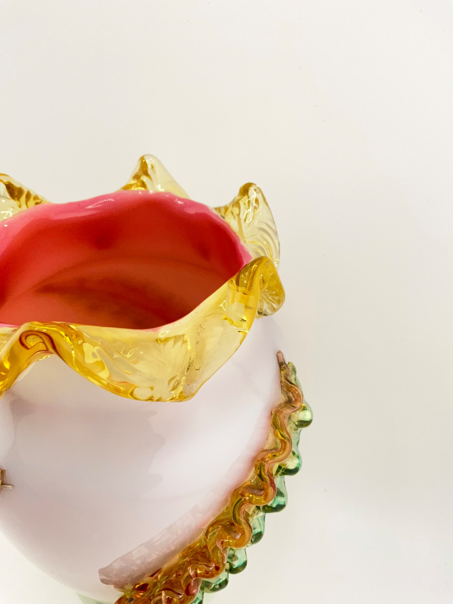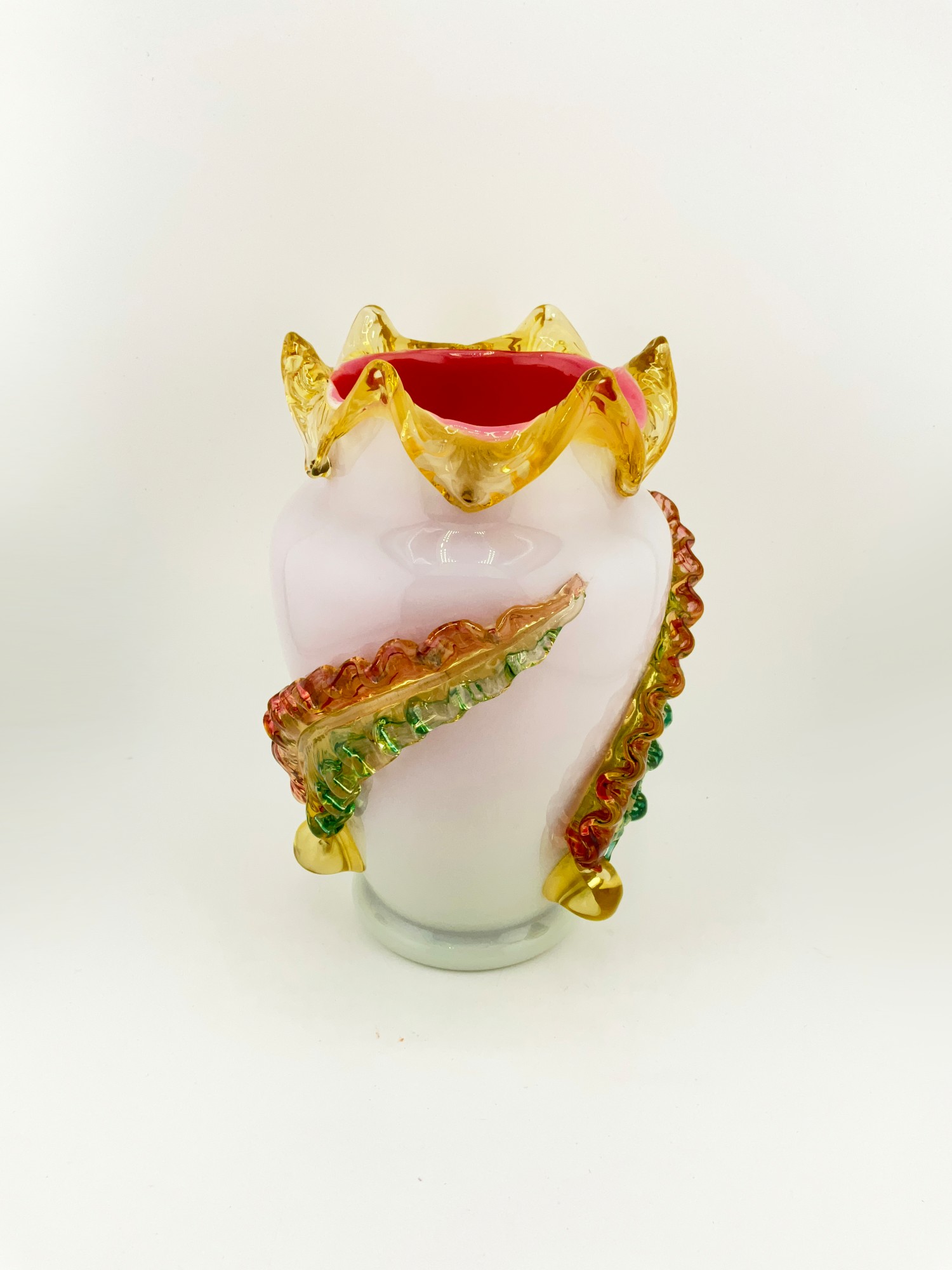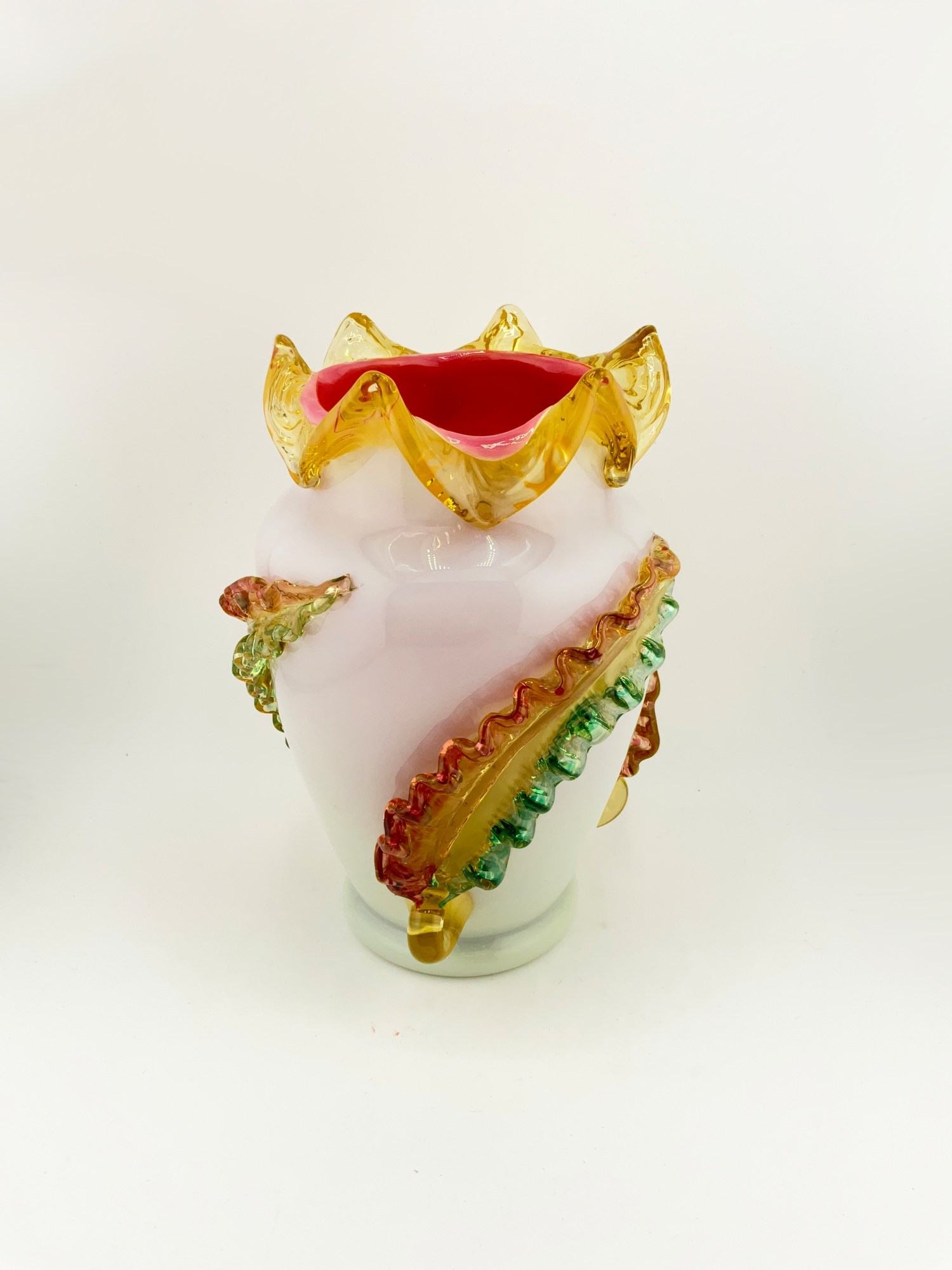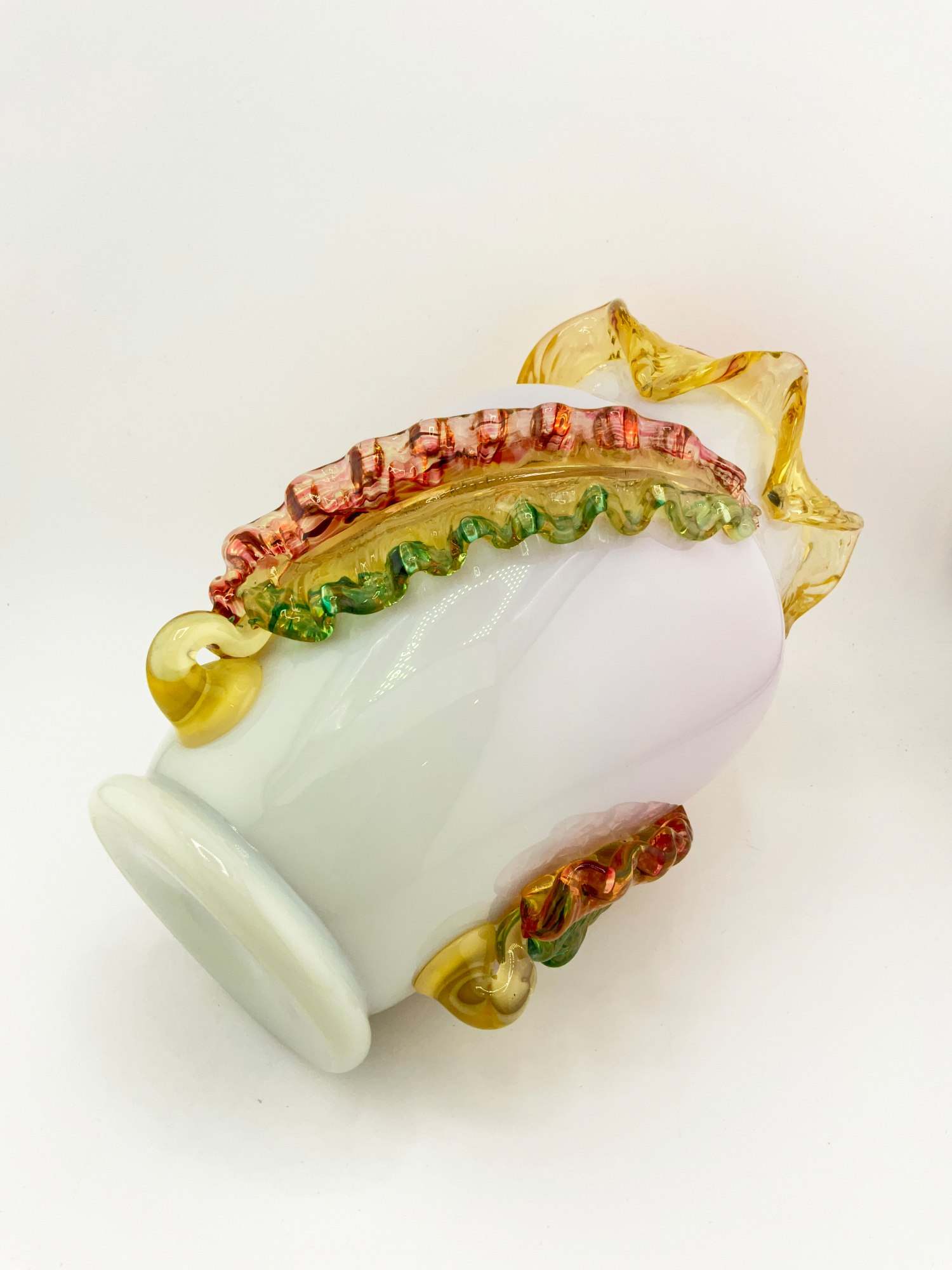 This beautiful oval-shaped vase is a stunning piece of art glass by Stevens & Williams. It features applied glass leaves intricately wrapped around the outer surface of the vase. Ruffle rim with pink glaze on the interior. Hand blown Milk Glass that glows under black light. The vase is small, measuring 5 inches in length and width, and standing at 7.5 inches in height, weighing 2 lbs.