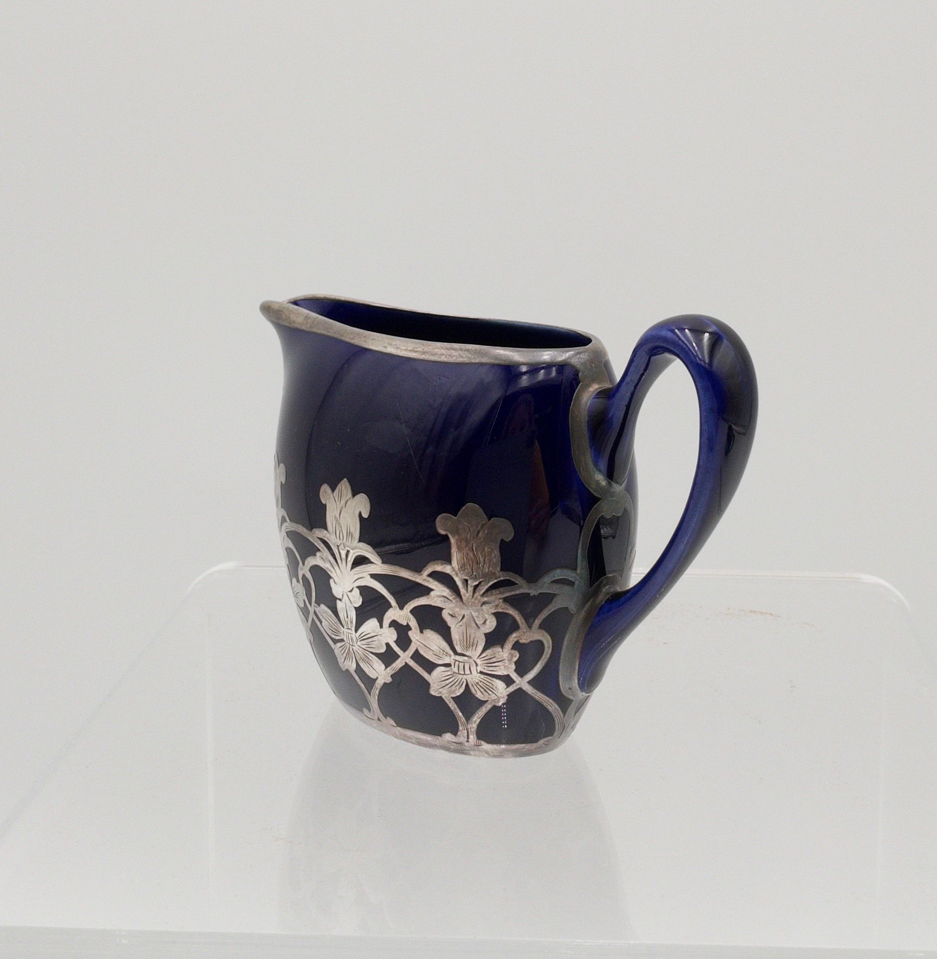 UNMARKED COBALT BLUE PORCELAIN WITH SILVER OVERLAY COFFEE/TEA POT & CREAMER SET