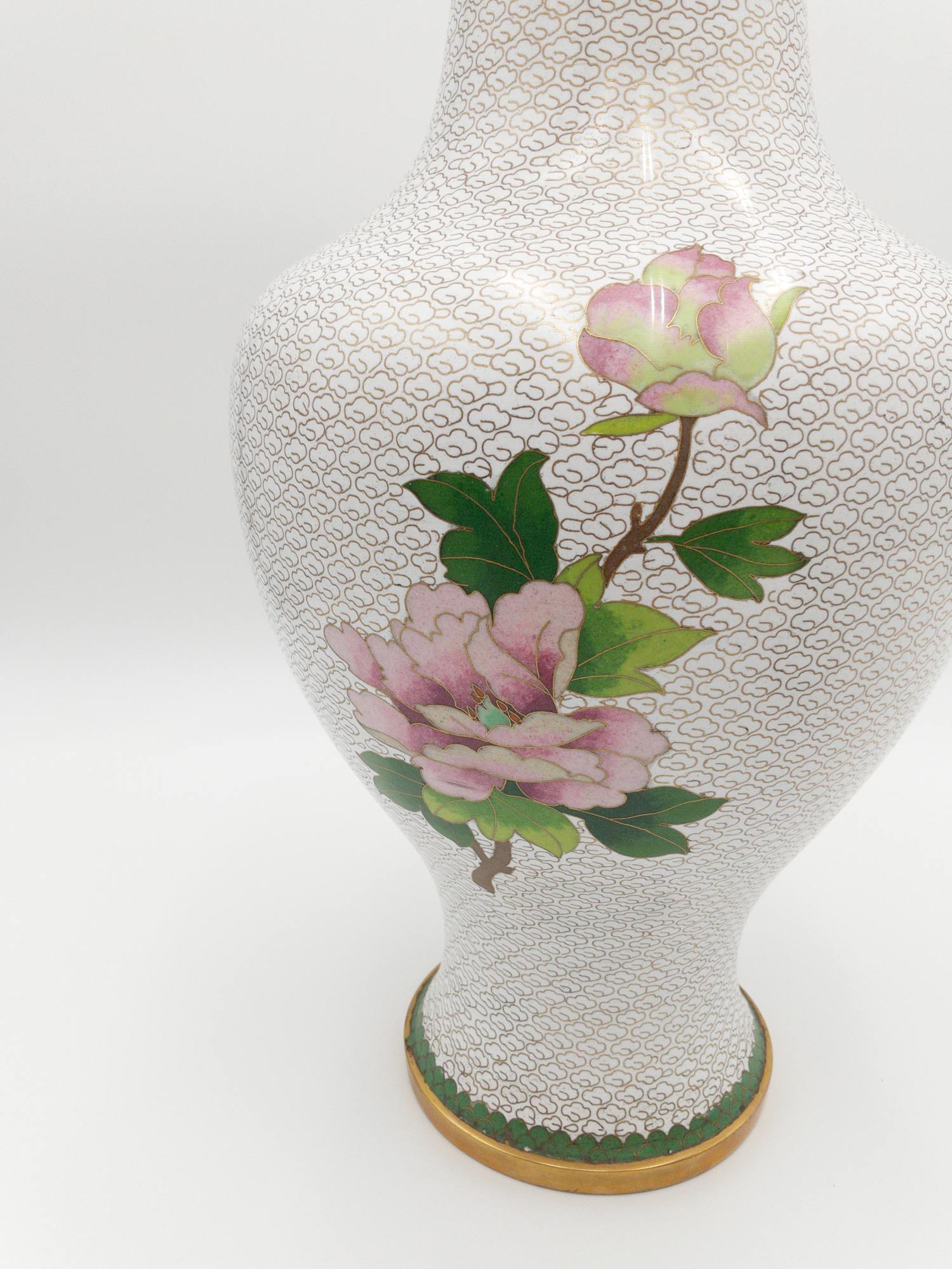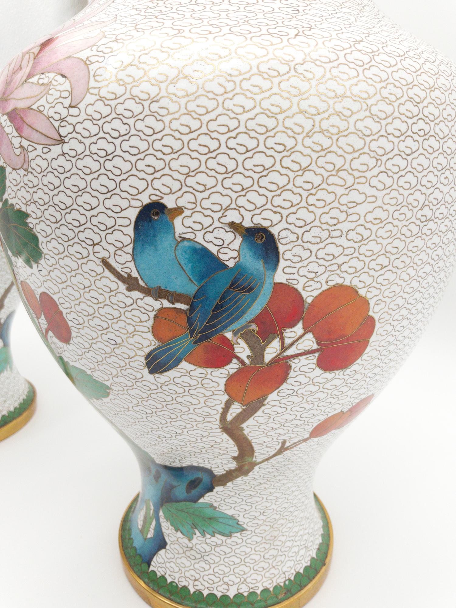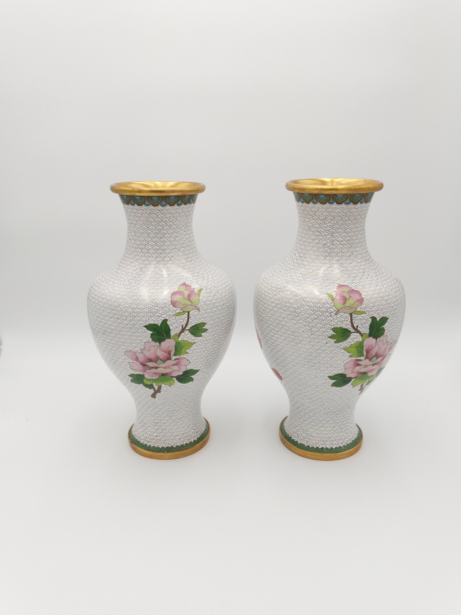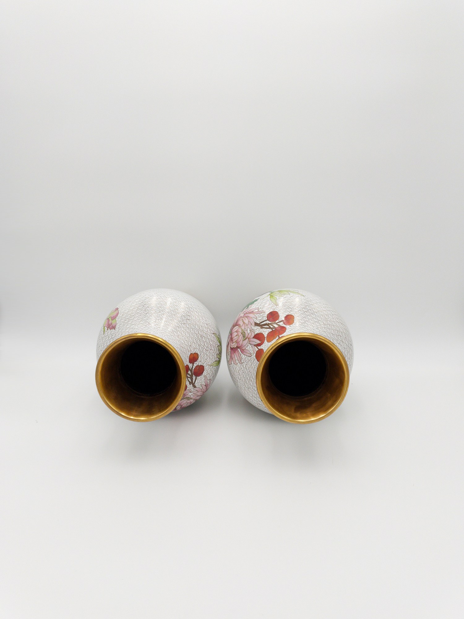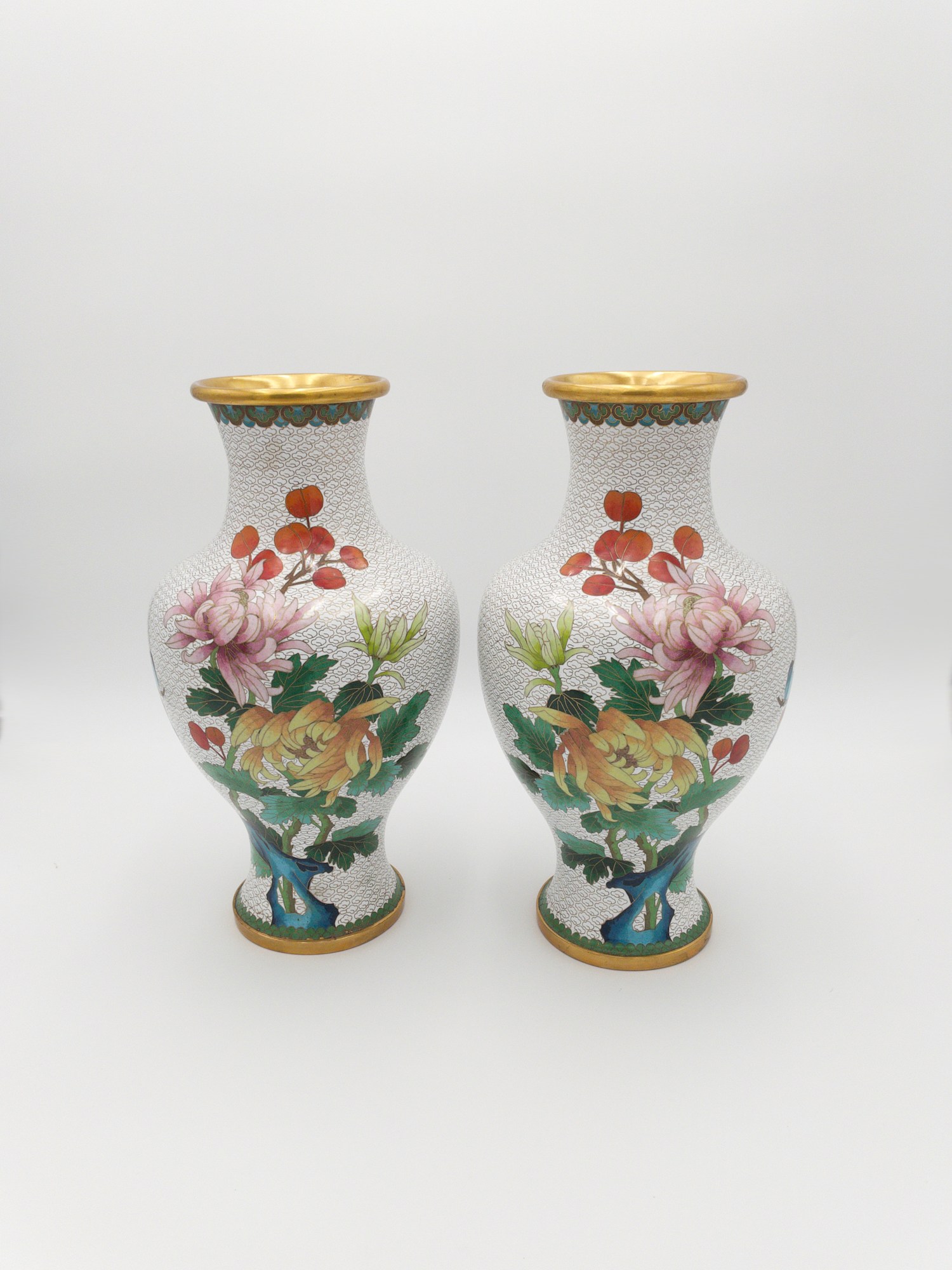 This pair of beautiful vintage Chinese vases features a stunning floral design depicting two love birds perched on a peach tree framed by chrysanthemum and peonies on a white cloisonne vase, The vase is an original piece, crafted in China post-1940 with mixed materials and a brass weight. It is a unit type piece and comes in a set of two. Each vase weighs 5.4 lbs and a height of 15.5 inches with a width of 8.5 inches. The diameter of the lip measures 5 inches. The vase comes with two wooden stands which are perfect for any decorative purpose. The vase is perfect for anyone looking for a unique and exquisite decorative item.
