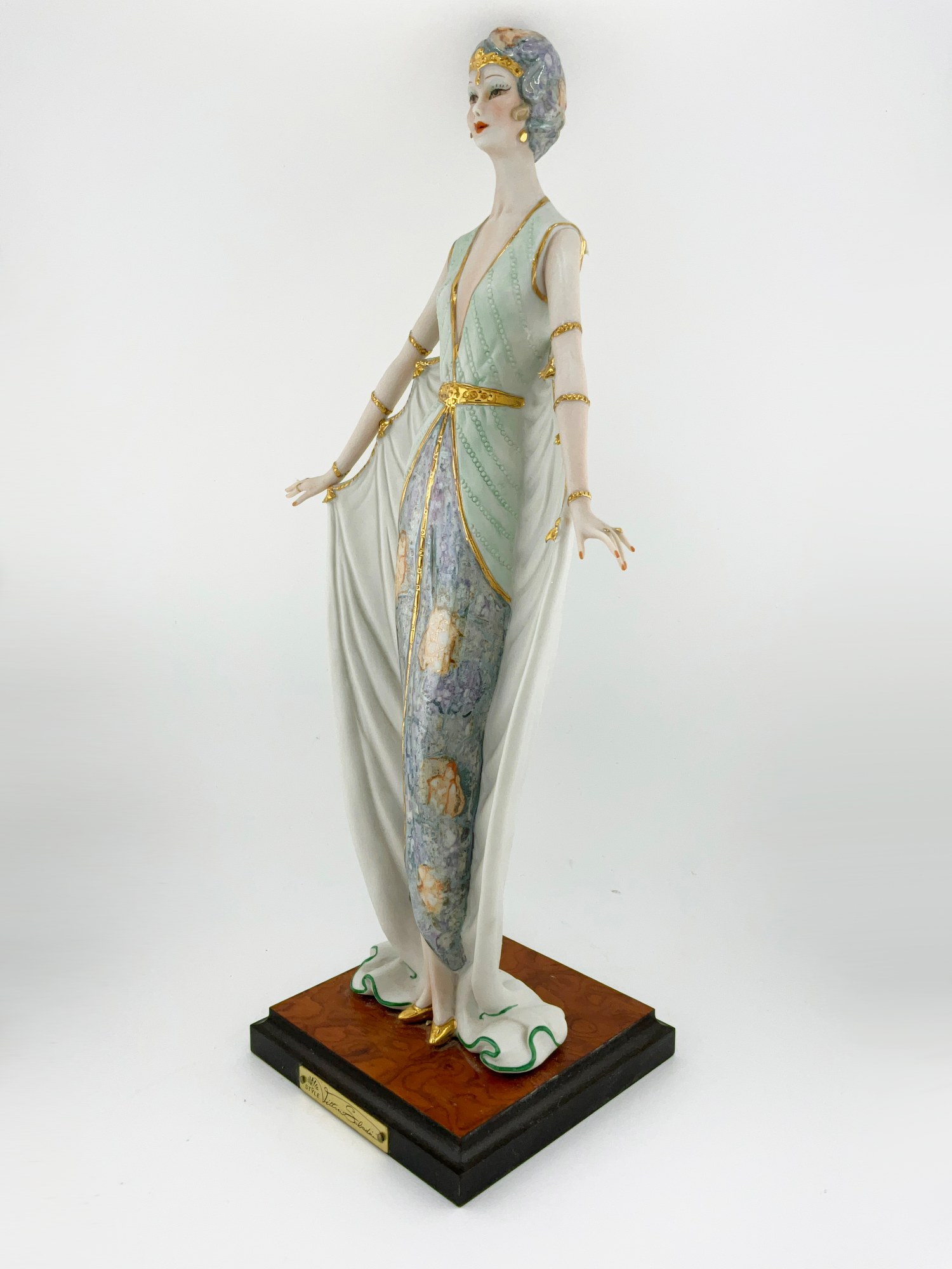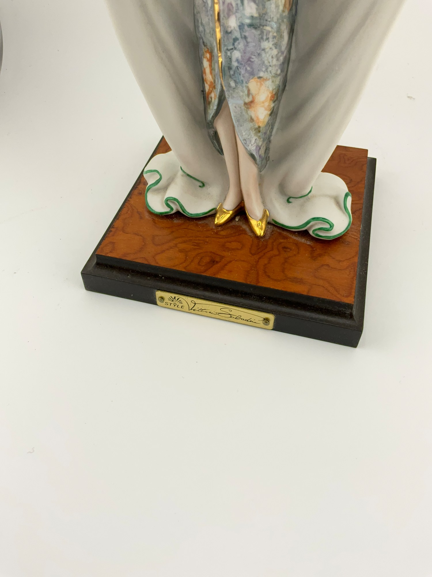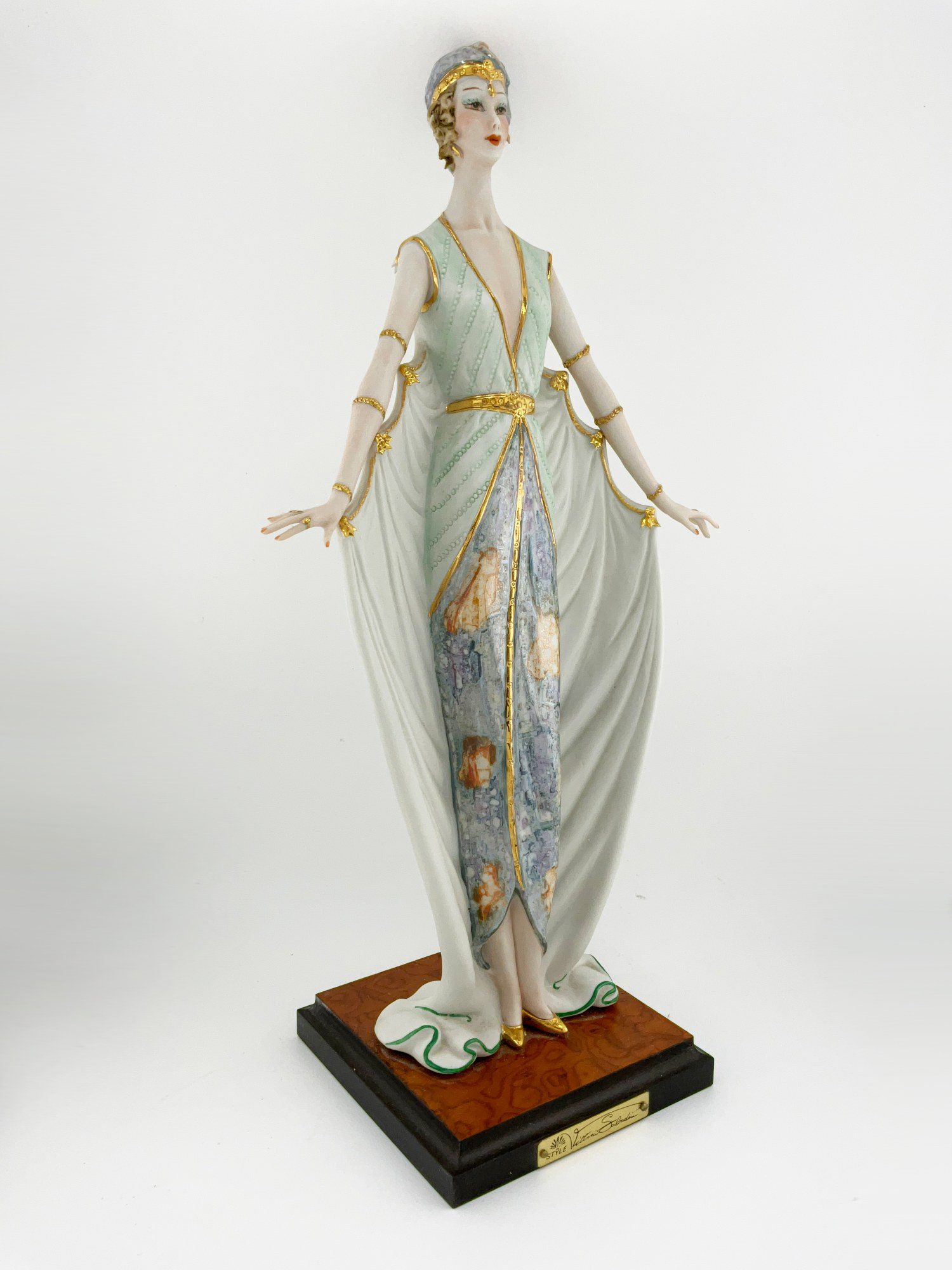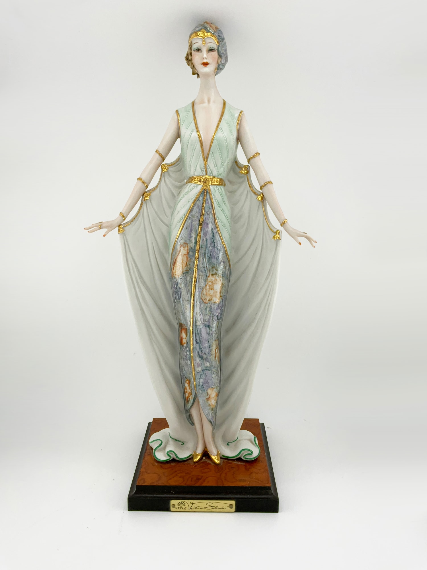 Add a touch of elegance to your decor with this beautiful Vittorio Sabadin Capodimonte Porcelain Figurine. The stunning Art Deco design features a woman in a floral print gown, light blue hat, red fingernails and gold accents throughout. The figurine is fixed to a square wooden base with a gold plate signed: Vittorio Sabadin. This rare piece was crafted in Italy around 1988. The figurine measures 14.5 inches in height and 7 inches in width. The wooden base measures 4.75 inches x 4.75 inches. The intricate details and exquisite design make it a wonderful decorative collectible for all occasions. Don't miss your chance to own this unique piece of art.